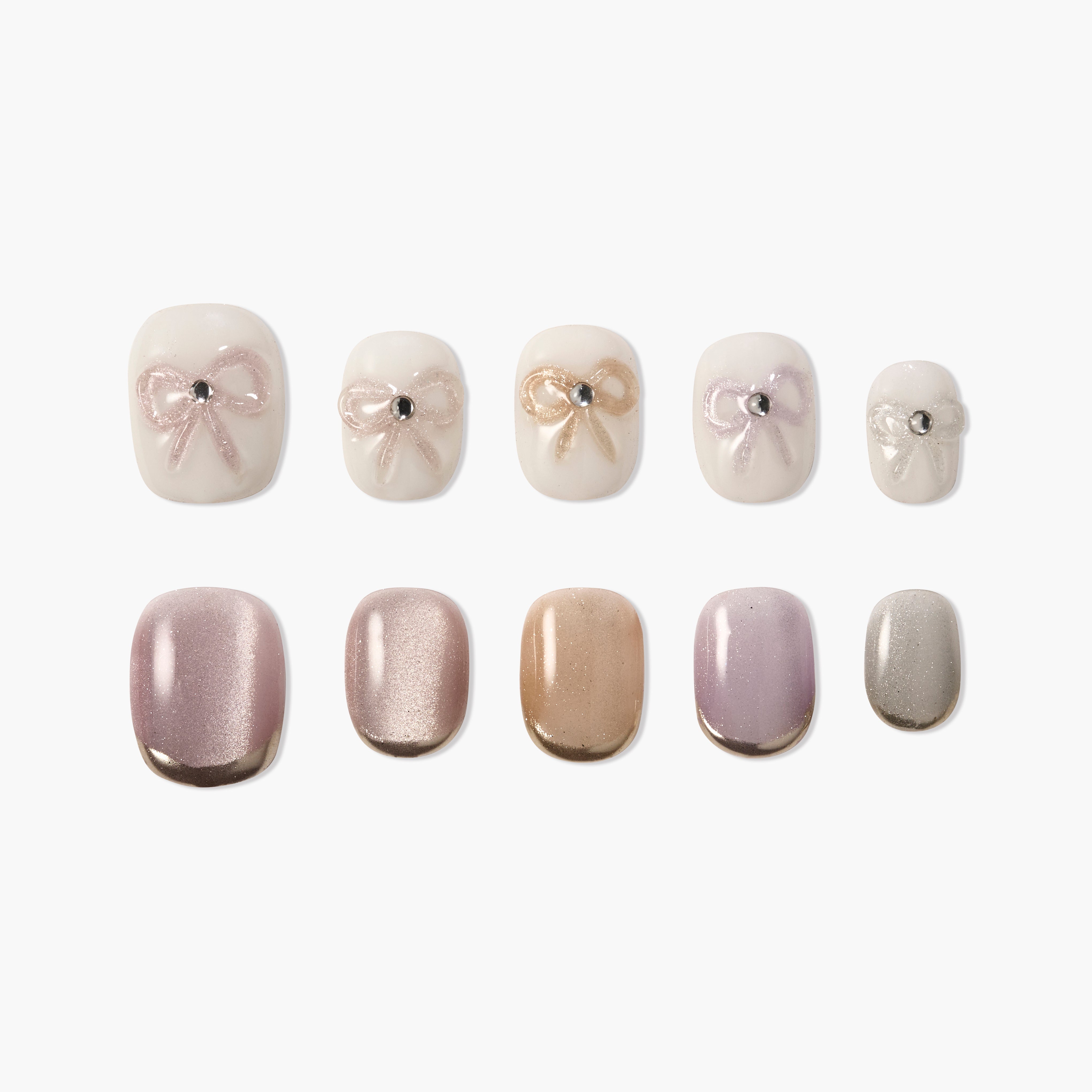 Pastel Ribbon Charm features soft creamy white bases topped with delicate 3D ribbons and a small crystal accent. Paired with subtle gradient squares in mauve, beige, lilac, and mist grey, this set creates a gentle and feminine look. The combination of sculpted bows and elegant pastel tones makes it perfect for everyday wear or a refined, romantic style.