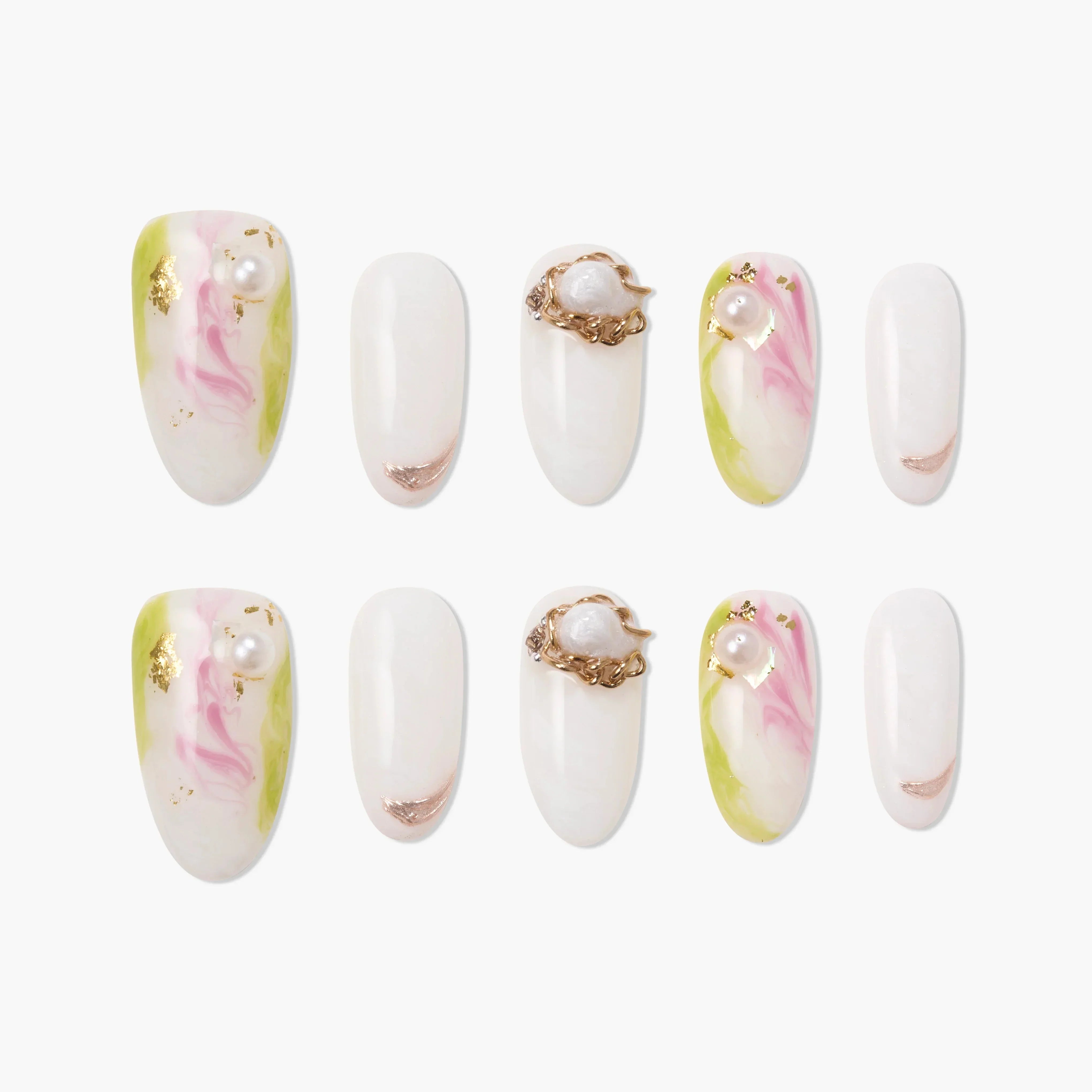 Pearl Garden Whisper is a handmade press-on nail set inspired by a quiet spring garden in bloom. Soft ivory bases are layered with delicate pastel marble swirls in pink and green, accented by luminous pearls and subtle touches of gold foil. The design feels airy, refined, and effortlessly elegant, balancing artistic detail with clean negative space. Perfect for weddings, brunch dates, vacations, or everyday wear with a polished finish, this set delivers a light luxury aesthetic without feeling heavy. Each nail is carefully handcrafted for a smooth fit, lasting comfort, and a reusable, salon-quality finish. The final product matches the images exactly—and in person, the pearl glow and color transitions appear even more delicate and refined.