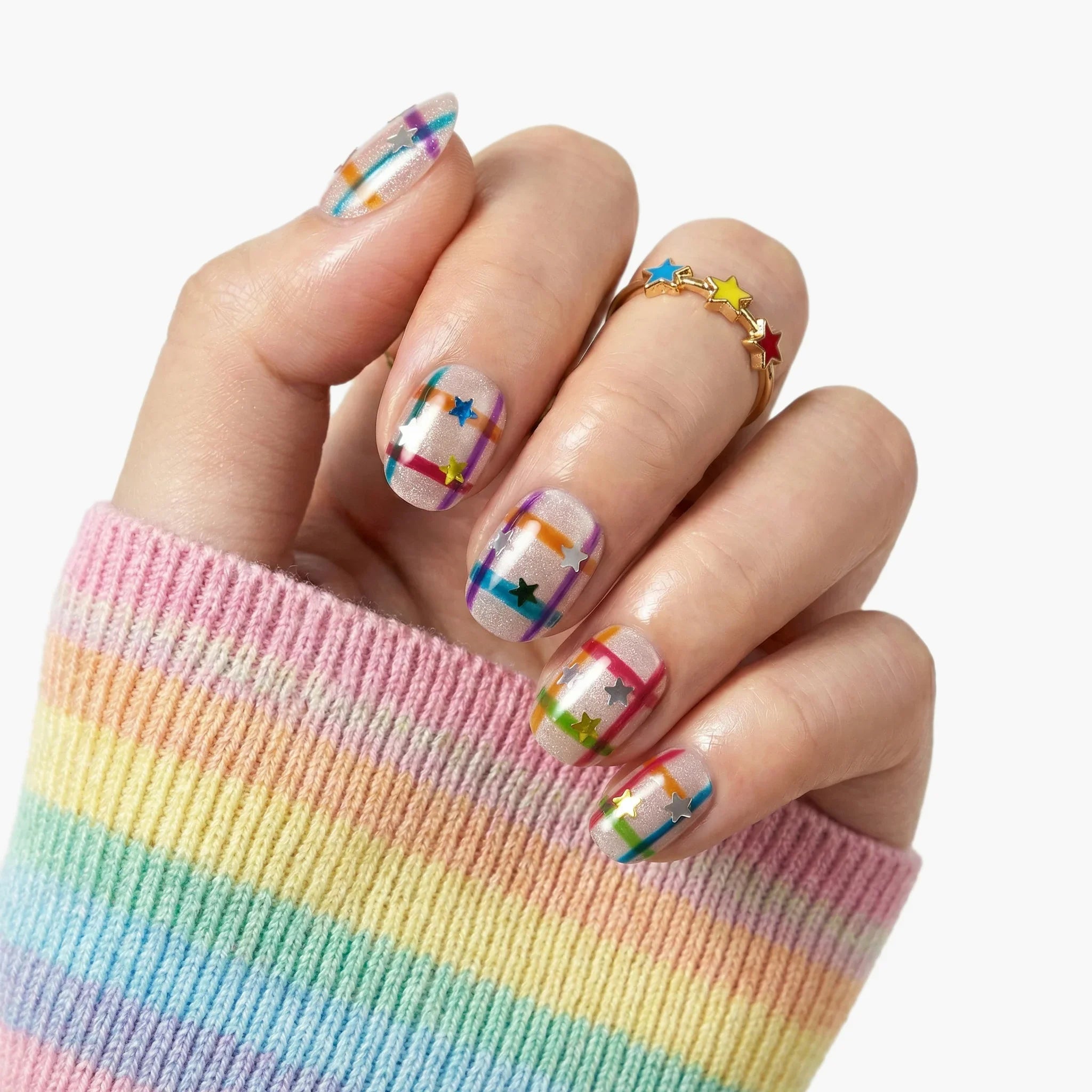 Plaid Star Glow is a handmade press-on toenail set featuring colorful plaid stripes and playful star accents. The glossy nude base adds shine while vibrant rainbow lines keep the look fun and eye-catching. Lightweight, durable, and easy to apply—salon-quality nails ready in 10 minutes.