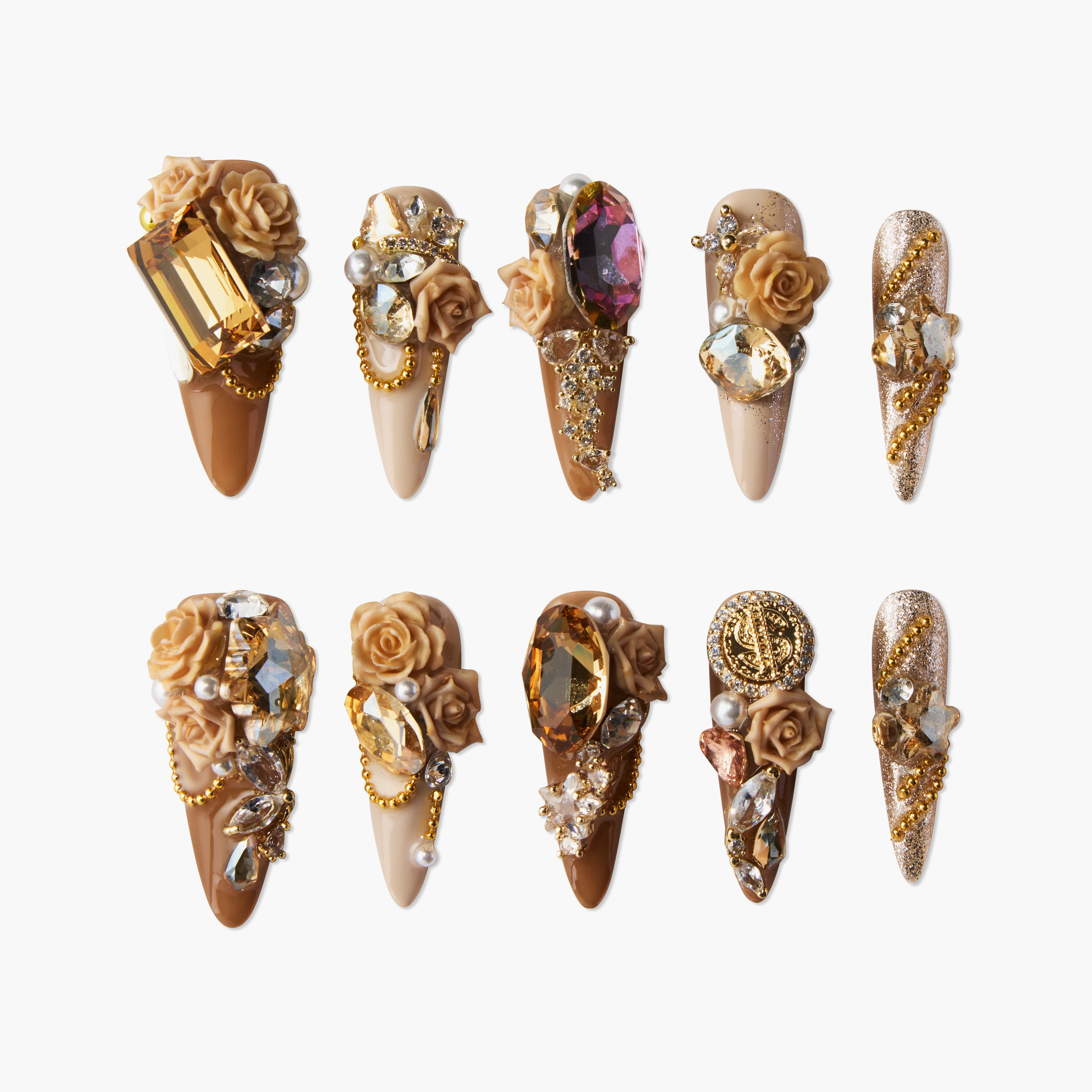 Regal Rose Opulence is a luxurious and romantic nail set inspired by vintage royal aesthetics. Each nail is adorned with intricate 3D roses, opulent gemstones, and delicate gold chains, creating an atmosphere of elegance and grandeur. The creamy and golden-brown base colors are complemented by sparkling silver accents, perfect for those looking to showcase a sophisticated and noble style. Ideal for weddings, parties, and special occasions, this nail set ensures you'll be the center of attention, radiating an aura of regal charm.
