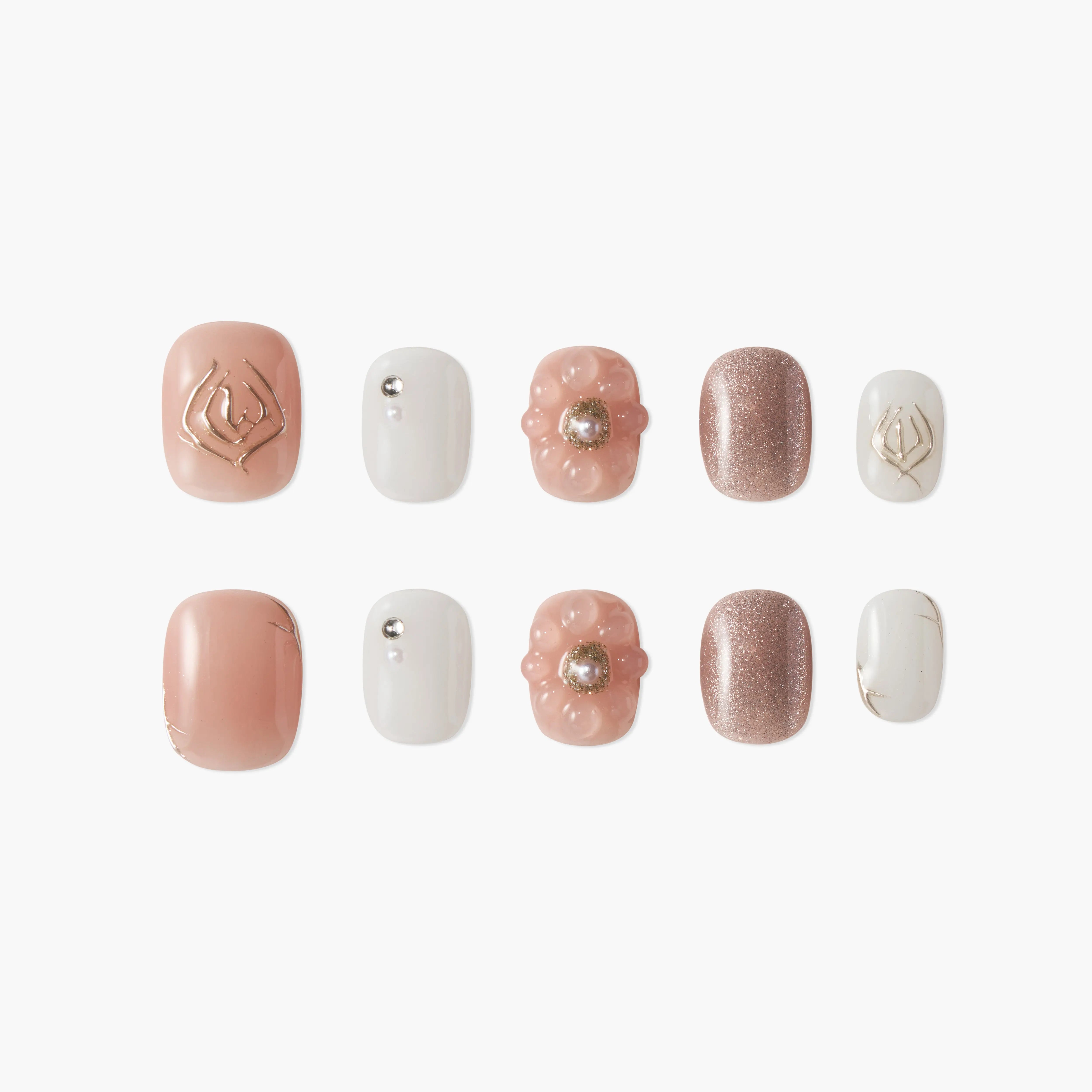 Rose Blossom Elegance set features a delicate blend of soft pink, white, and rose gold. Elegant floral designs with pearl accents add a graceful touch to your nails, while the sparkling finish brings a sophisticated glow. This set exudes femininity and charm, perfect for both casual and formal occasions.