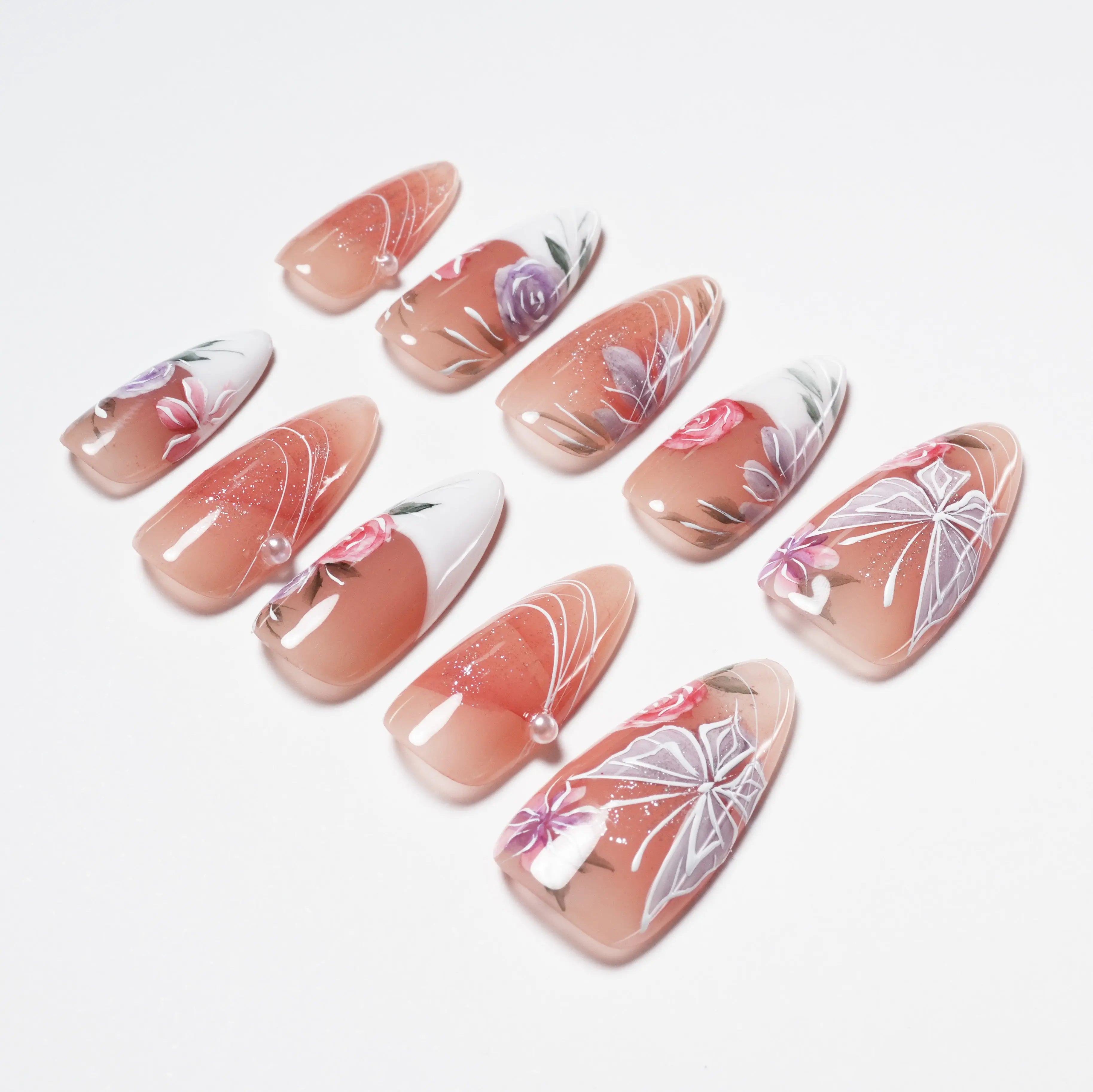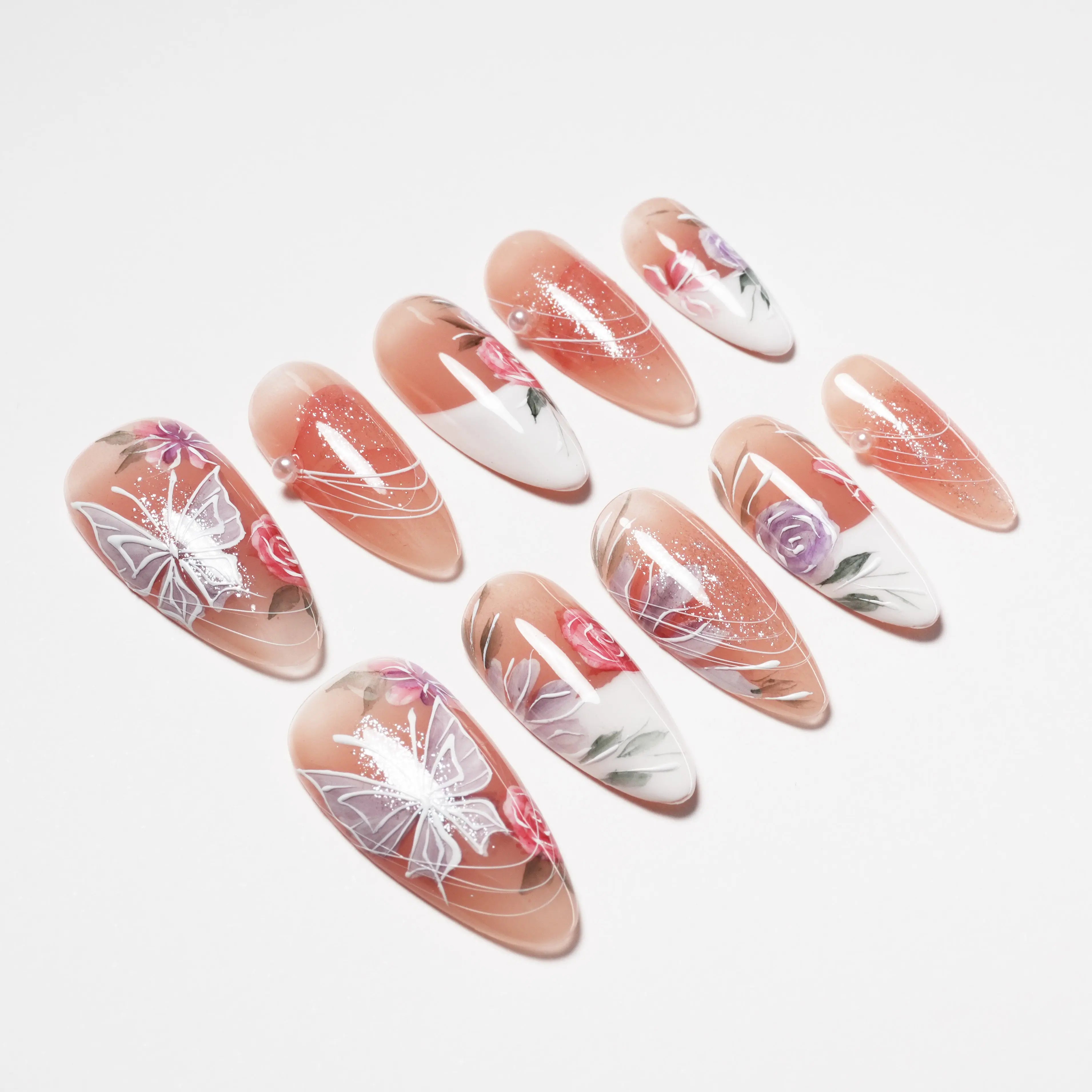 The "Rose Dance" press-on nails feature romantic rose patterns and exquisite butterflies, with soft nude tones and delicate floral designs complementing each other, showcasing a gentle and elegant aura. The hand-painted roses and intricate line accents on each nail evoke a sense of roses dancing on your fingertips, offering a fresh and romantic visual effect. Perfect for any occasion, highlighting your gentleness and confidence.