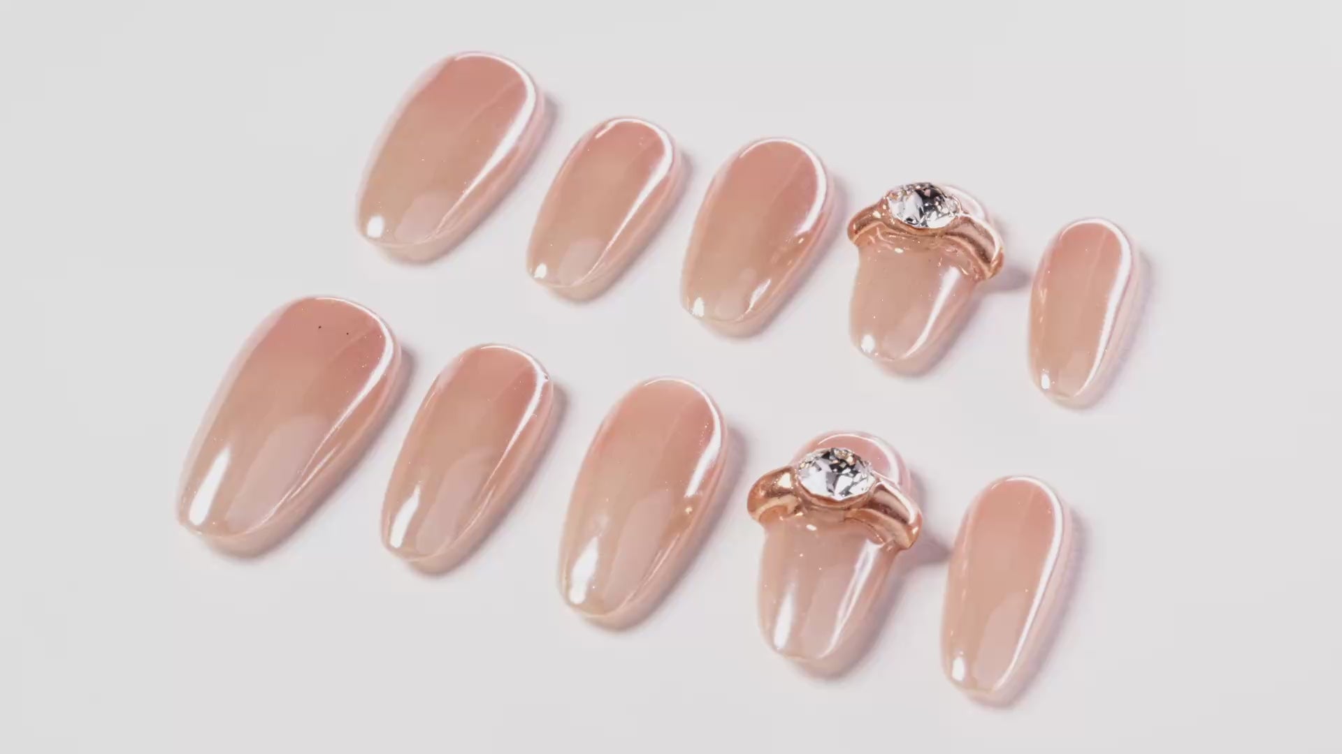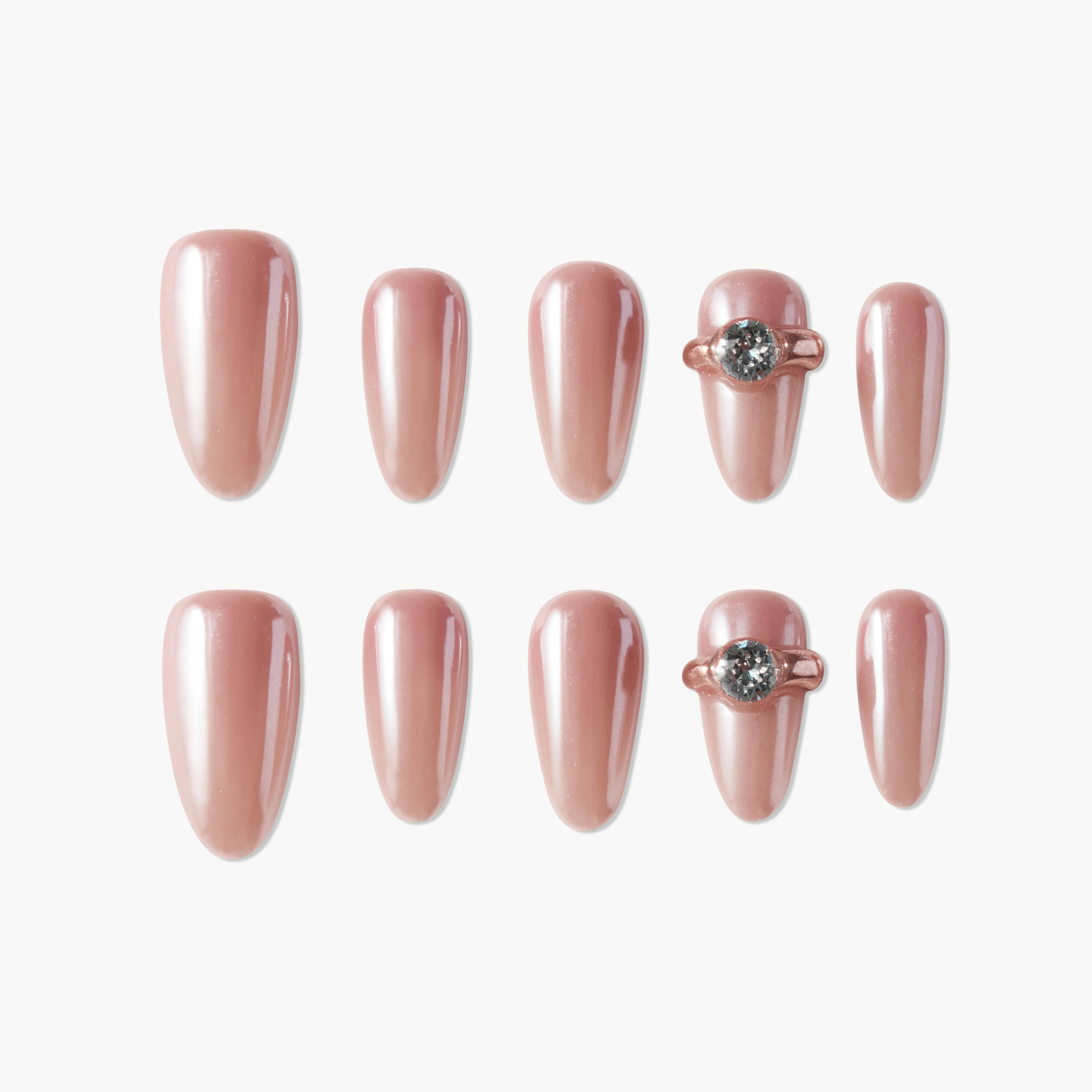 Rose Quartz Grace nail set radiates soft sophistication with its gentle pinkish-pearl finish and sleek, polished design. The signature ring-inspired crystal accent elevates this design, symbolizing elegance and refined charm. Ideal for romantic evenings, engagement celebrations, or anytime you want a graceful touch.
