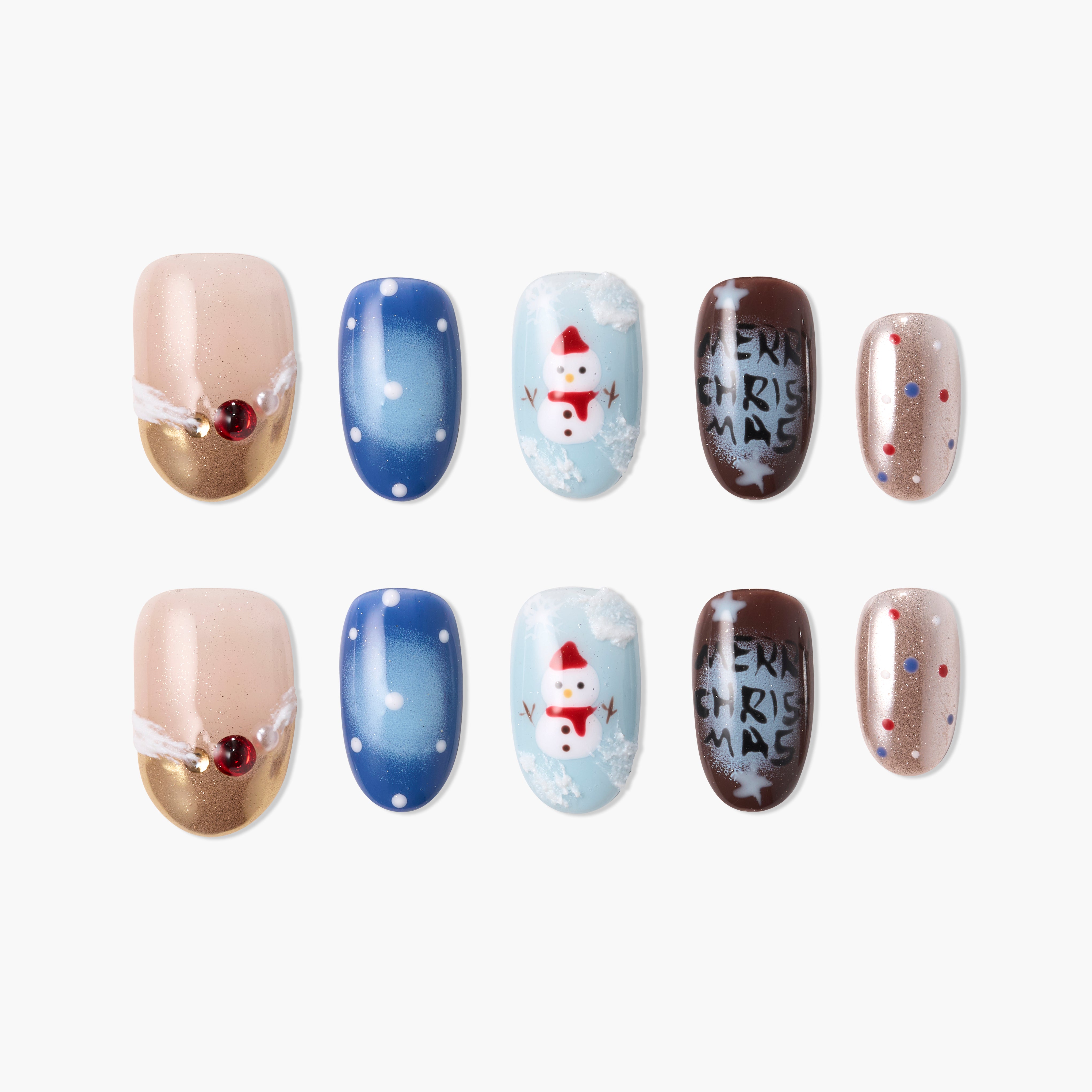 Snowy Christmas Night is a handcrafted press-on nail set inspired by a calm winter evening filled with soft snow and holiday glow. The design blends a gentle snowman, deep blue snowfall gradients, warm champagne shimmer, and playful “Merry Christmas” lettering for a cozy yet modern festive look. Each nail is carefully handmade by professional nail artists to ensure smooth finishes, balanced colors, and comfortable wear. The final product matches the images and often looks even more beautiful in person. Perfect for winter celebrations, holiday gatherings, or seasonal styling, these reusable salon-quality nails are ready in 10 minutes.