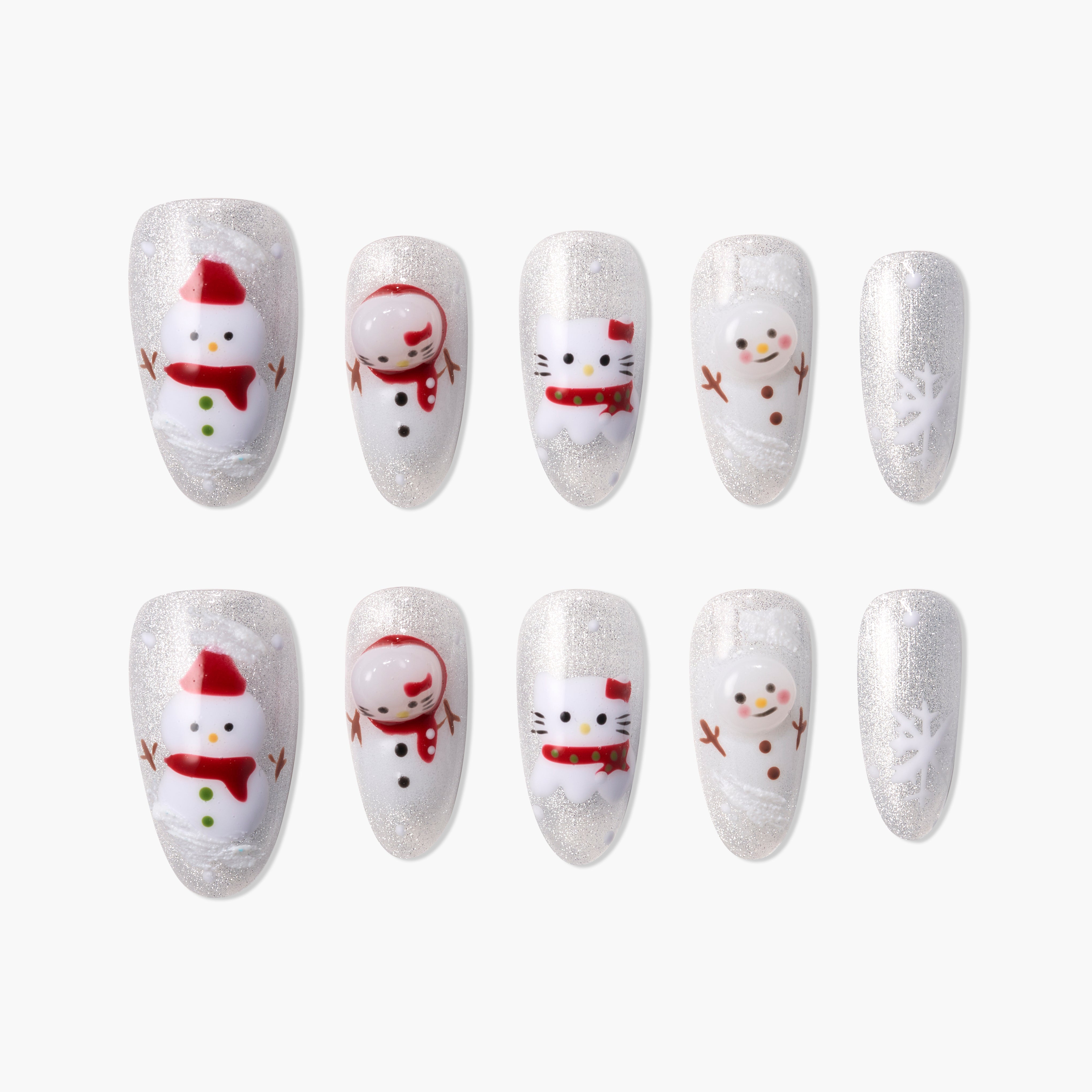 Snowy Friends Noel is a playful Christmas press-on nail set inspired by snowy winter mornings and adorable holiday characters. A soft silver shimmer base creates a frosted snow effect, while hand-painted snowmen and a festive Hello Kitty-inspired character bring warmth and charm to the design. Delicate snowflakes and subtle snow textures balance the cute elements, keeping the look joyful yet clean. Perfect for holiday parties or cozy winter days, this handcrafted set adds instant Christmas cheer—ready in 10 minutes.