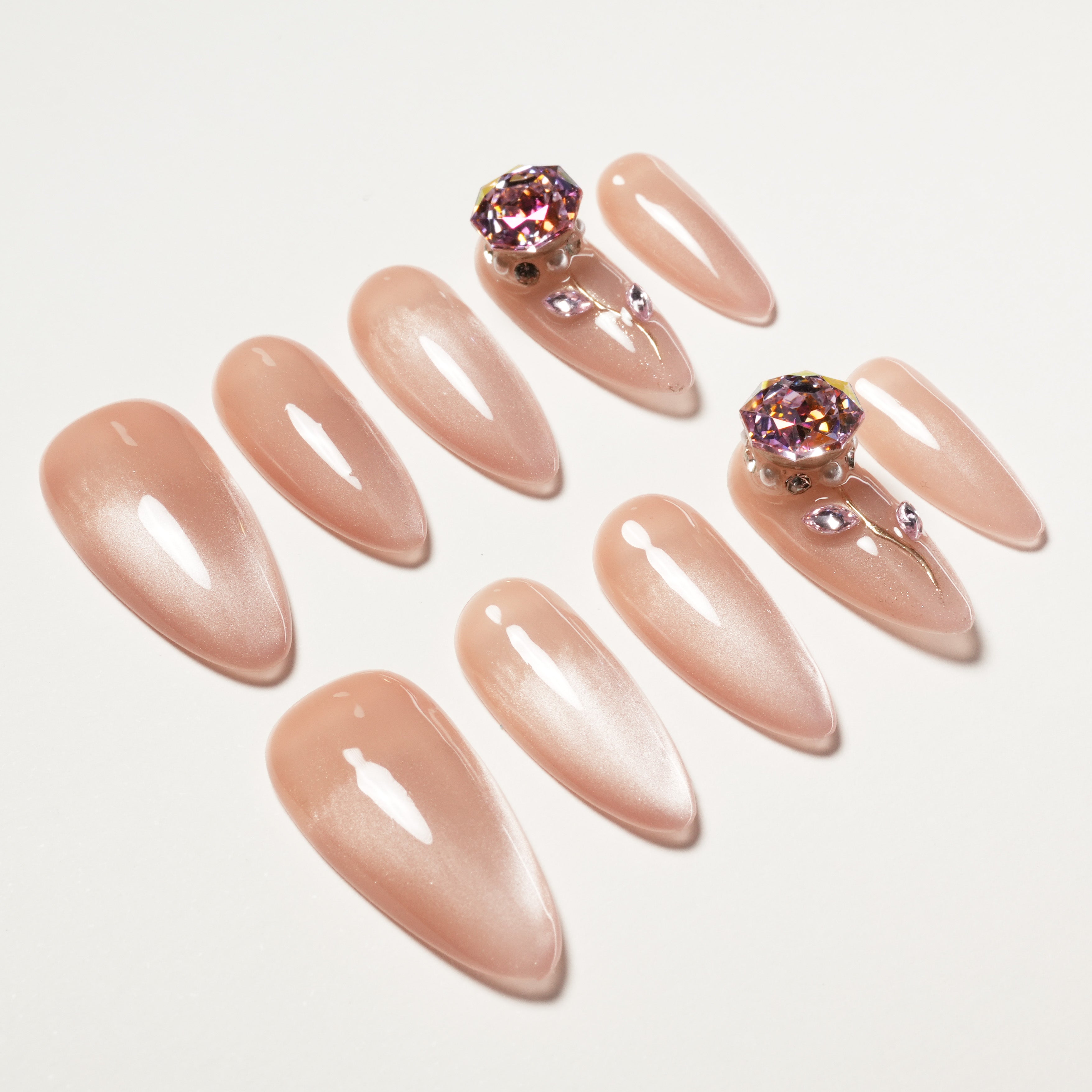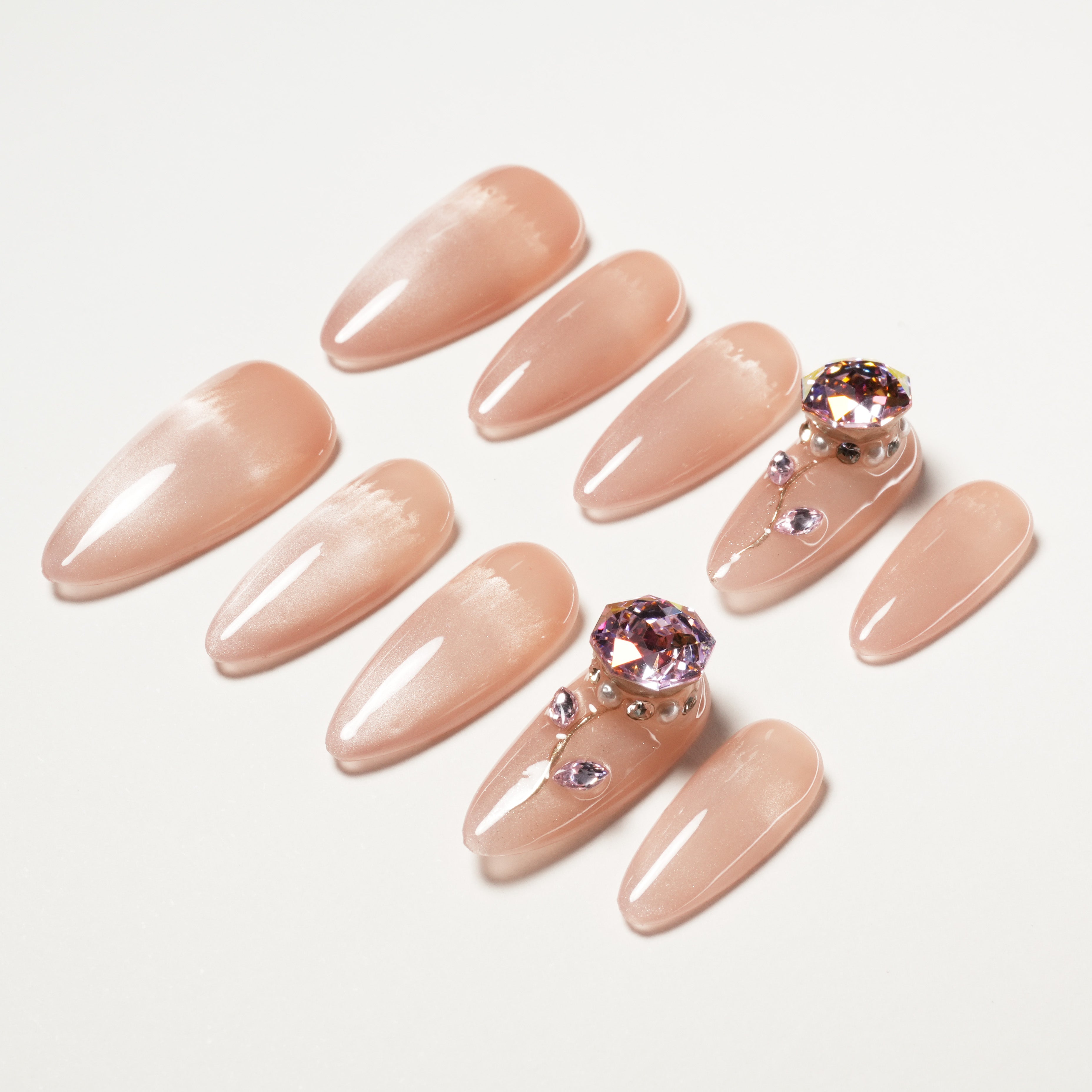 Emily’s Sparkling Bloom press-on nails feature a soft nude-pink gradient base, adorned with a large faceted pink-purple gem and teardrop crystals for an elegant, luxurious floral look. Made from premium materials for a secure, reusable fit—perfect for weddings, galas, and special occasions.