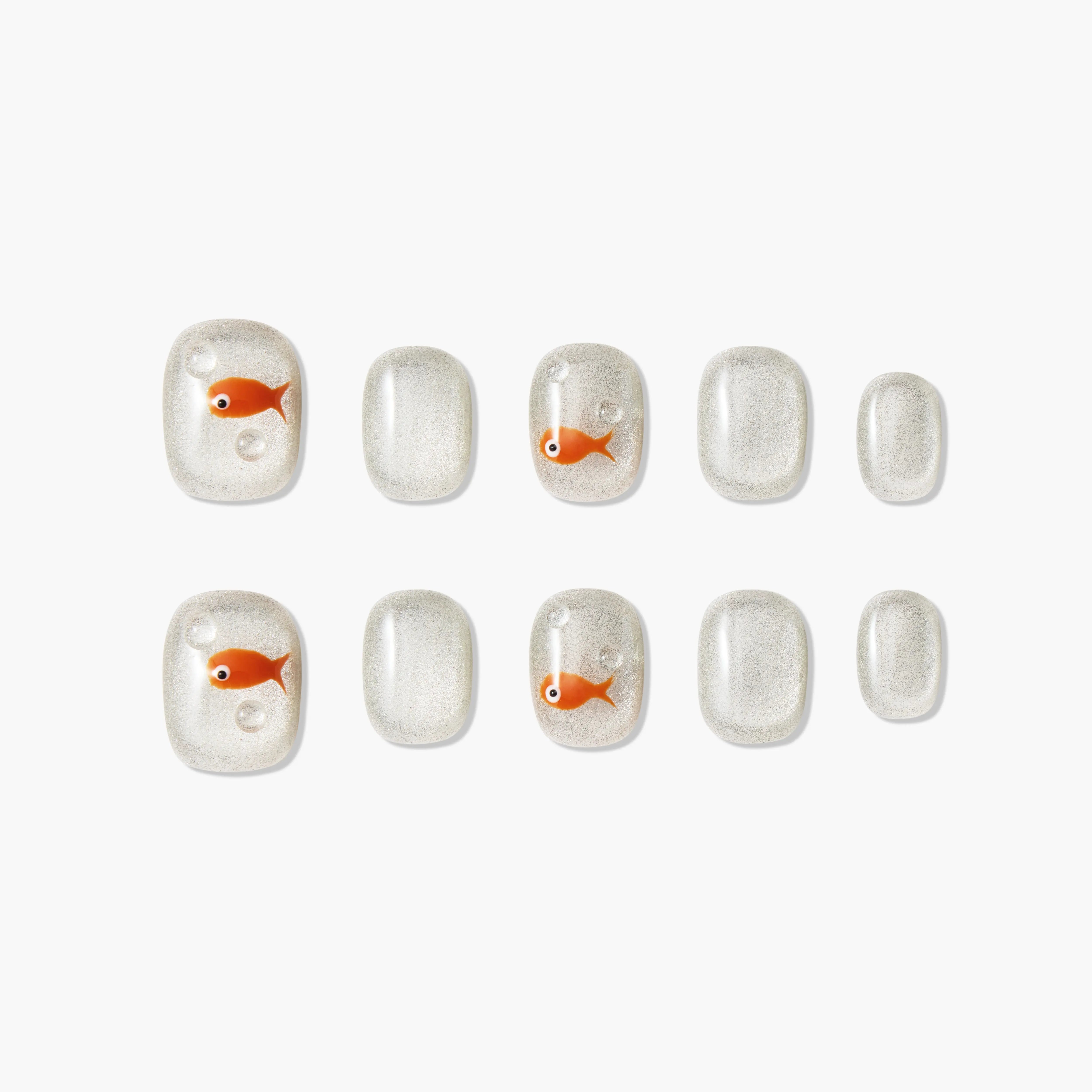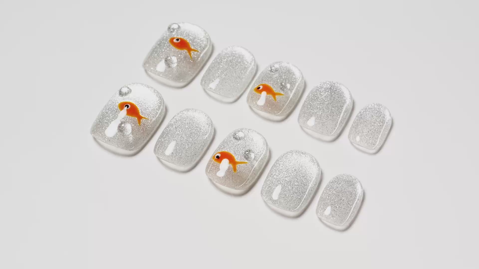 Sparkling Goldfish nails feature a dazzling silver glitter base, reminiscent of shimmering water under sunlight, adorned with adorable goldfish and bubble accents. This design combines elegance with playfulness, creating a unique and eye-catching manicure perfect for any occasion.