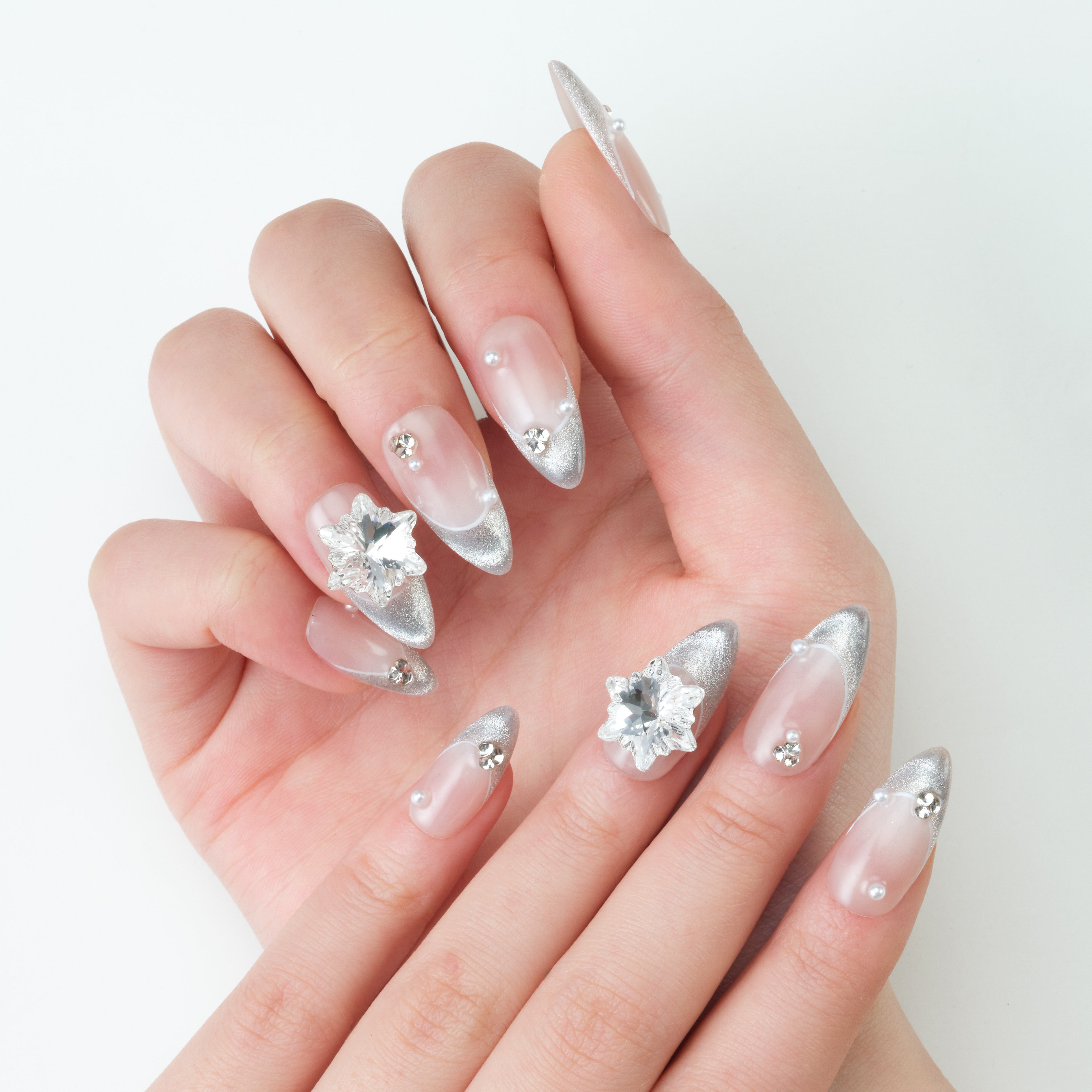 Starlight Radiance features a soft pink base paired with silver glitter and pearl accents, exuding elegance and romance. The 3D crystal flower design resembles fallen stars, adding a touch of luxurious brilliance. Every detail is meticulously crafted to showcase understated yet striking beauty. Perfect for weddings, parties, or special occasions, this nail set ensures you shine as the center of attention under the lights.