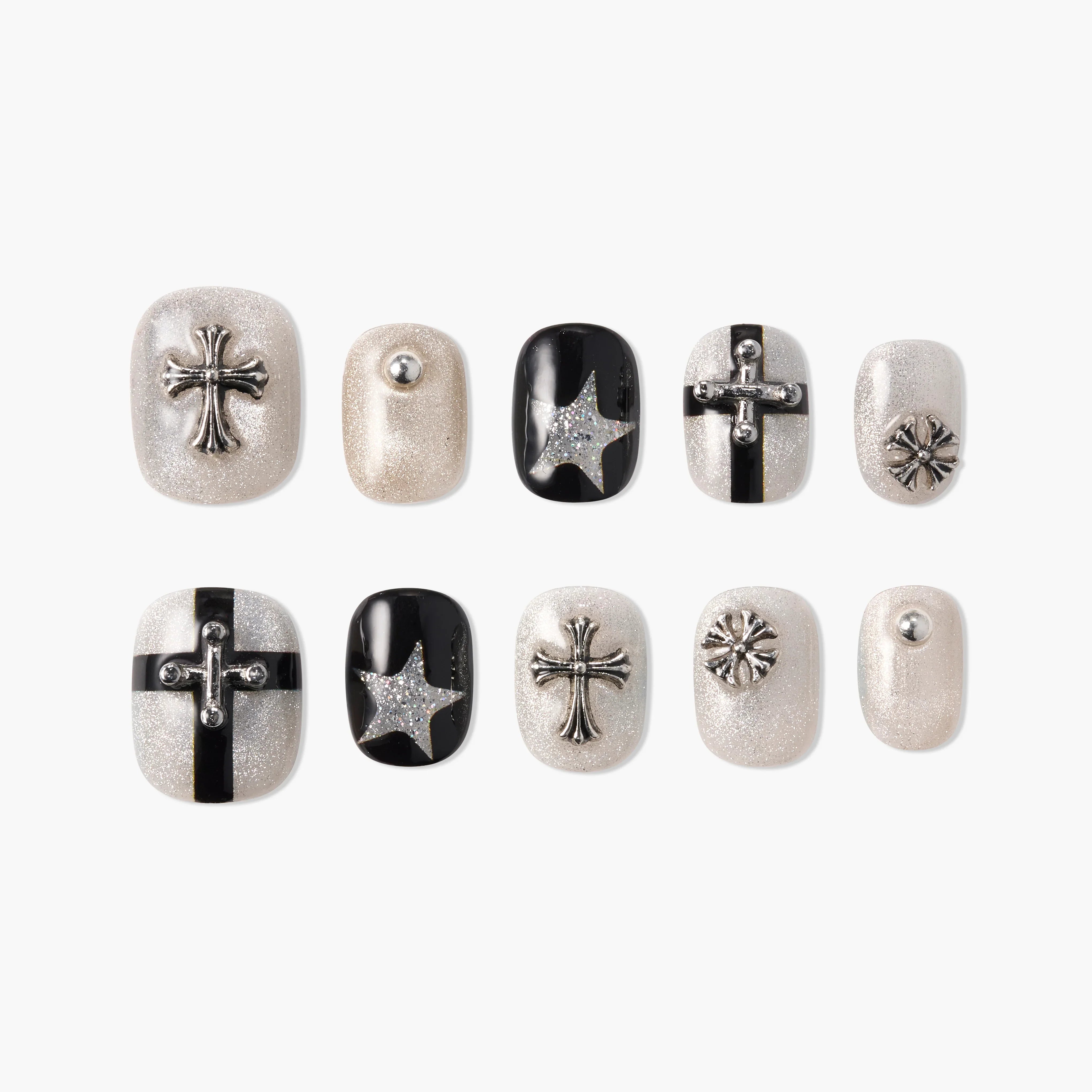 Handmade press-on nails by Emily’s Nail blending sacred cross motifs with starlit accents and soft champagne shimmer. Sculpted silver elements, glossy black contrast, and subtle sparkle create a refined gothic-luxe balance. Each nail is handcrafted for a dimensional, salon-quality finish—durable, reusable, and ready in 10 minutes.