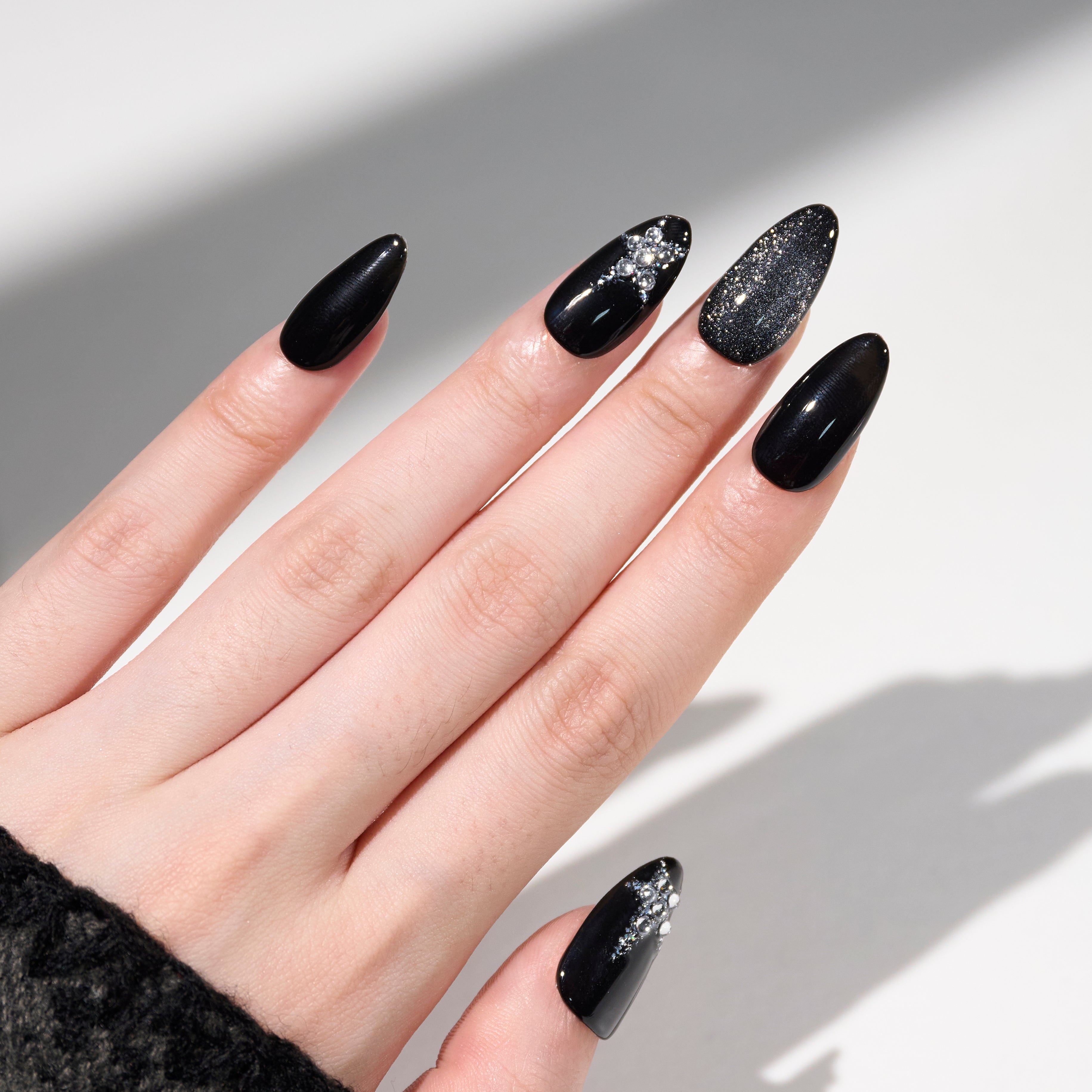 "Starlit Radiance" is a press on nail set with a deep black base, adorned with silver star designs and shimmering glitter, resembling the dazzling stars in the night sky. Each nail sparkles with a brilliant glow, adding a touch of elegance and sophistication. This design is perfect for evening events and parties, showcasing your celestial charm.