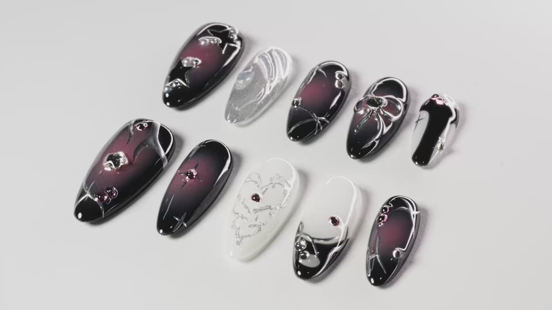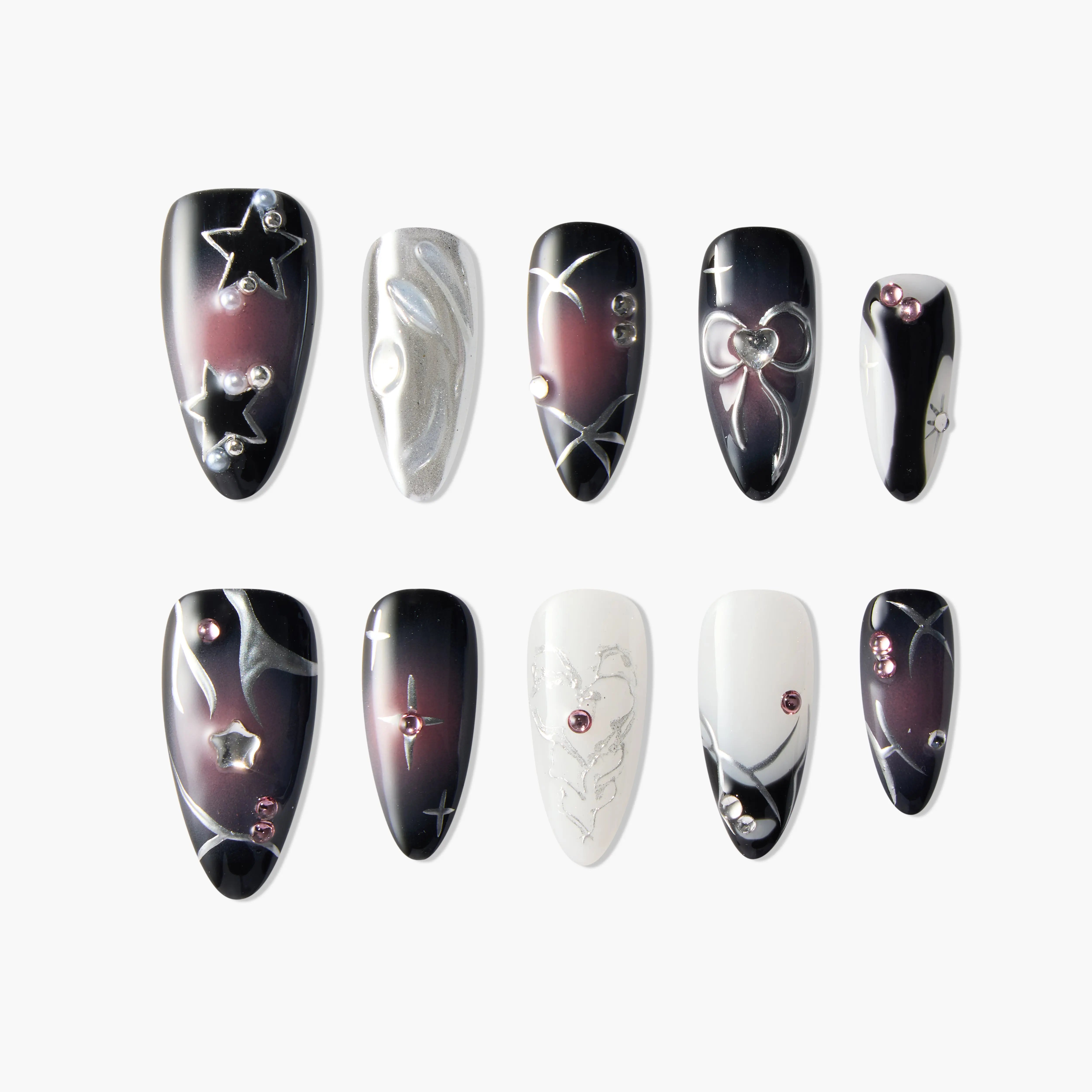 The "Starry Night" design features a gradient of black and white with intricate star, heart, and silver line details. Accentuated by sparkling gemstones, this design exudes mystery and luxury, perfect for those who love bold and fashionable styles.