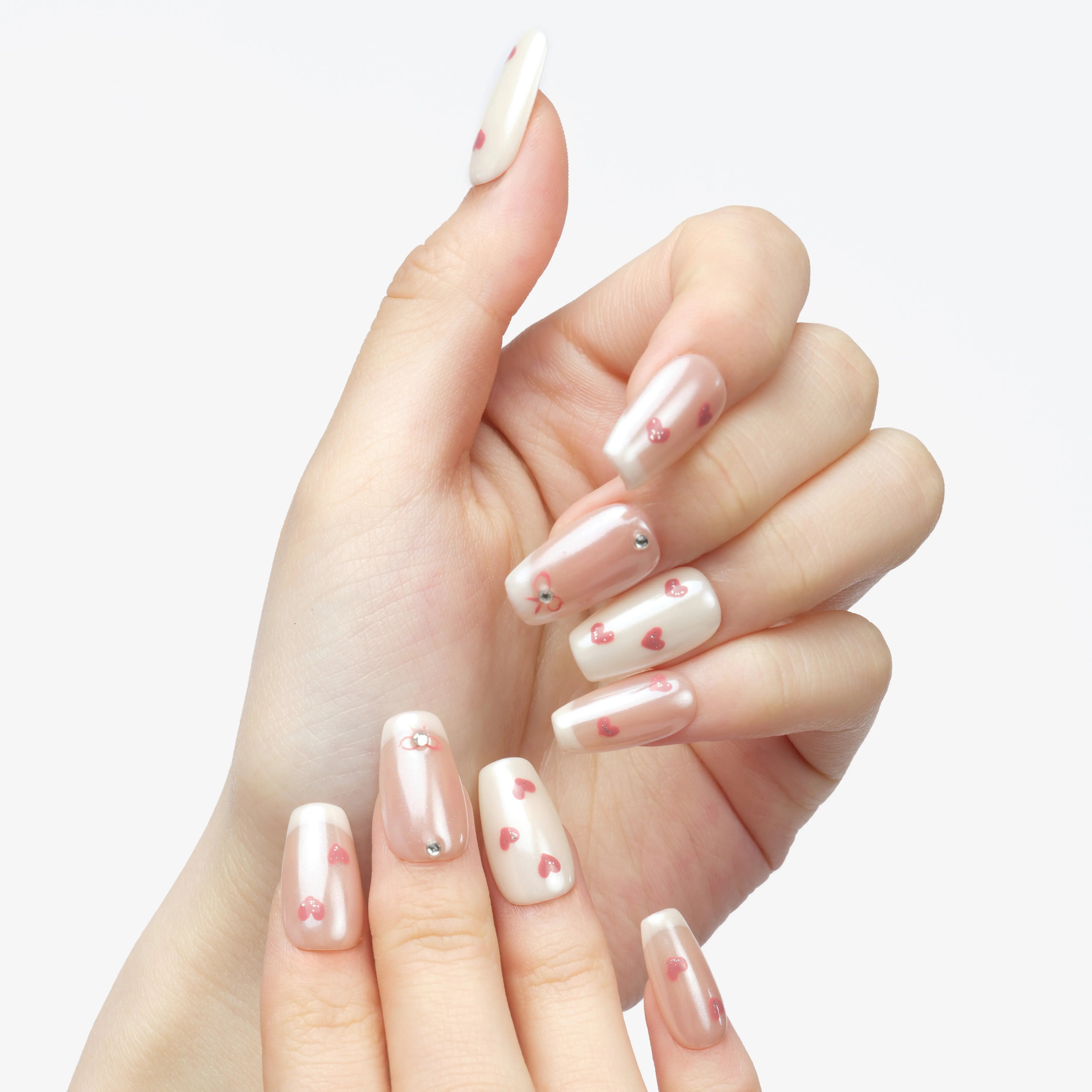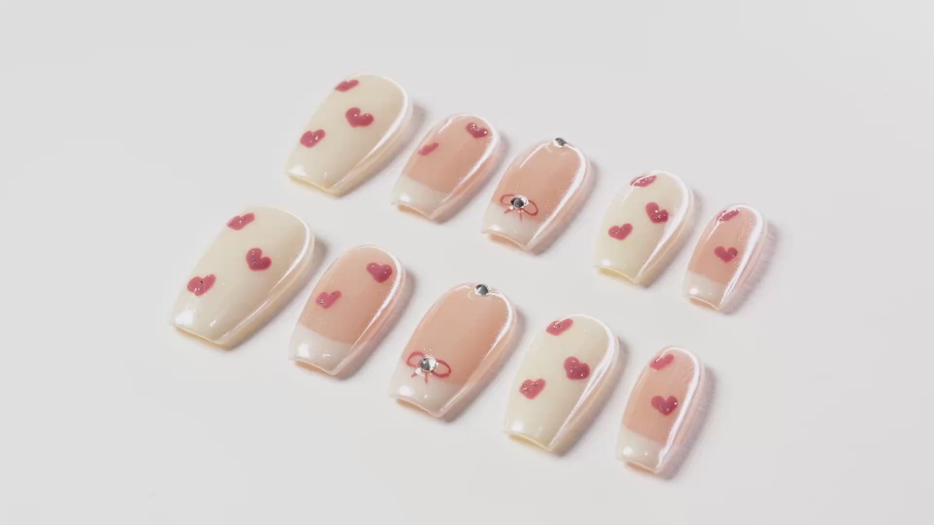 Sweetheart Whisper: Nude pink and milky white base, adorned with red hearts. Delicate bows and sparkling rhinestones add playfulness and sophistication. Perfect for dates, Valentine’s Day, or everyday, radiating warmth and romance on your fingertips.