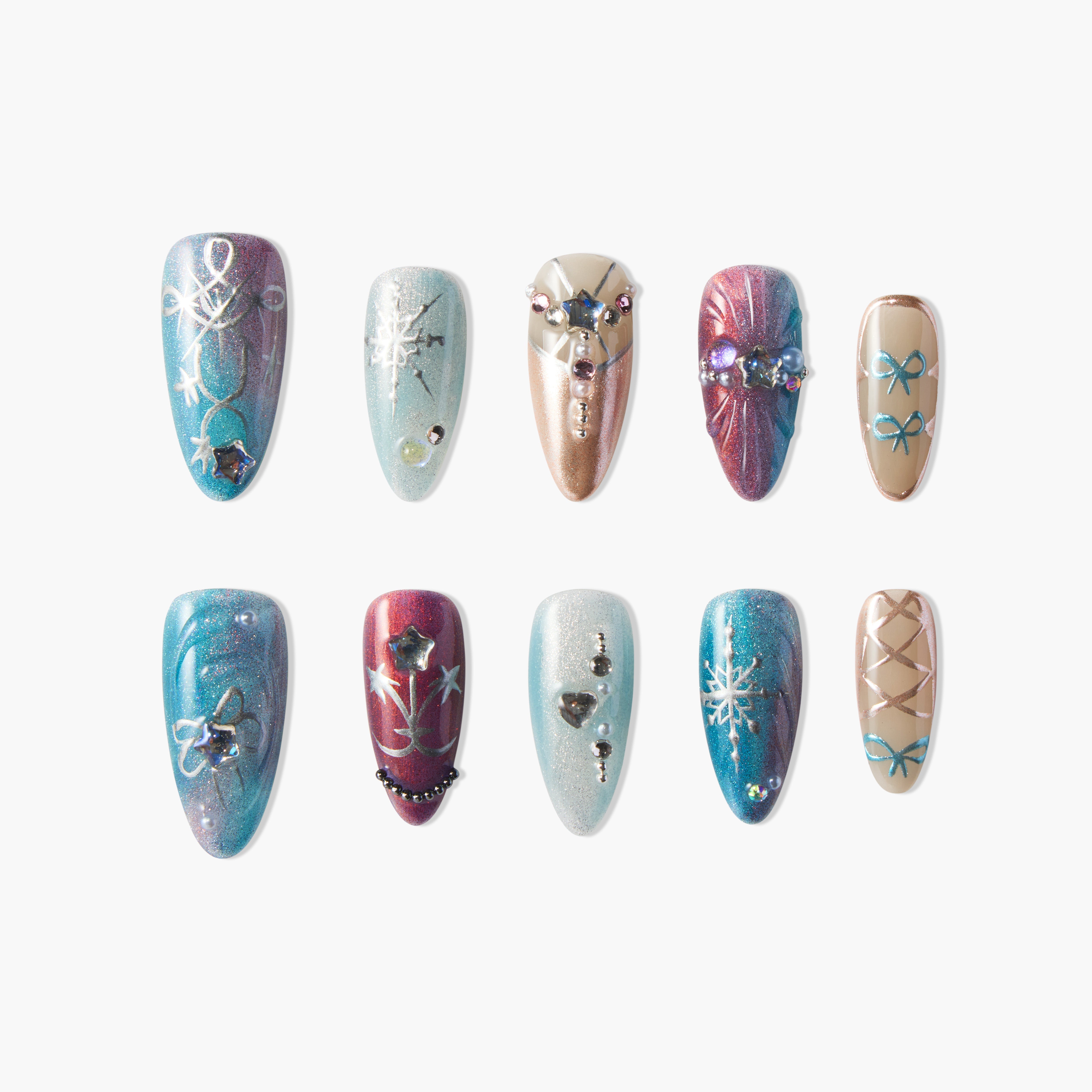 Twilight Stars is a dazzling nail design inspired by the celestial beauty of the night sky. It combines sparkling blues, rich purples, and soft metallic accents that resemble stars twinkling in the darkness. The design features delicate snowflakes, stars, and bows, adorned with shimmering crystals and beads. The gentle gradient effect, transitioning from deep colors to soft tones, gives a magical and ethereal feel, perfectly capturing the essence of a starlit evening.