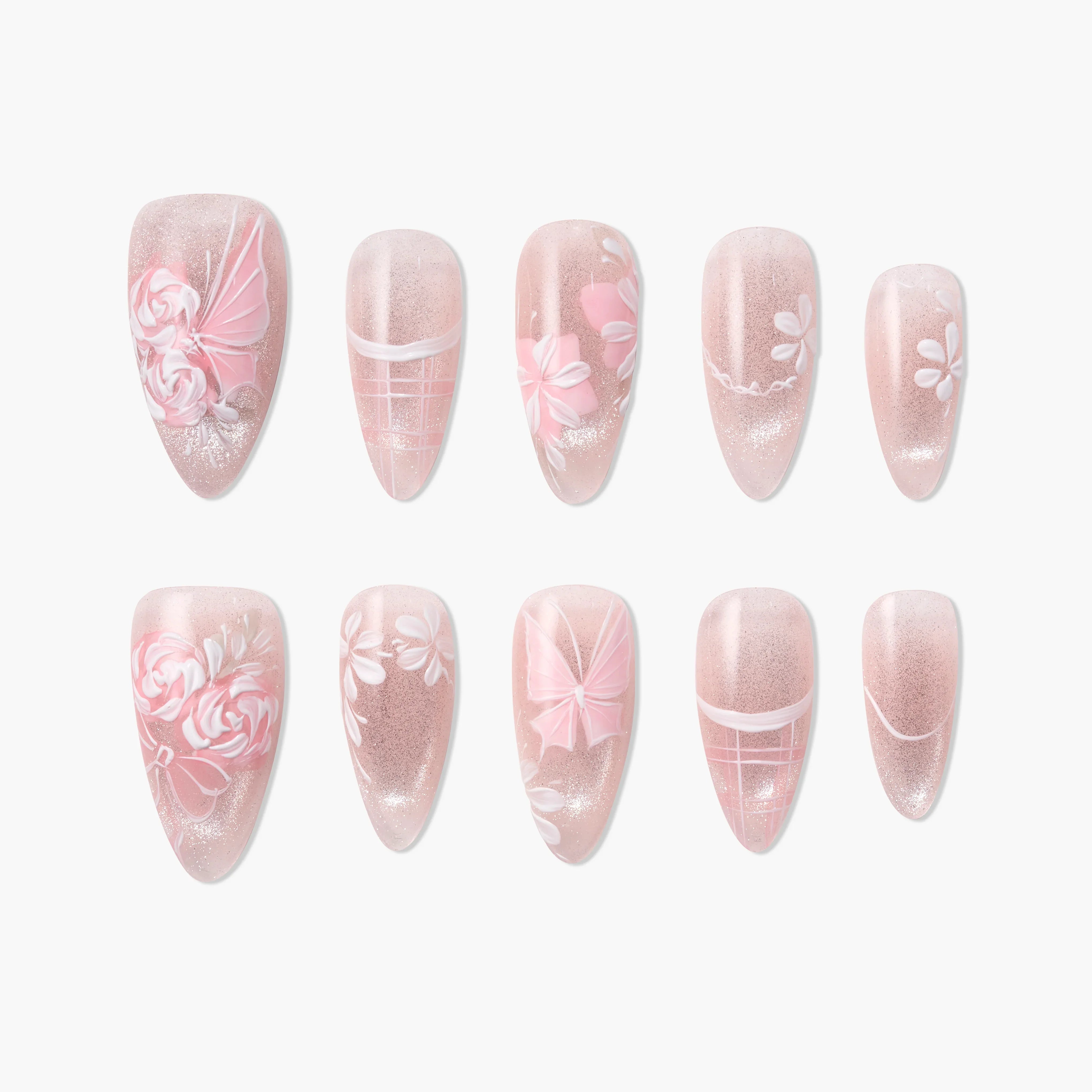 Whispered Petals is a soft, romantic design that feels delicate, airy, and timeless. A sheer blush shimmer base creates a gentle glow, while hand-painted roses, bows, and florals add graceful detail with a watercolor-like finish. Fine white lines and subtle lace-inspired accents bring balance and elegance without overwhelming the look. Sweet, feminine, and quietly luxurious, this handcrafted set is perfect for everyday soft glamour, weddings, dates, and anyone who loves subtle artistry—finished with a salon-quality shine and ready in 10 minutes.