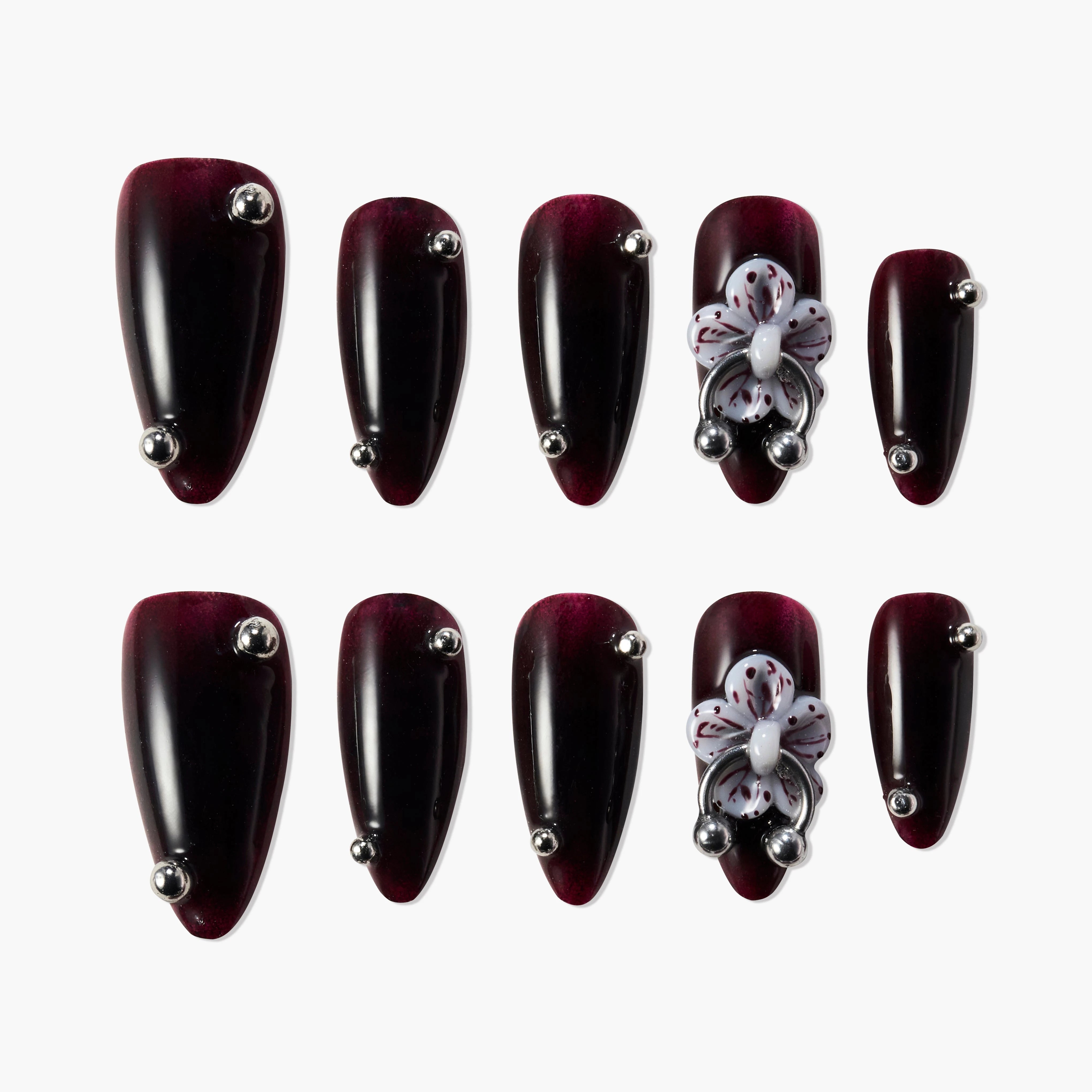 As unhas postiças Black Sakura Bloom da Emily's Nail apresentam uma base em gradiente vermelho vinho escuro com tachas metálicas e arte floral 3D, criando um visual misterioso e arrojado, perfeito para uma elegância ousada.