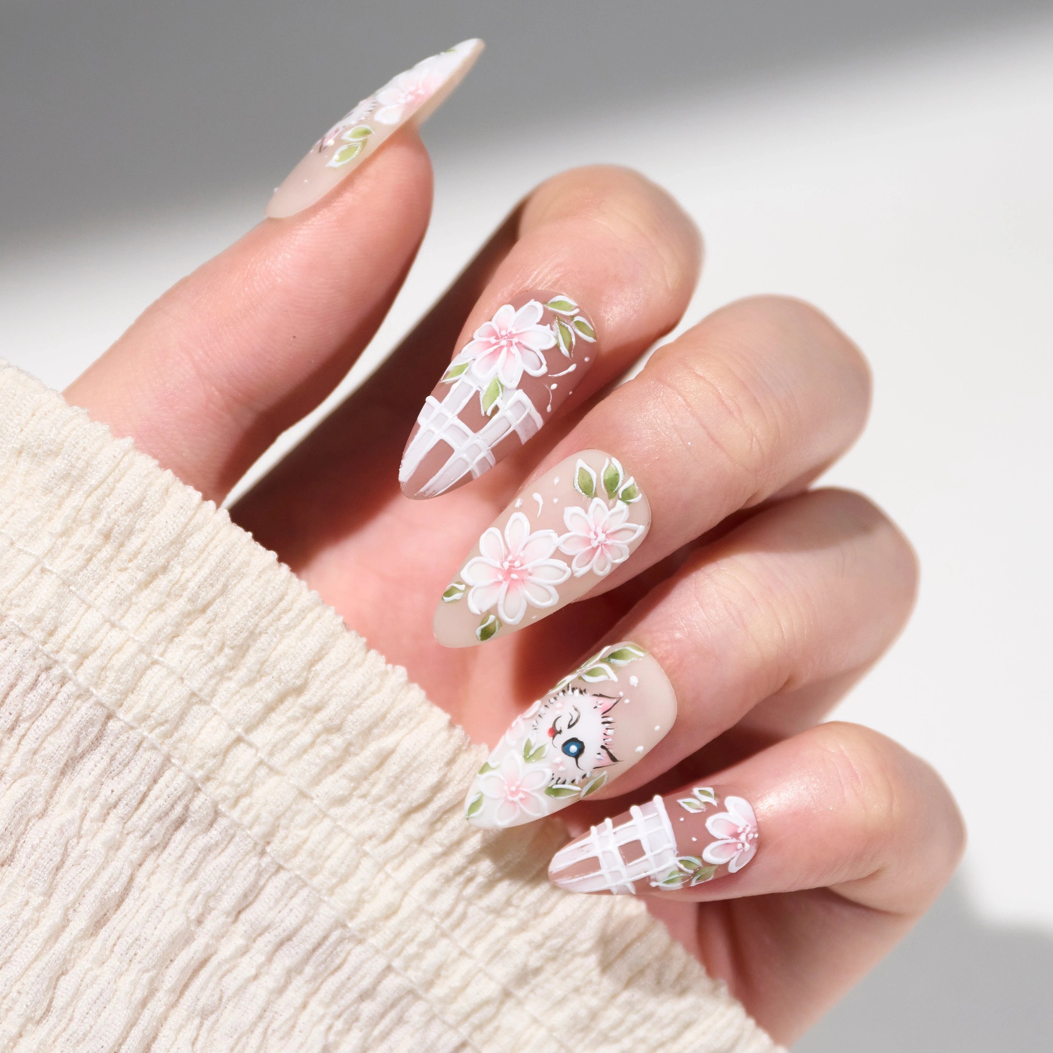 Entre num mundo de charme suave com o Jardim de Gatinhos Florescentes da Emily. Cada unha é delicadamente pintada à mão com flores em flor e gatinhos adoráveis espreitando entre folhas suaves. Os detalhes das flores 3D trazem um toque de textura e arte, tornando este conjunto perfeito para quem adora uma elegância fofa e inspirada na natureza.