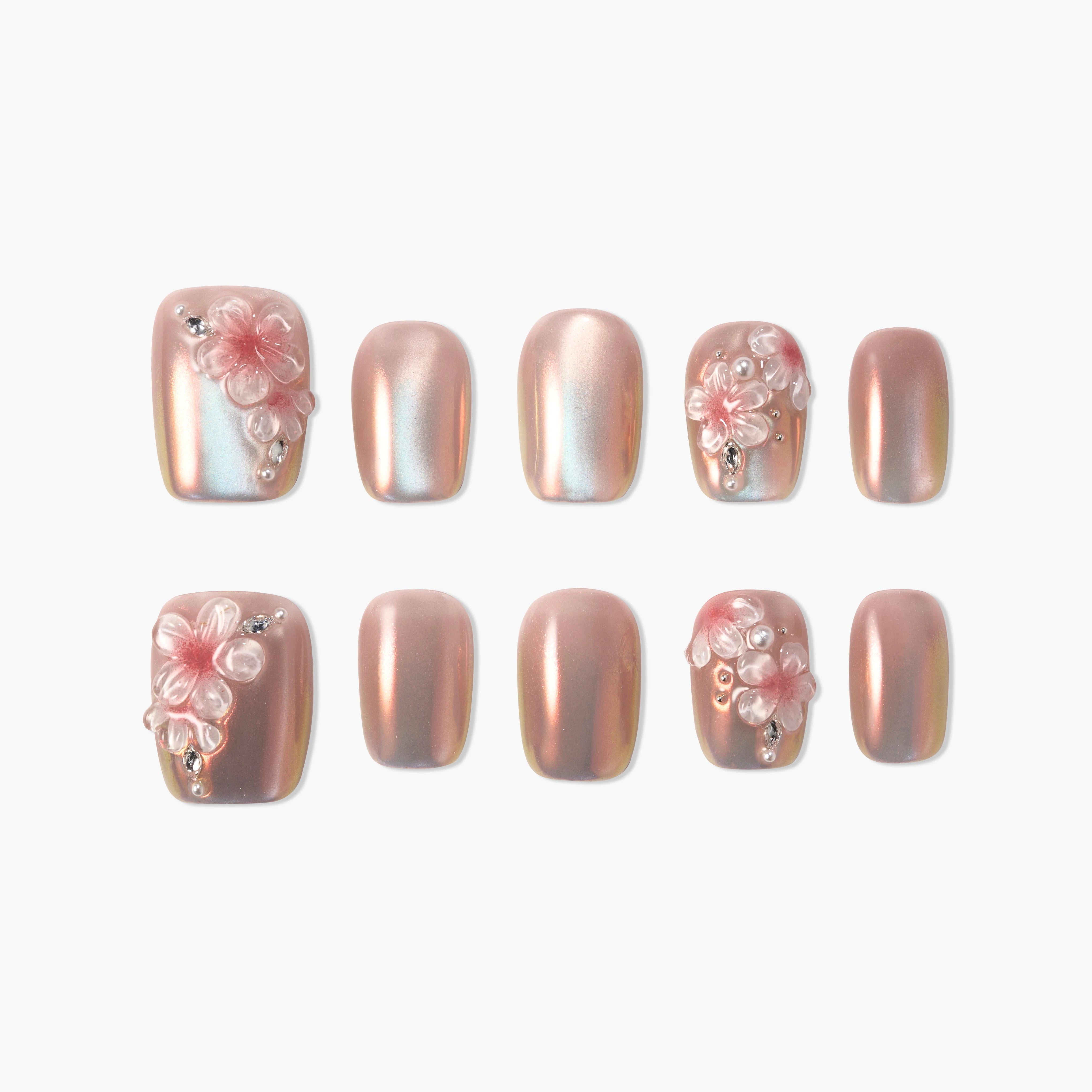 Graciosa e luminosa, a Aura Blossom de Emily captura o suave brilho das pétalas a florescer sob a luz da manhã. A base cromada rosa-champanhe reflete uma iridescência subtil, enquanto as flores 3D esculpidas e os cristais adicionam um toque de luxo couture. Perfeita para casamentos, ocasiões de primavera ou para quem adora um brilho delicado com elegância intemporal.