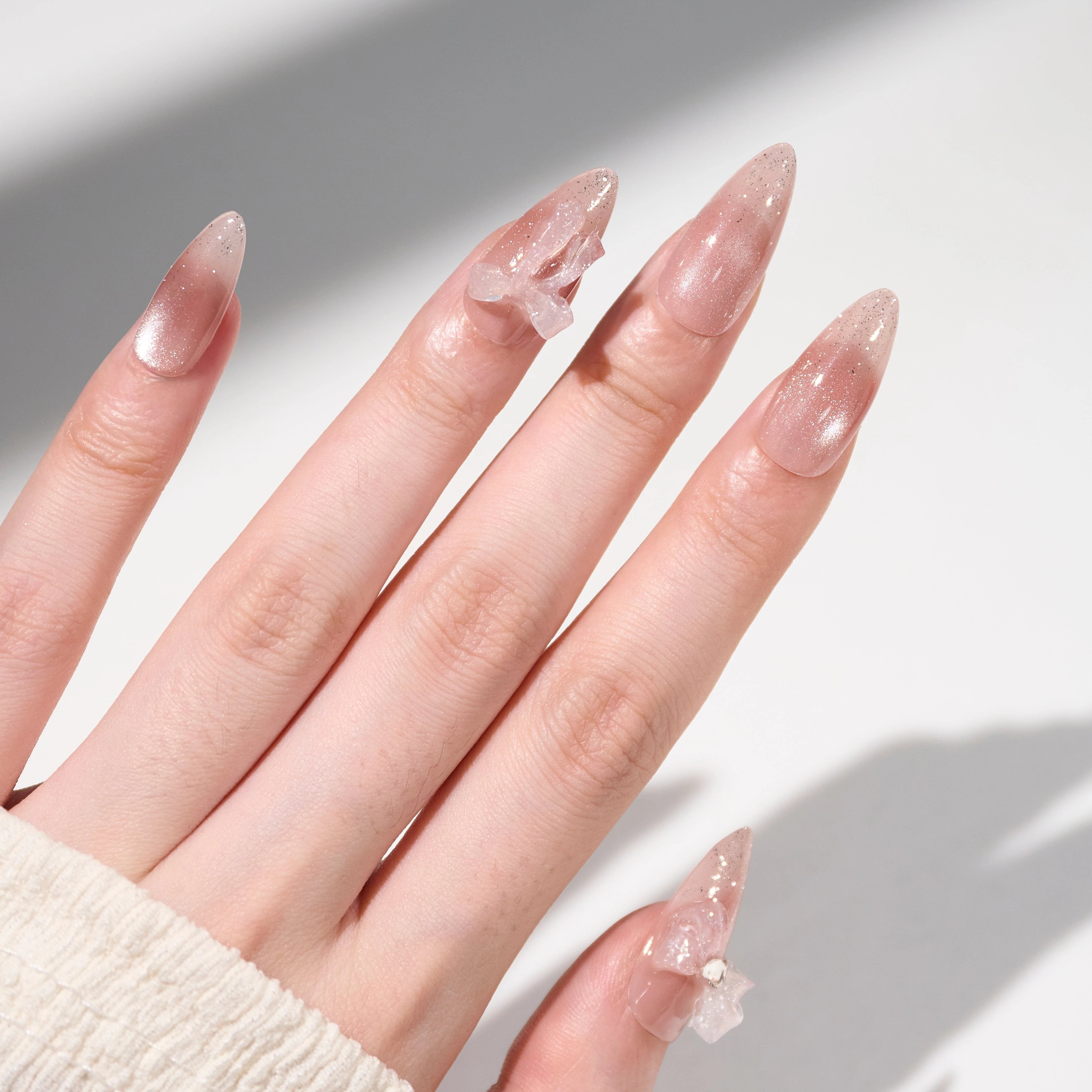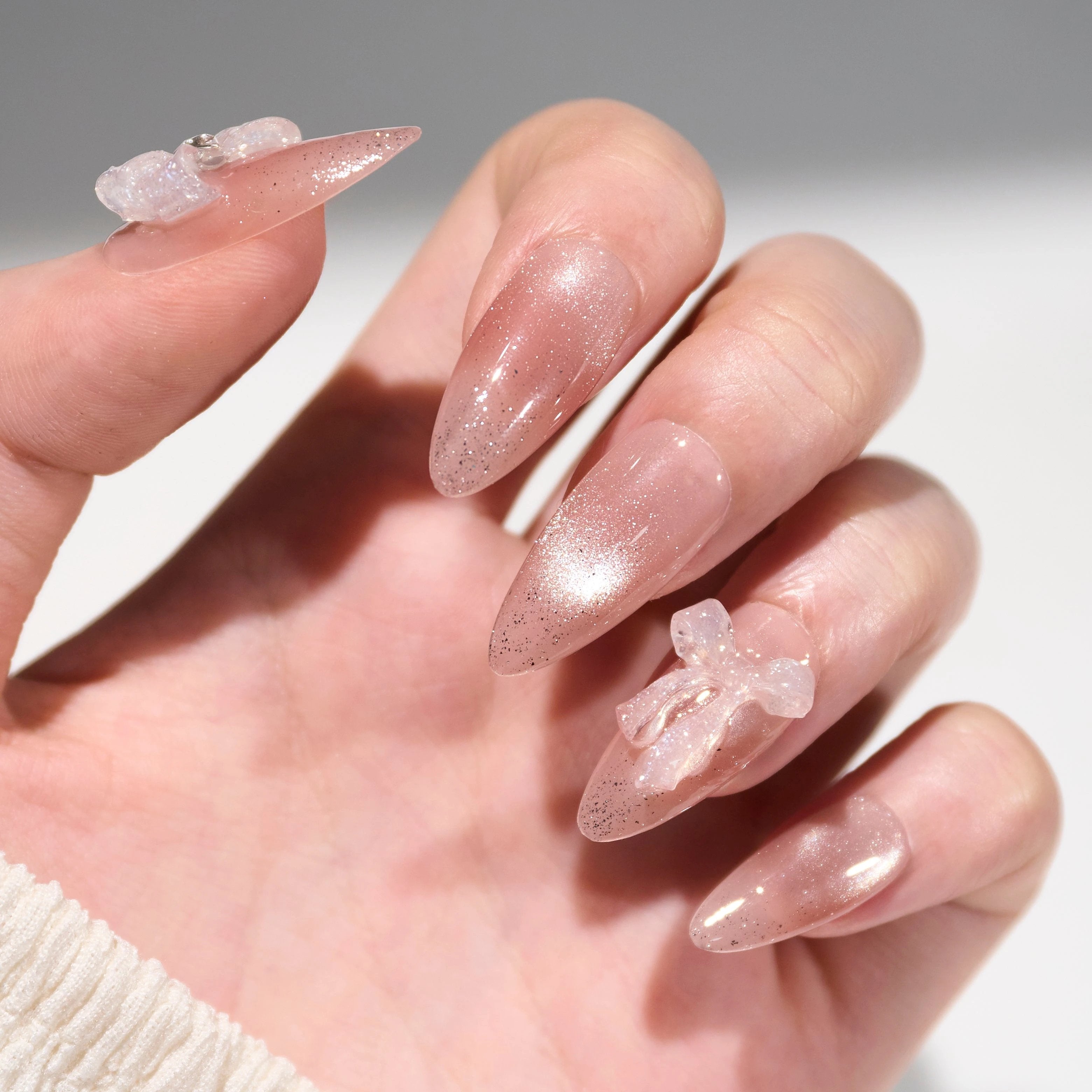 Suave, romântico e delicadamente feminino — o Blushing Ribbon da Emily combina uma base ombré nude-rosa com laços 3D translúcidos e um toque subtil de brilho. O pendente em forma de coração no centro adiciona um toque de doçura, tornando-o o design perfeito para noivas, encontros ou elegância diária.
