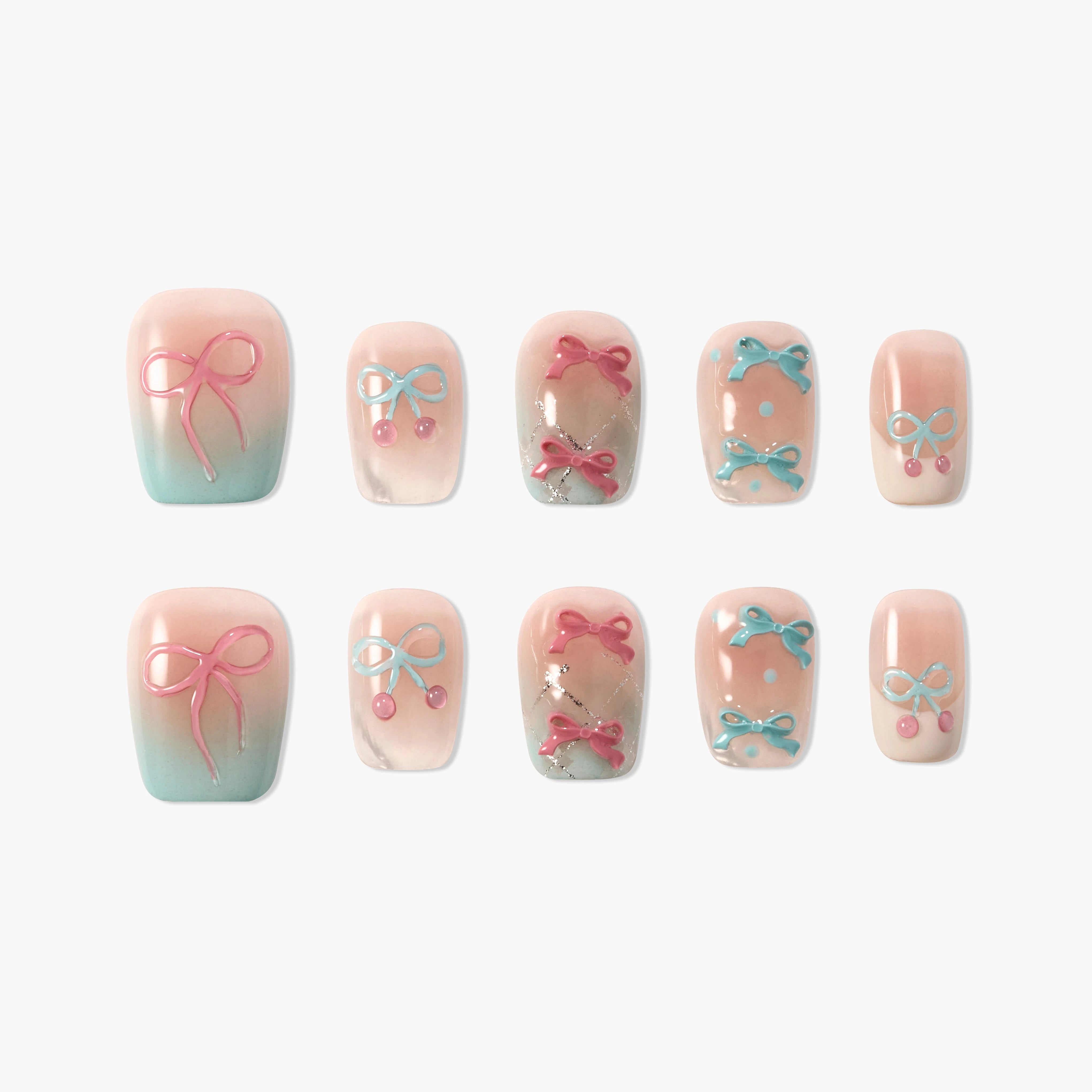 Entre num sonho pastel — Candy Ribbon Dream combina tons suaves de ombré do rosa ao azul com laços 3D divertidos e contas de cereja brilhantes. Cada detalhe brilha com doçura, realçando o seu charme e confiança interior.