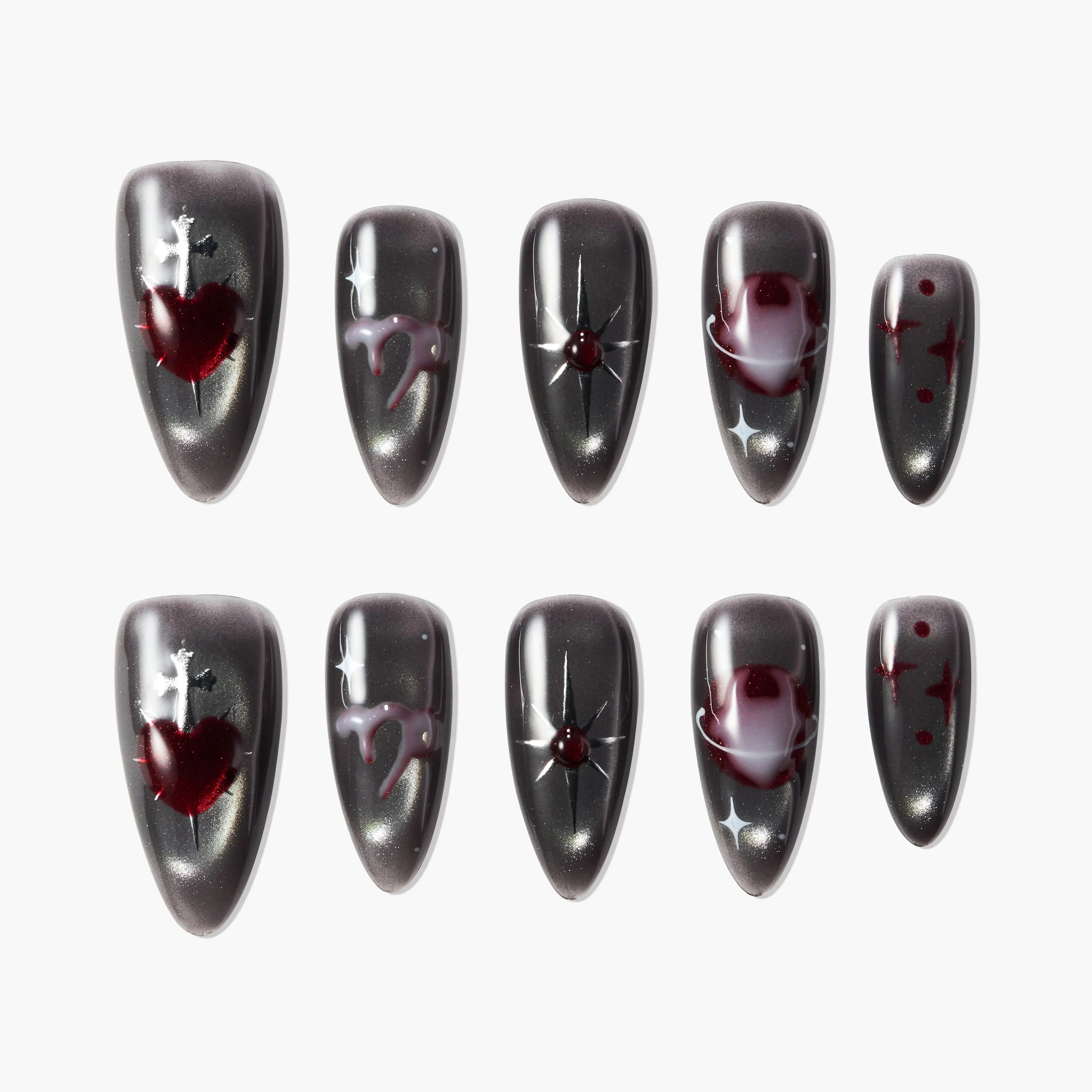 Unhas postiças estilo olho de gato inspiradas nos signos do Zodíaco, com um efeito luminoso que brilha no escuro. Misteriosas, cósmicas e perfeitas para vibes de noites estreladas.