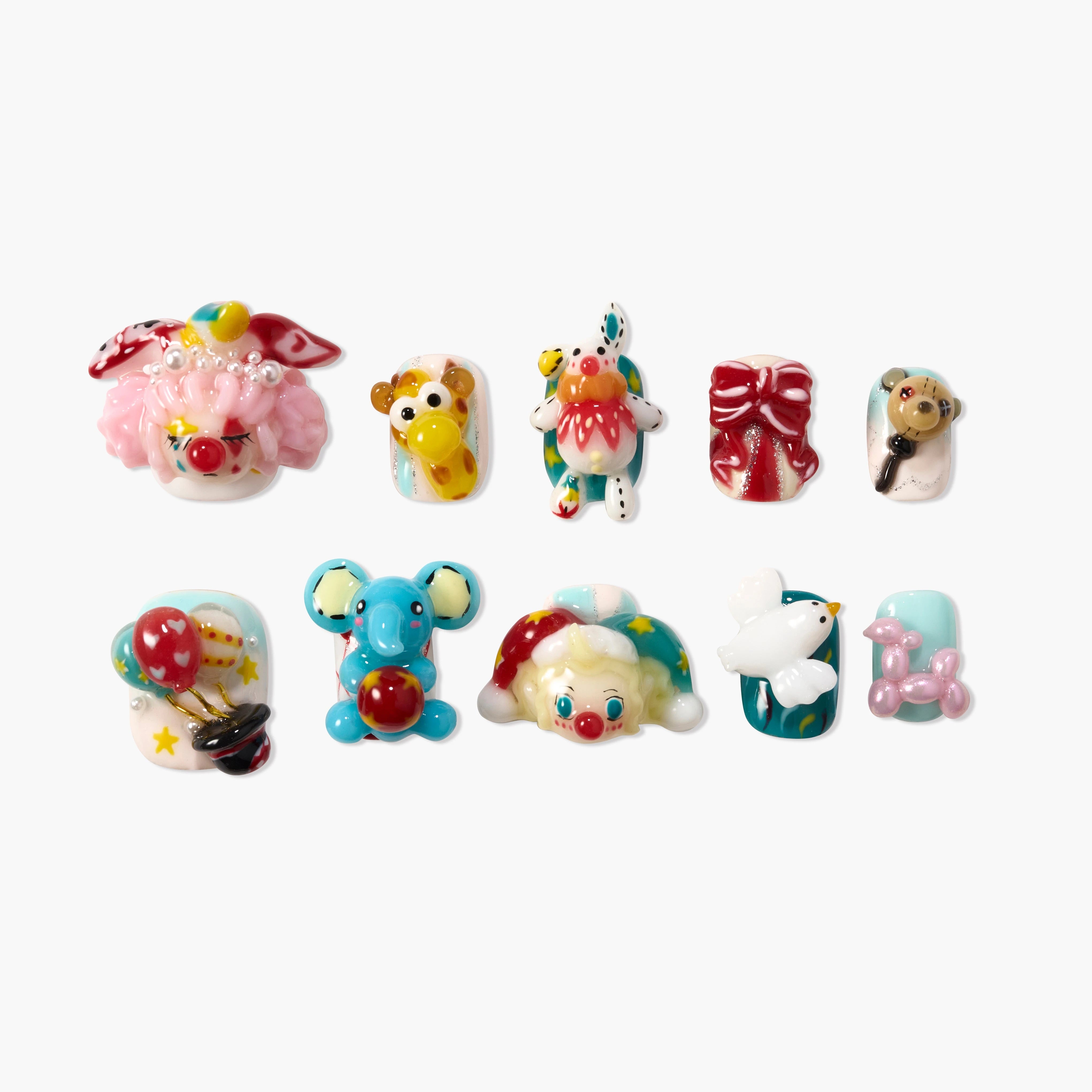 Carnival Parade é um conjunto vibrante de unhas postiças 3D inspirado na diversão do circo — com palhaços, animais, balões, fitas e detalhes divertidos. Cada peça é totalmente feita à mão com cores ousadas e detalhes esculpidos que dão vida ao design. Leve, durável e reutilizável, este conjunto oferece um visual único e marcante com resultados de qualidade de salão em apenas 10 minutos.
