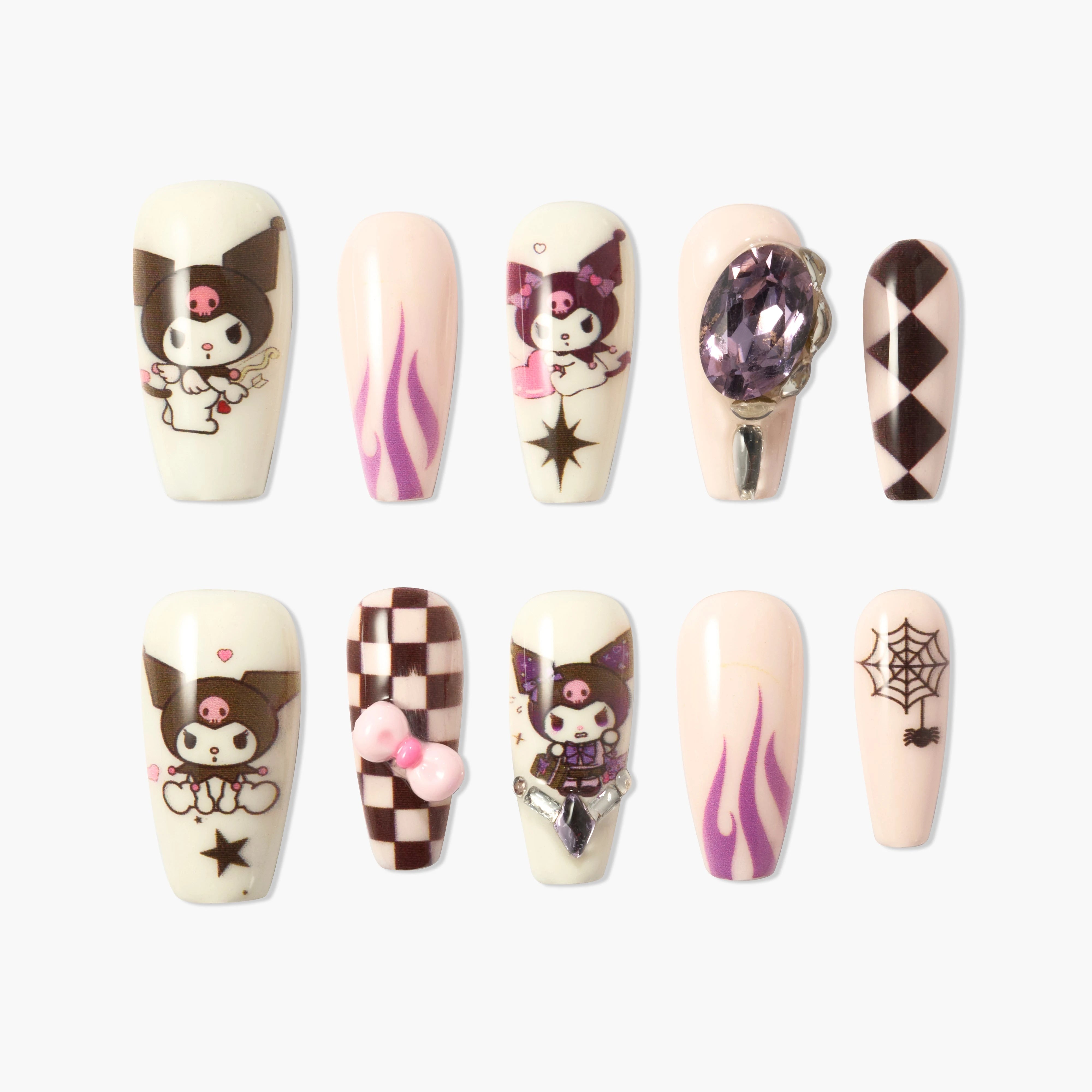 Série de Desenhos Animados da Emily · As unhas artesanais Kuromi apresentam a personagem travessa mas fofa Kuromi, realçada com chamas roxas, padrões de tabuleiro, laços, cristais e motivos de teia. A mistura de rosa suave com detalhes escuros cria um ambiente ousado mas divertido — perfeito para festas, saídas estilosas e looks de moda arrojados.