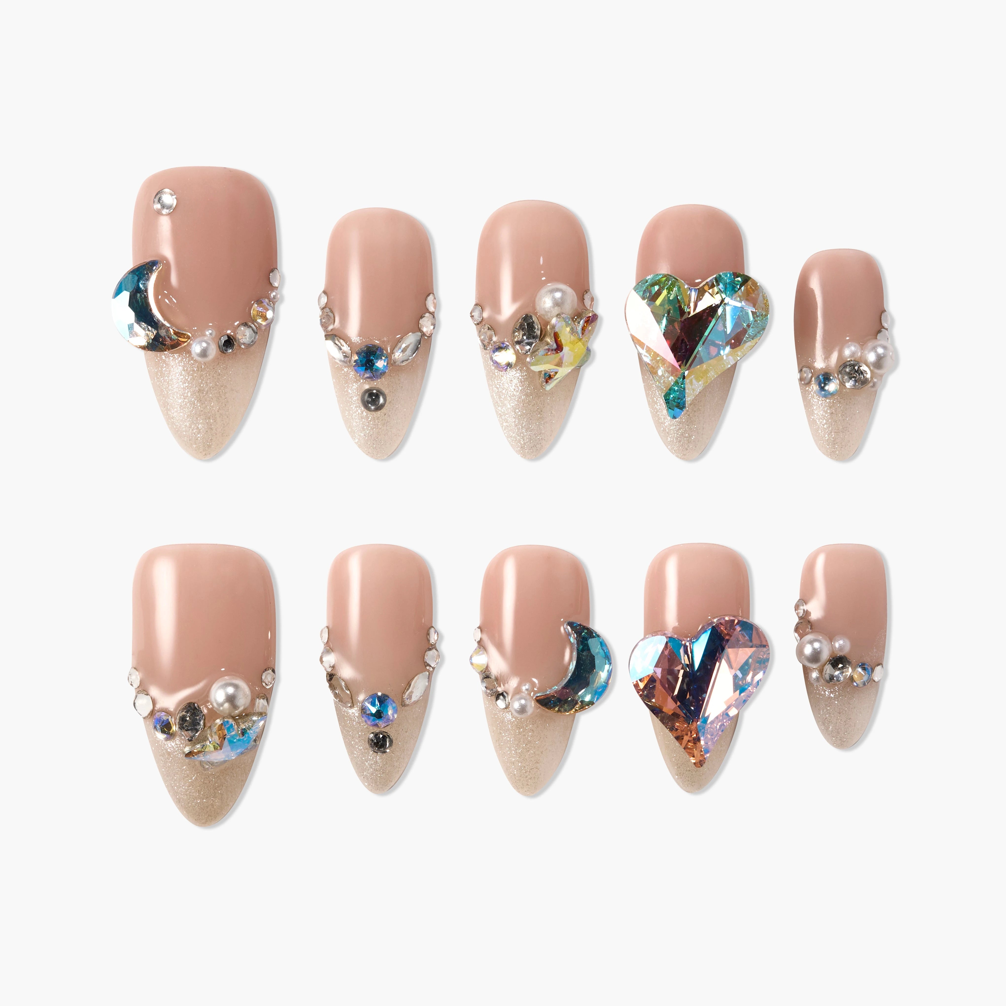 Onde o luar encontra o amor — Celestial Amour captura o brilho do céu noturno. Uma base em gradiente champanhe-nude cintila sob corações de cristal, pérolas e gemas em forma de lua, criando uma galáxia de luz nas suas pontas dos dedos. Cada unha reflete uma constelação de arte, feita à mão para puro luxo.