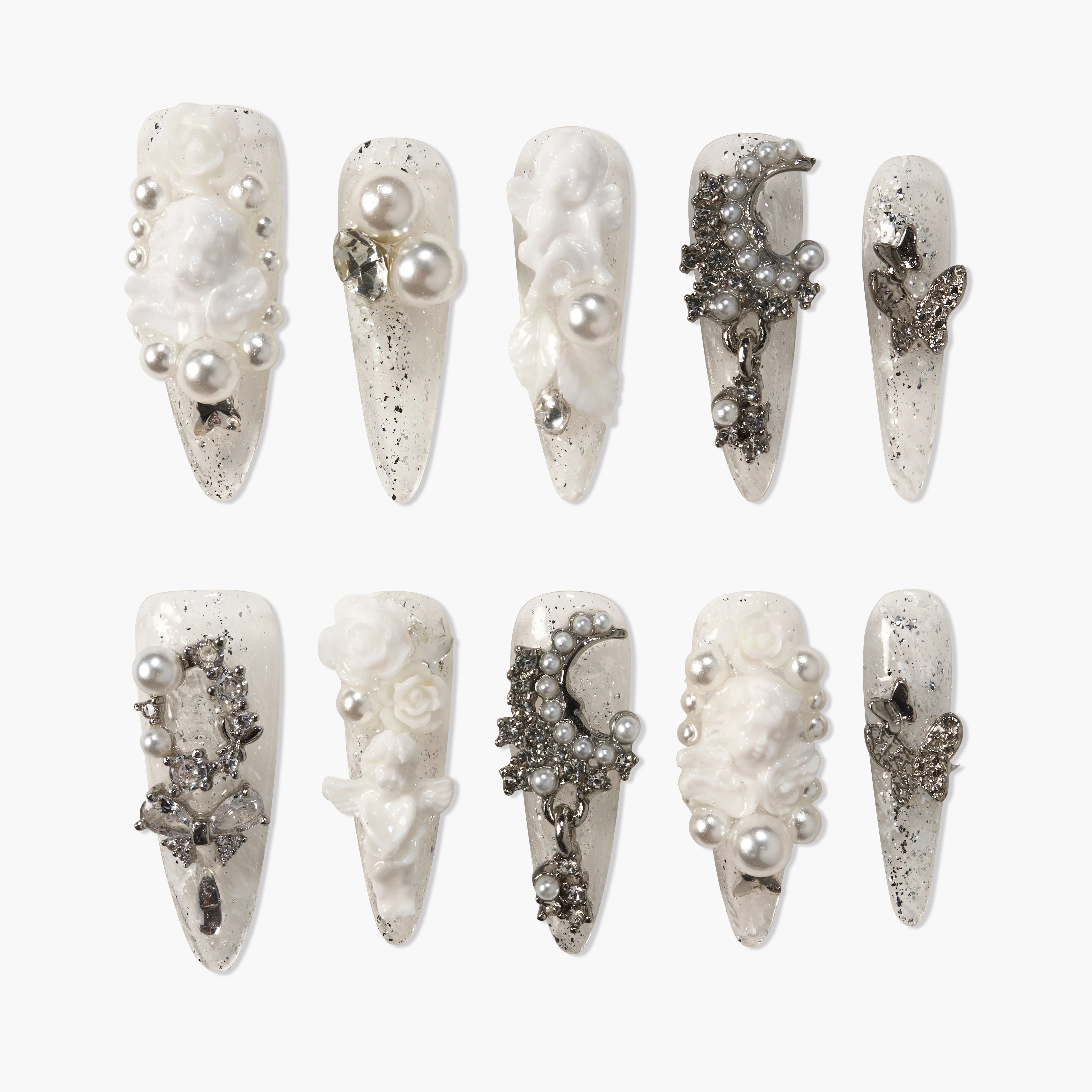 A Escultura Anjo Celestial apresenta um anjo branco esculpido à mão e entalhes florais combinados com motivos de lua prateados, cristais e pérolas agrupadas. A base suave em marfim com partículas metálicas dispersas cria um brilho celestial, enquanto a combinação de texturas em relevo e tons de prata envelhecida oferece uma estética romântica e dramática de fantasia.