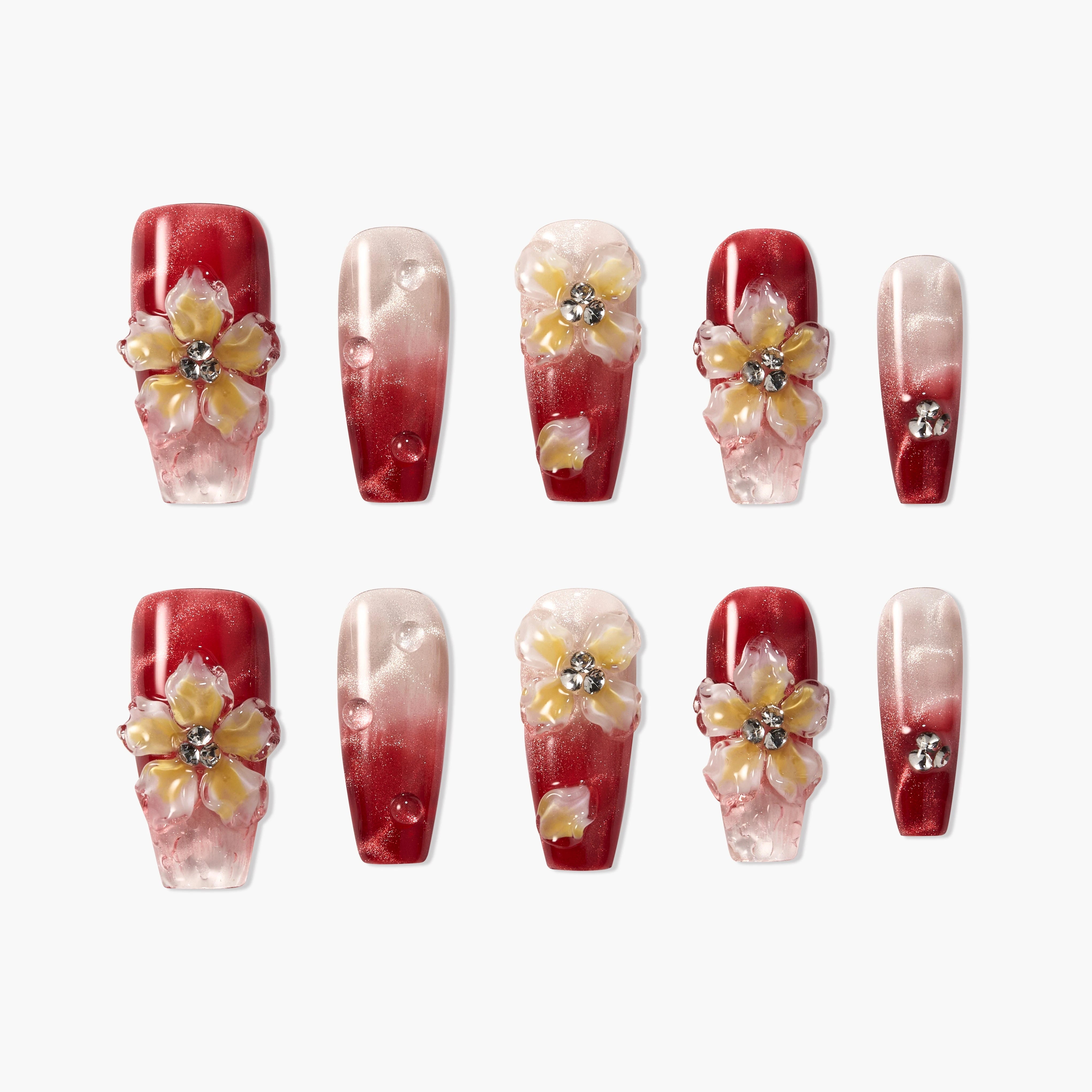 Crimson Crystal Bloom apresenta um gradiente vermelho vívido combinado com detalhes florais de cristal 3D. Cada unha é feita à mão com um acabamento brilhante cintilante, criando um visual arrojado e elegante. Leve, durável e reutilizável — perfeito para obter resultados de qualidade de salão em apenas 10 minutos.