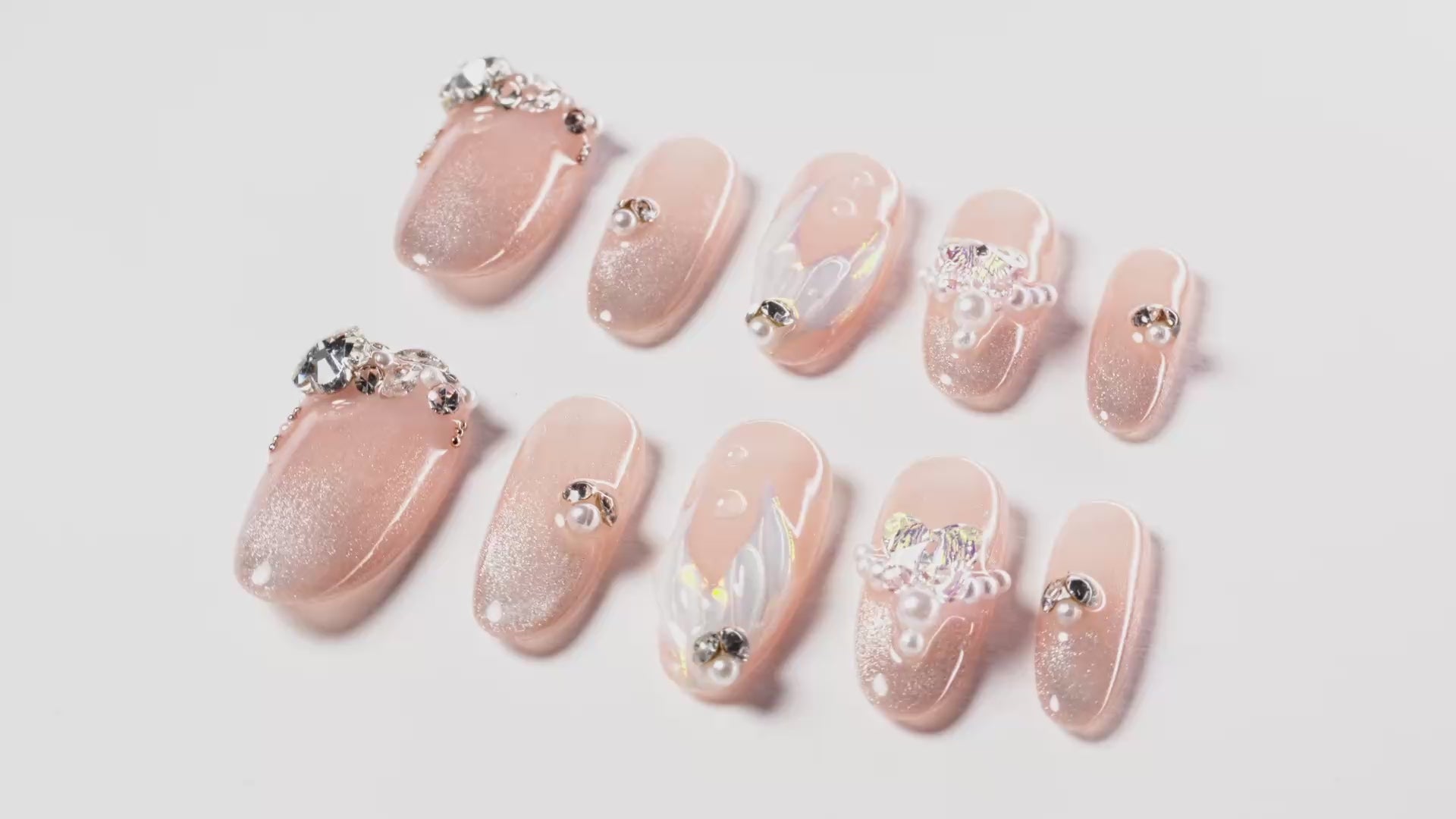 Crystal Bloom Radiance combina uma base rosa nude cintilante com detalhes florais iridescentes, acentuados por pérolas luminosas e brilhantes strass. Uma escolha perfeita para um look etéreo e glamoroso.