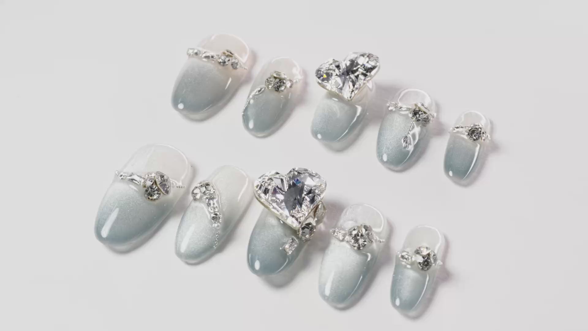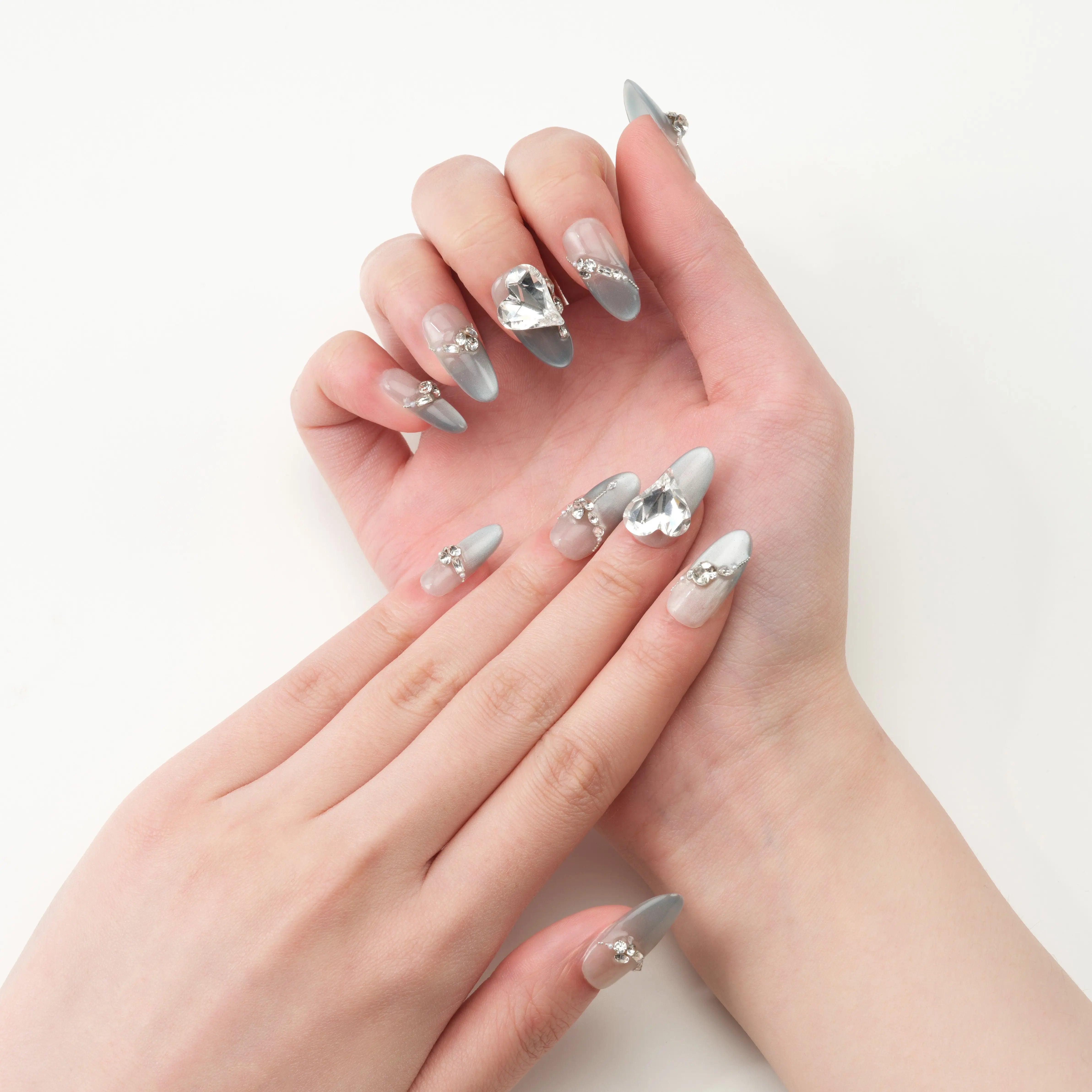 Crystal Frost apresenta um deslumbrante gradiente de cinzento-azulado esbranquiçado e branco perolado, adornado com brilhantes strass e um impressionante cristal 3D em forma de coração como peça central. A colocação elegante dos cristais e o brilho delicado evocam a beleza das manhãs geladas de inverno. Perfeito para eventos formais, galas ou um look diário luxuoso, este conjunto de unhas adiciona um toque refinado de glamour e sofisticação às suas pontas dos dedos.