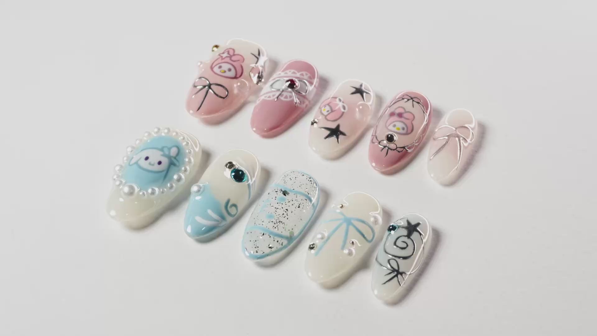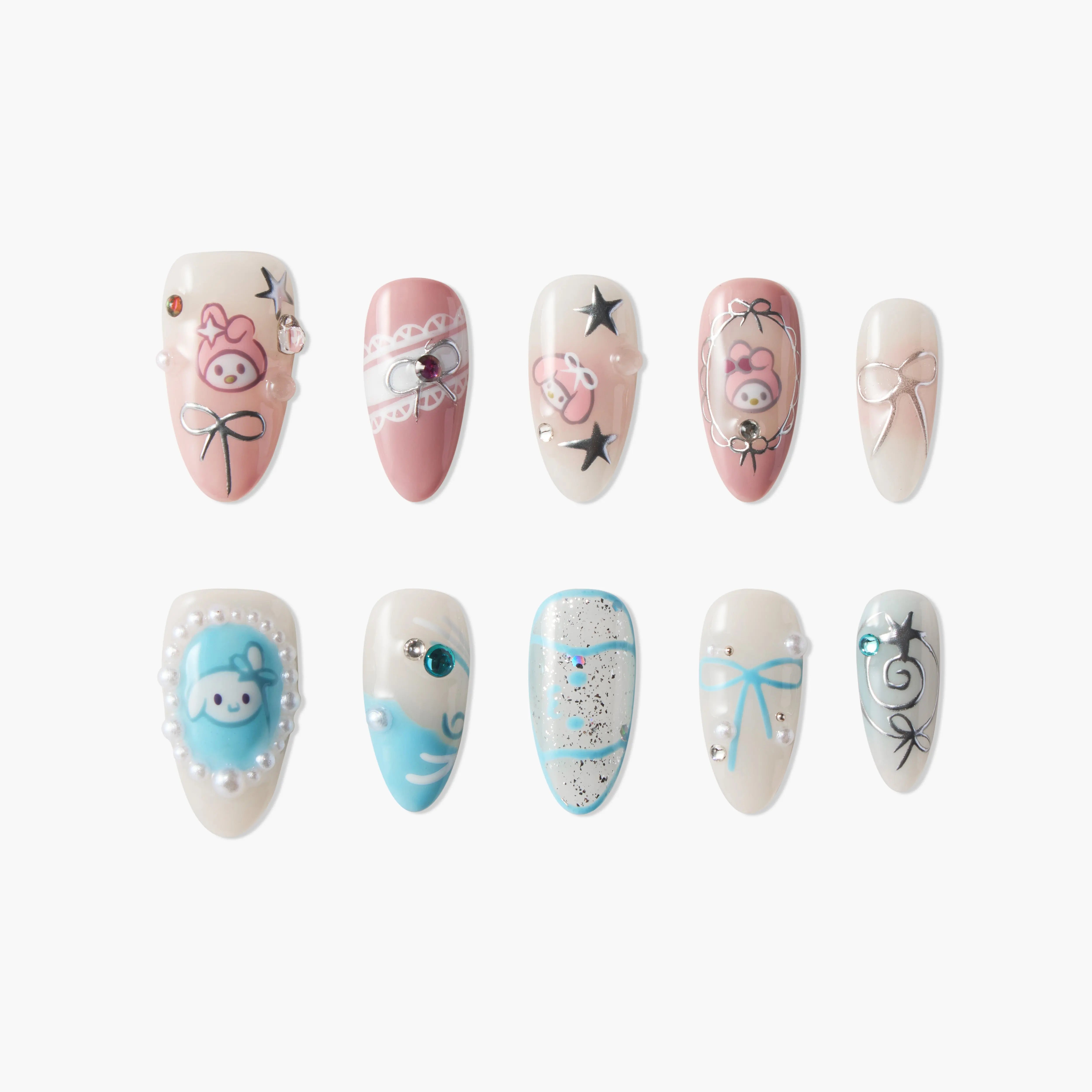 A coleção de nail art Cute Ribbon é inspirada em fitas doces e designs adoráveis de desenhos animados. A cor base rosa suave, combinada com padrões intrincados de fitas, pérolas e enfeites brilhantes, cria uma atmosfera de conto de fadas, sonhadora. As unhas apresentam ursos de desenho animado fofos e detalhes em bolhas, adicionando um toque lúdico e romântico. Este design é perfeito para mulheres que adoram estilos doces e divertidos, mostrando a sua fofura e charme único.
