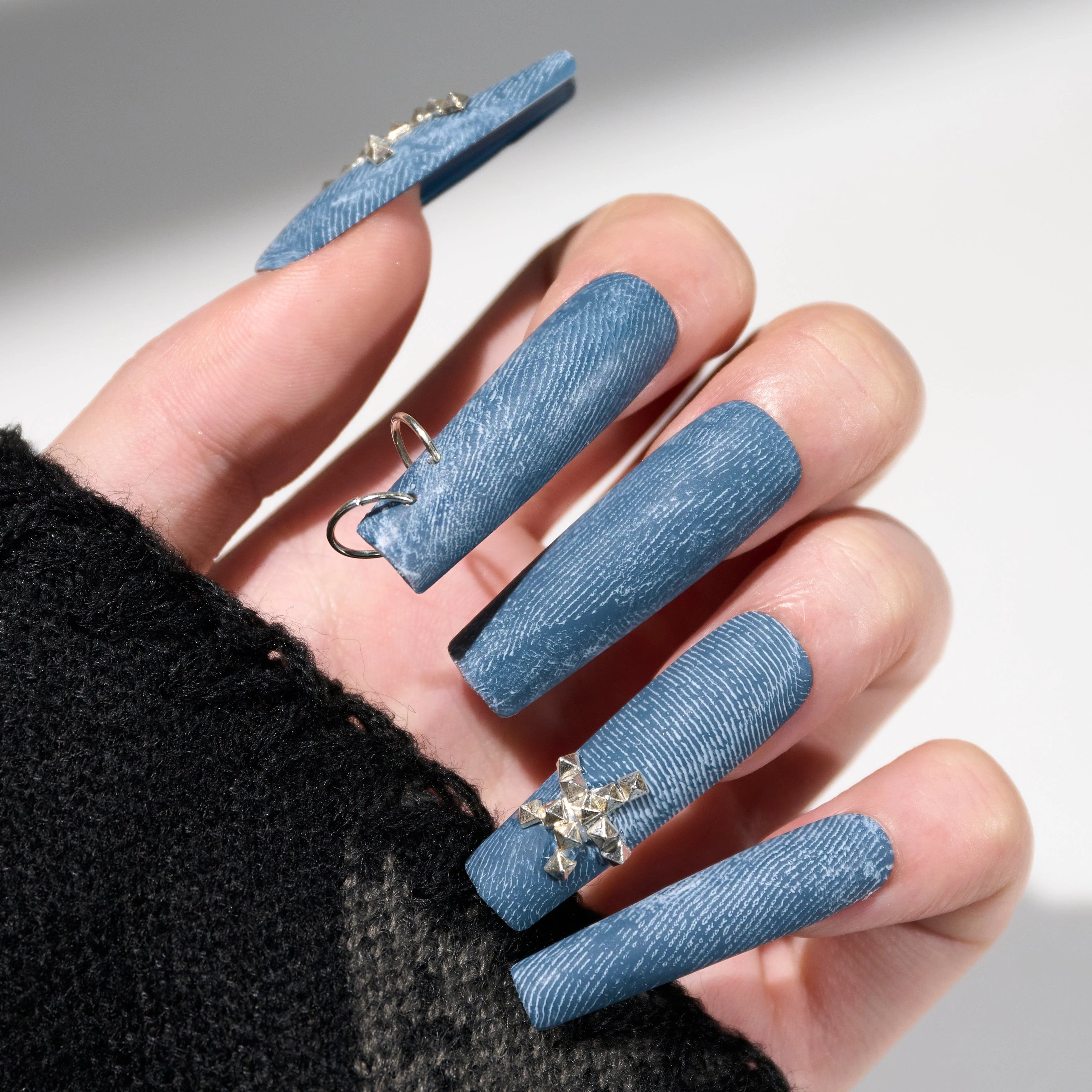 Denim Star redefine o casual chique com um toque de atitude rock. A base texturizada azul denim imita o grão real do tecido, criando um apelo suave mas robusto. Tachas de estrela prateadas e anéis metálicos adicionam um toque industrial, misturando o estilo urbano com detalhes de alta moda. Este design equilibra um estilo descontraído e um glamour arrojado — perfeito para quem quer que as suas unhas se destaquem com confiança e individualidade.