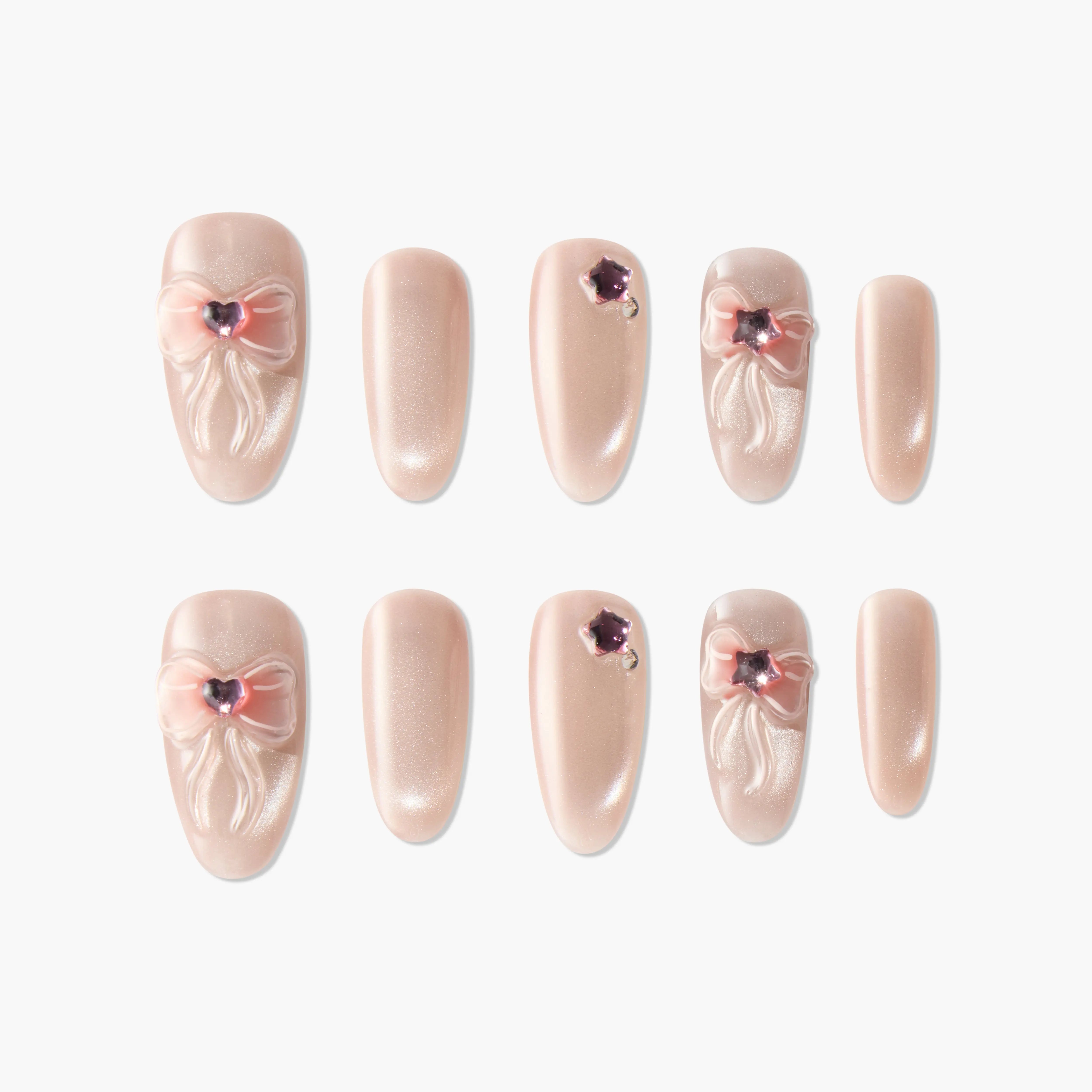 O "Laço Elegante" apresenta uma base rosa suave com detalhes delicados de laço e pedras preciosas cintilantes, conferindo-lhe um aspeto elegante e refinado. Perfeito para realçar o seu estilo com um toque feminino, estas unhas autocolantes são ideais tanto para o uso diário como para ocasiões especiais.
