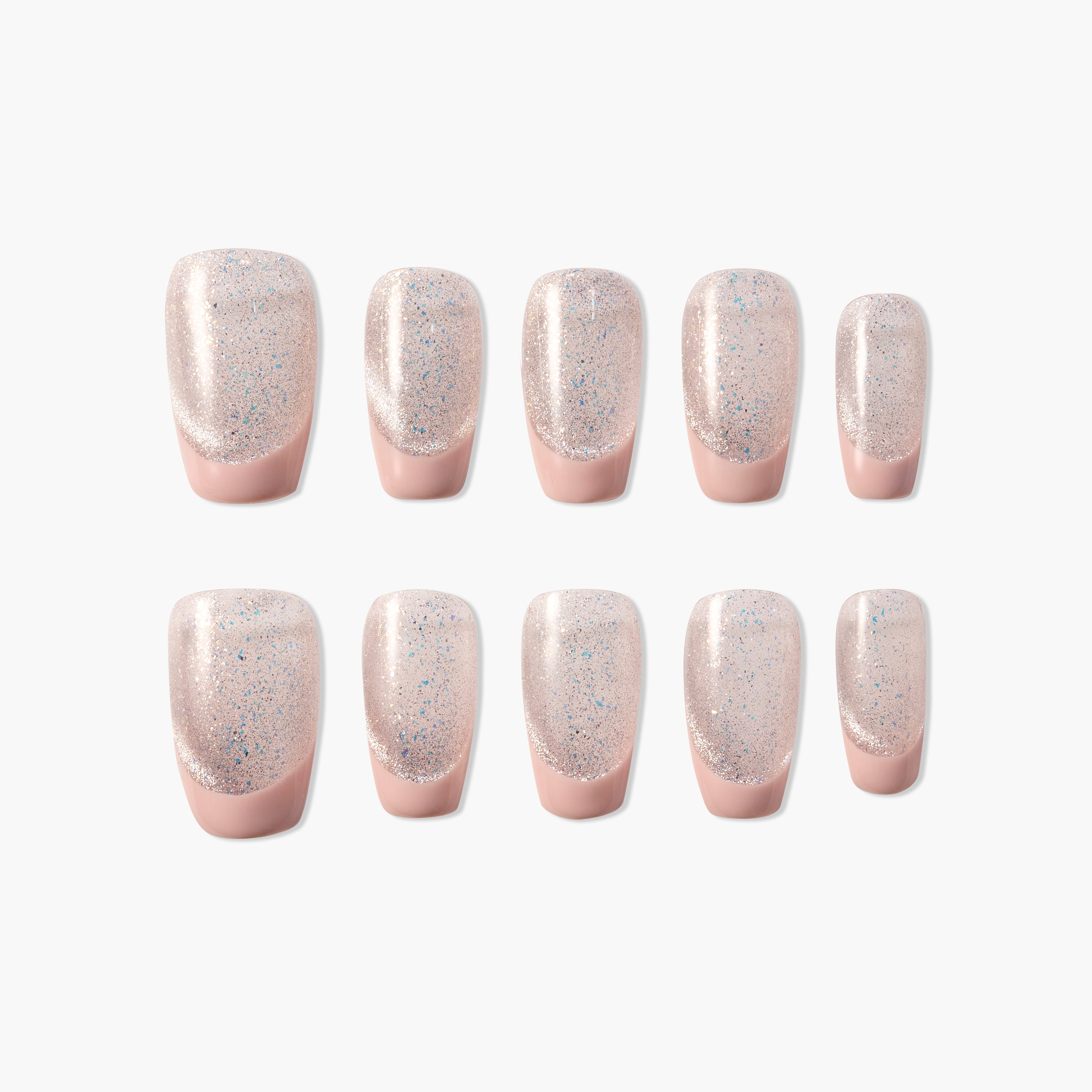 Sutil mas mágico — o "Fairy Dust Glow" da Emily apresenta uma base nude rosa beijada com glitter fino prateado e azul para um brilho suave e radiante. O design em gradiente suave confere às suas unhas uma elegância sem esforço que cintila sob qualquer luz. Perfeito para uso diário, festas ou para adicionar um pouco de magia ao seu dia.