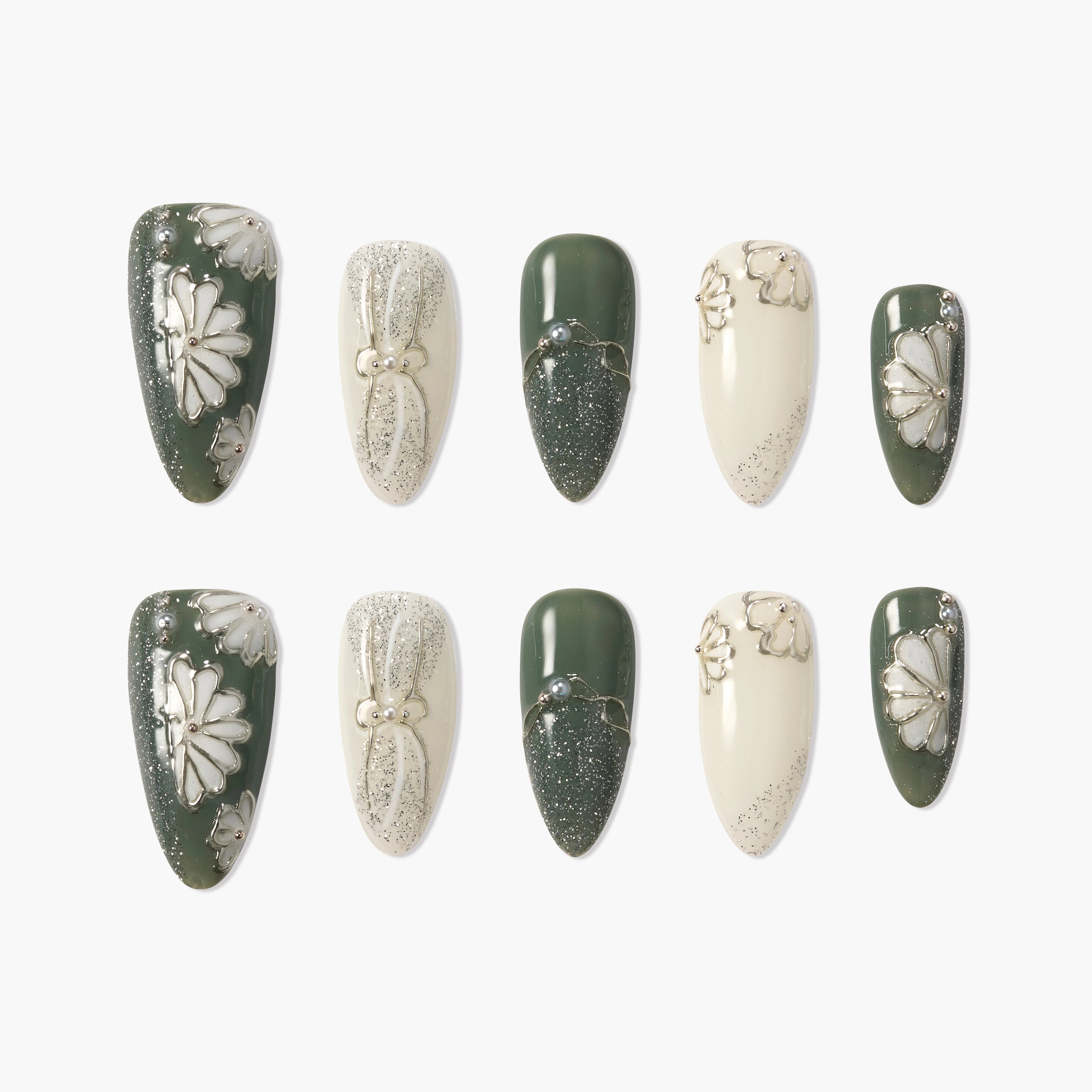 Forest Bloom Elegance combina verde floresta profundo e tons suaves de creme com contornos florais metálicos e detalhes subtis de brilho. Este conjunto artesanal cria uma estética chique e limpa inspirada na natureza. Leve e confortável, cada peça oferece um visual de qualidade de salão pronto em 10 minutos.