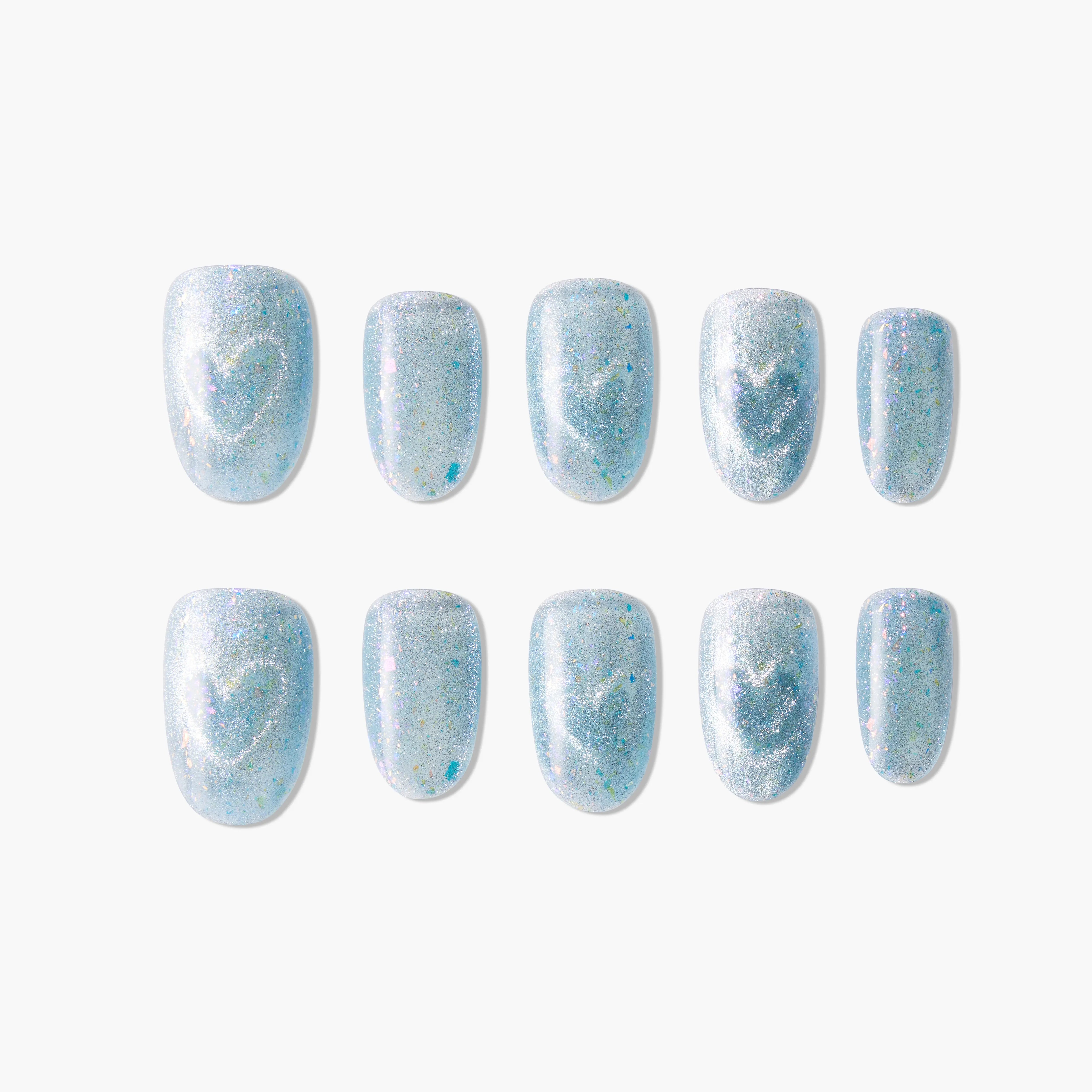 O Conjunto de Unhas Coração Esfumaçado apresenta uma base azul refrescante com glitter cintilante e padrões de corações, criando um efeito cristalino e gelado. Cada ponta dos dedos parece adornada com um toque de geada, irradiando um brilho sonhador, perfeito para qualquer ocasião quente e romântica.