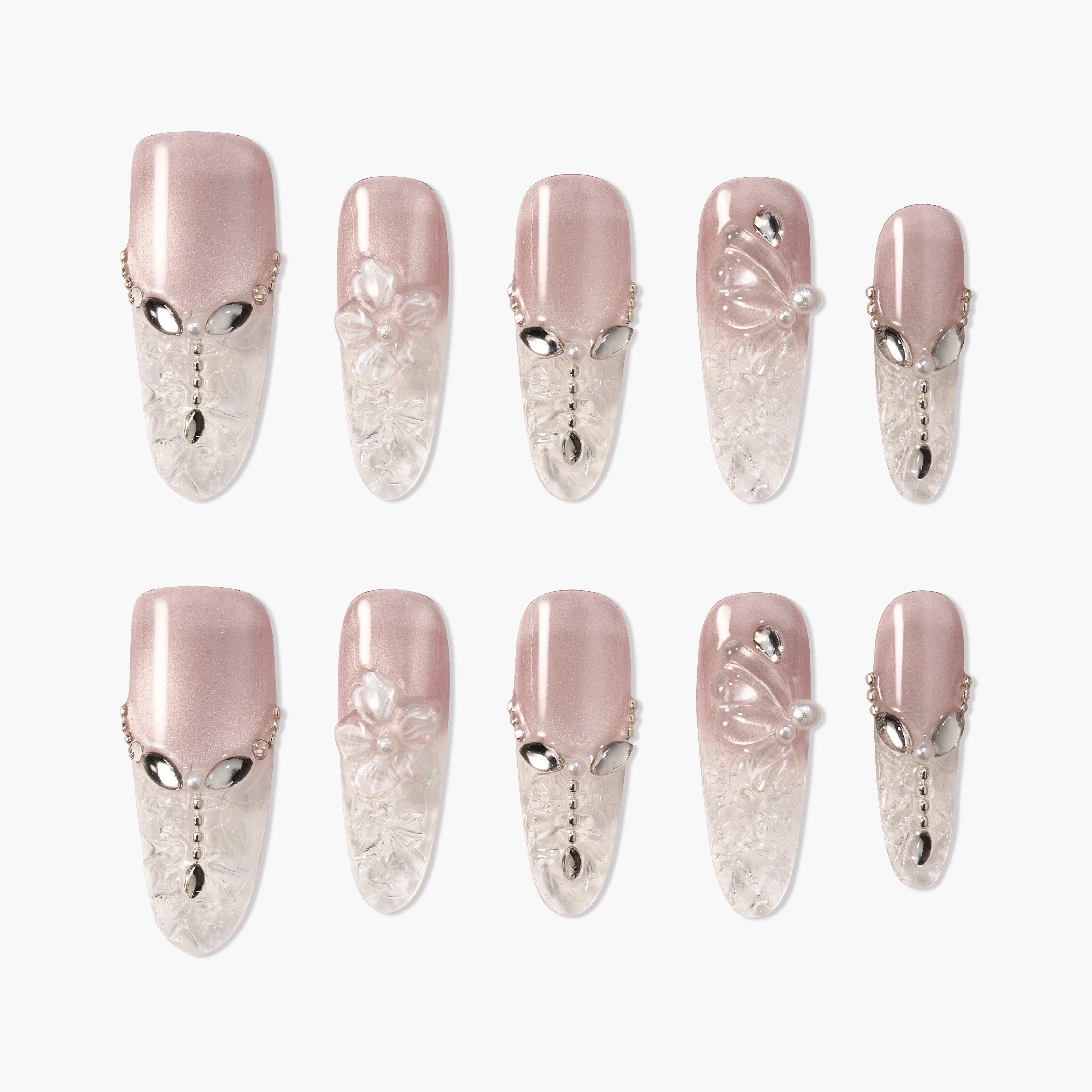 O Véu de Pétalas Nevadas combina um brilho rosado suave com texturas translúcidas esculpidas em gelo para um aspeto refinado e etéreo. Flores tridimensionais e entalhes em forma de asas de borboleta acrescentam elegância escultórica, enquanto os acentos metálicos prateados e pequenas pérolas introduzem um acabamento moderno, semelhante a joias. Uma mistura delicada de suavidade e clareza que transmite luxo e leveza.