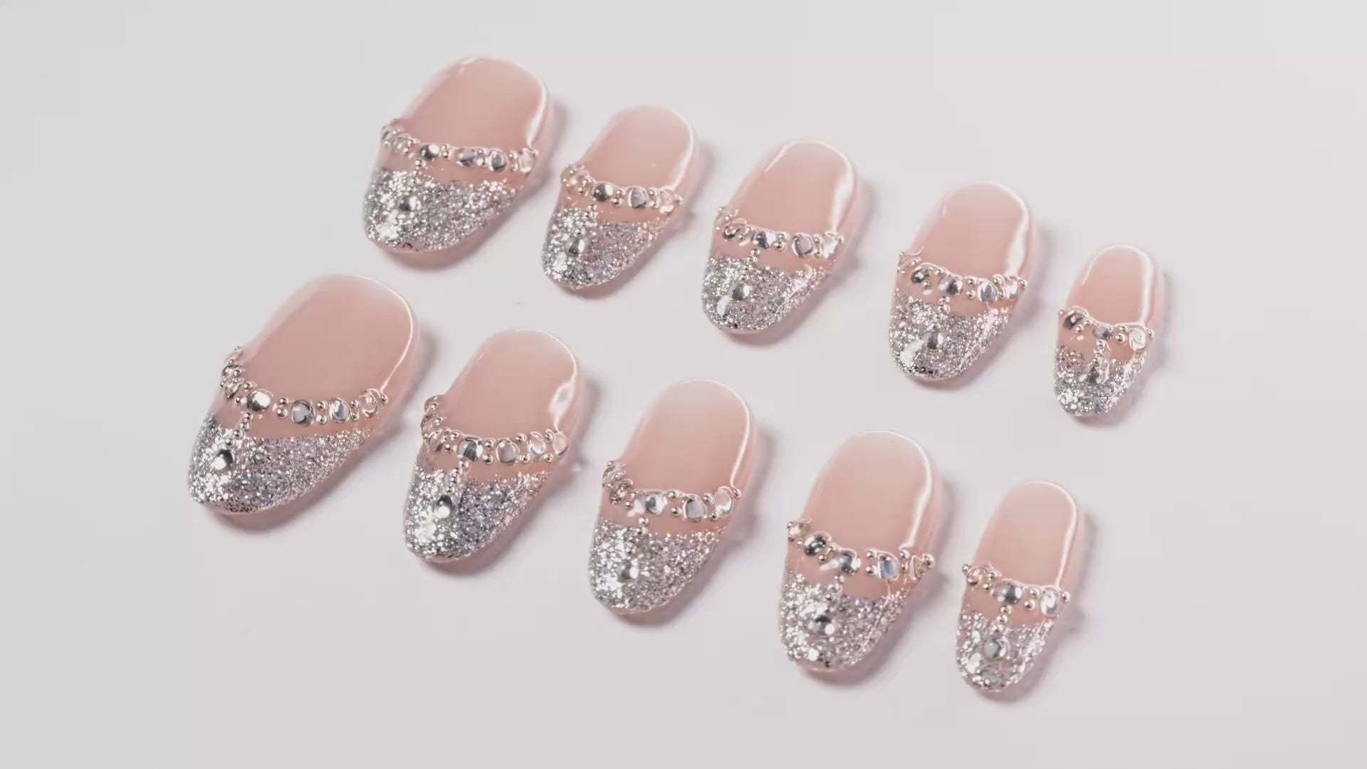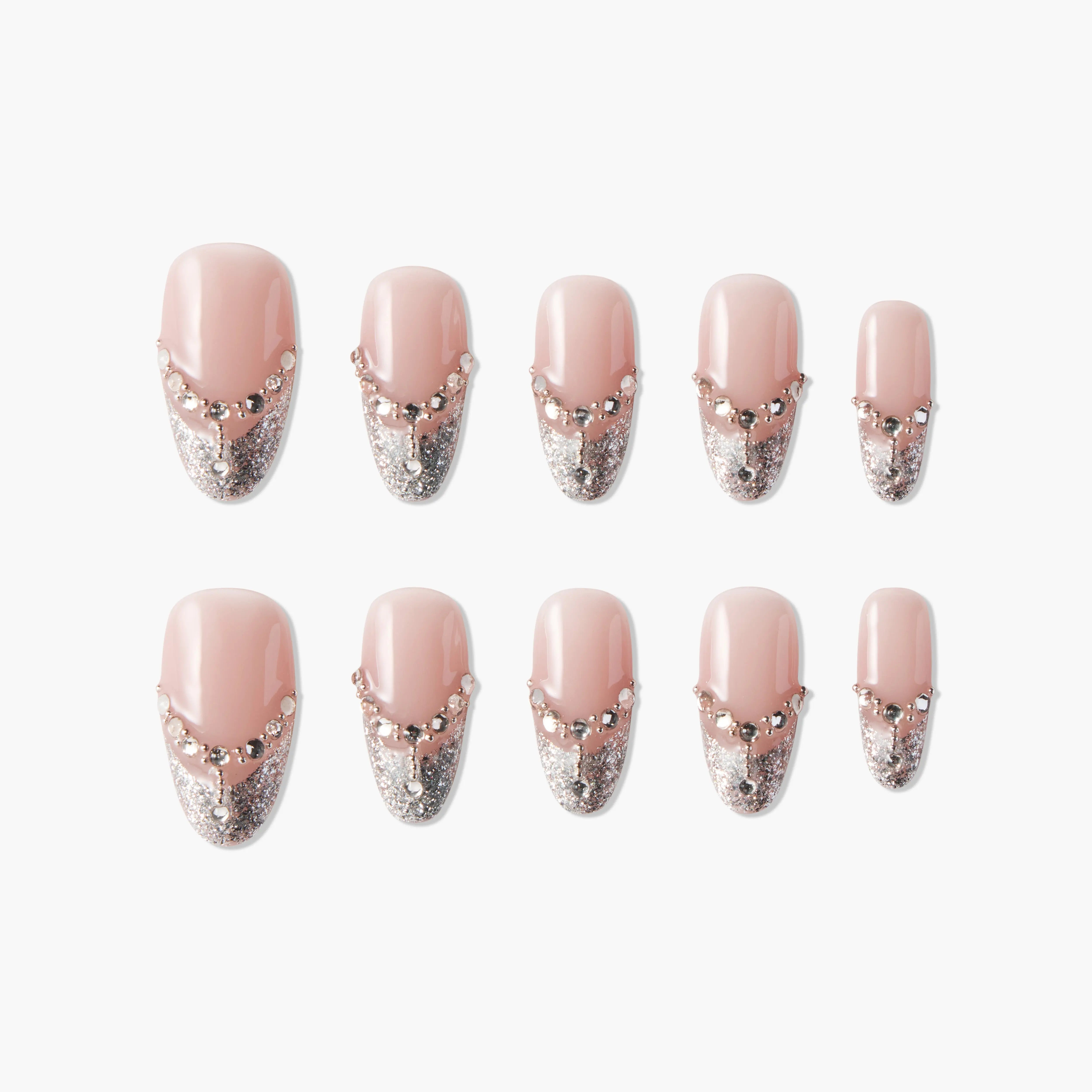 Elegância Cintilante apresenta uma base nude com pontas de glitter prateado cintilante, adornadas com delicados detalhes de cristal dispostos em um arco gracioso. Perfeito para adicionar um toque de sofisticação a qualquer ocasião.