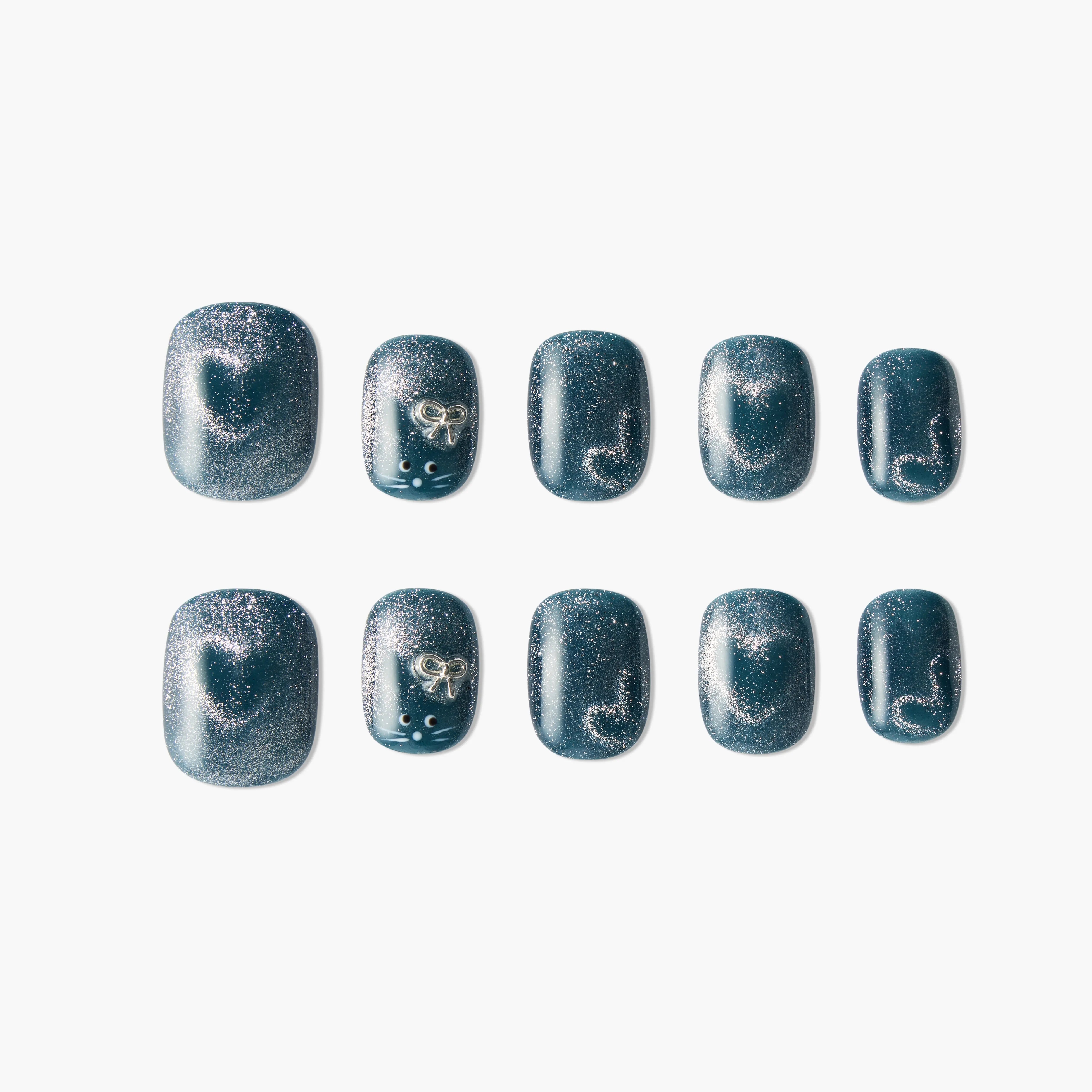 Estas unhas deslumbrantes de cor azul-petróleo apresentam um brilho cintilante com padrões subtis de corações. Decoradas com um adorável laço prateado e um desenho de rosto de gato, adicionam um toque divertido e elegante ao seu visual, tornando-as perfeitas para quem adora detalhes divertidos e elegantes.