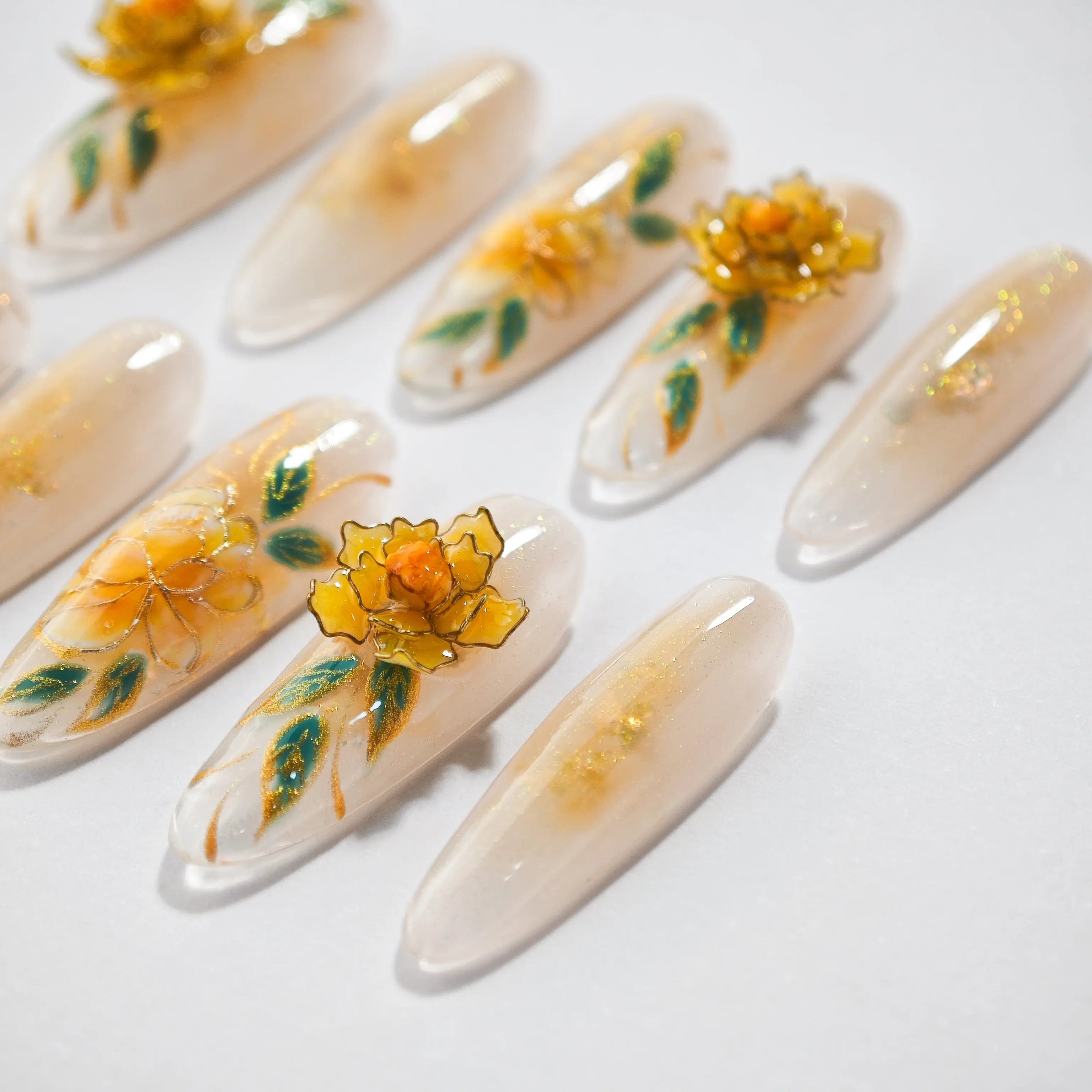 Descubra as unhas postiças Golden Blossom Elegance da Emily’s Nail, com delicadas flores amarelas e detalhes intrincados para um visual refinado e sofisticado.