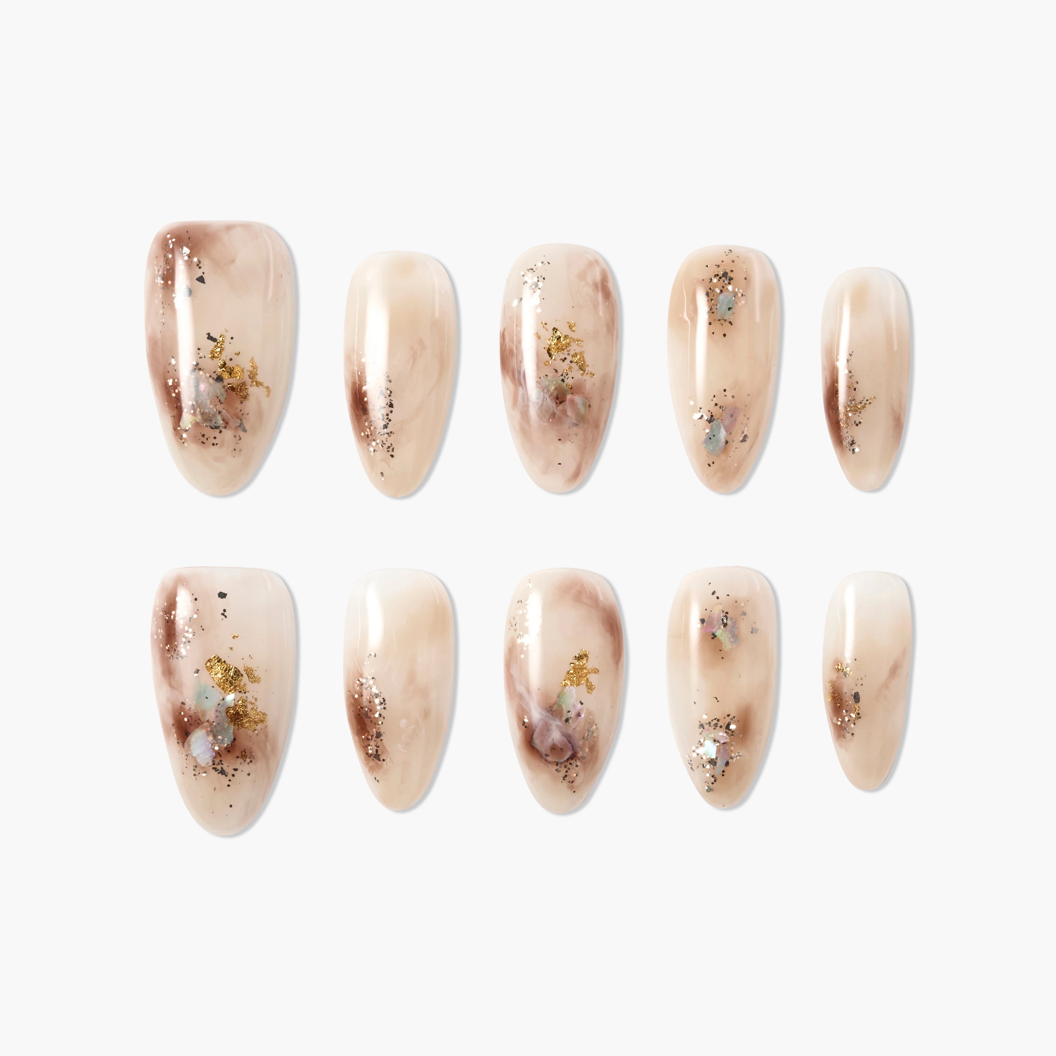 As unhas postiças artesanais Emily’s Golden Dawn apresentam uma base nude-rosa quente, adornada com folha de ouro, pó de prata e partículas coloridas delicadas, criando um aspeto suave e luxuoso como a primeira luz da alvorada. Cada peça é feita à mão para um ajuste seguro e reutilizável—perfeito para uso diário, férias e estilos de festa requintados.