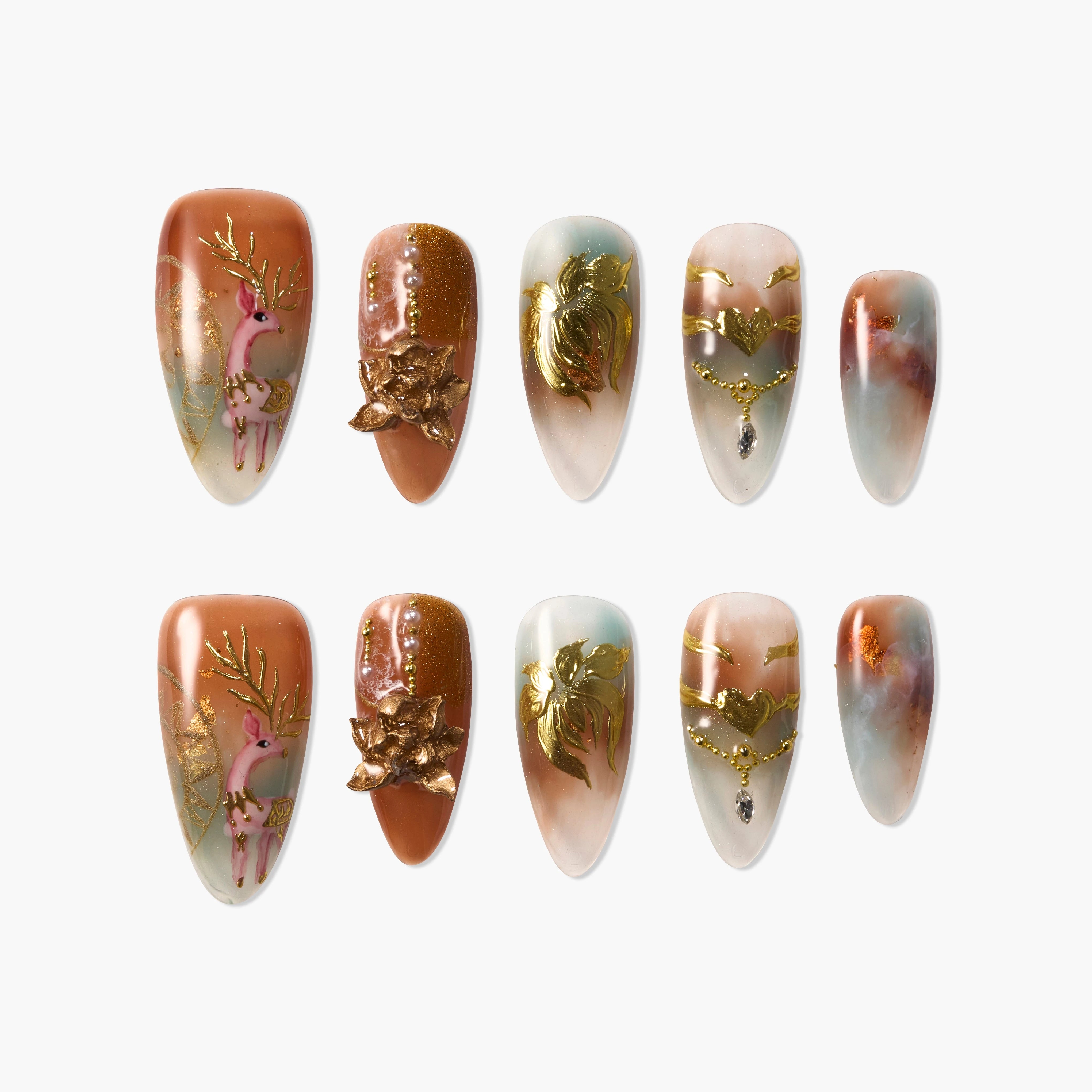 Entre no Golden Forest Deer, onde a elegância encontra a fantasia. Cada unha apresenta arte pintada à mão e detalhes escultóricos em ouro — desde galhadas cintilantes a flores delicadamente em relevo. Os tons quentes de âmbar misturam-se com azuis enevoados, evocando uma sensação de magia antiga e luxo. Perfeito para épocas festivas, amantes da arte e quem adora designs marcantes.