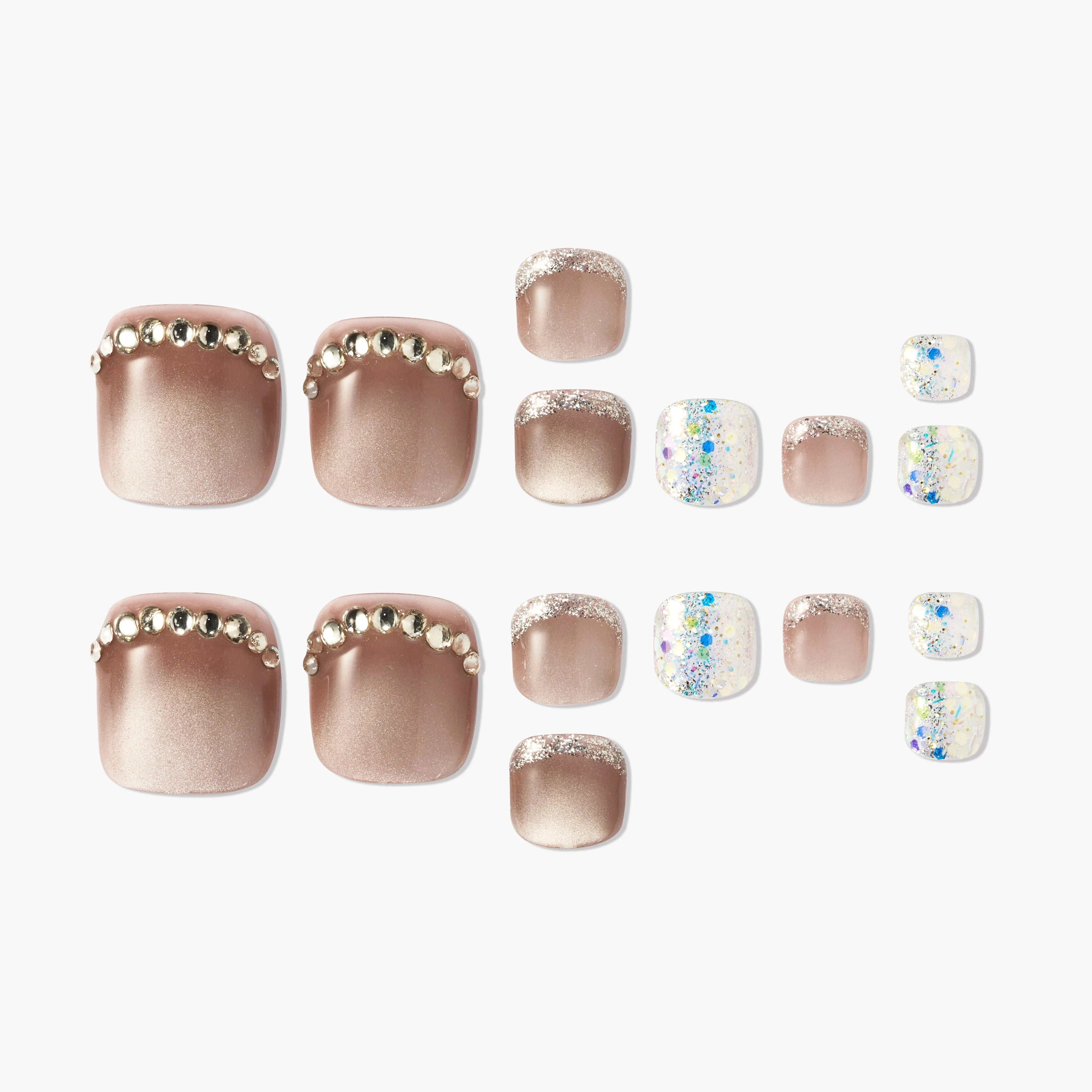 Brilhe com um glamour intemporal com o Golden Glow Toes da Emily. Apresentando uma base cintilante em dourado champanhe adornada com tachas de cristal e detalhes em glitter, este conjunto artesanal de unhas postiças para os pés combina elegância com um brilho moderno. Perfeito para casamentos, festas e looks diários chiques, estas unhas postiças reutilizáveis são fáceis de aplicar e mantêm-se deslumbrantes.