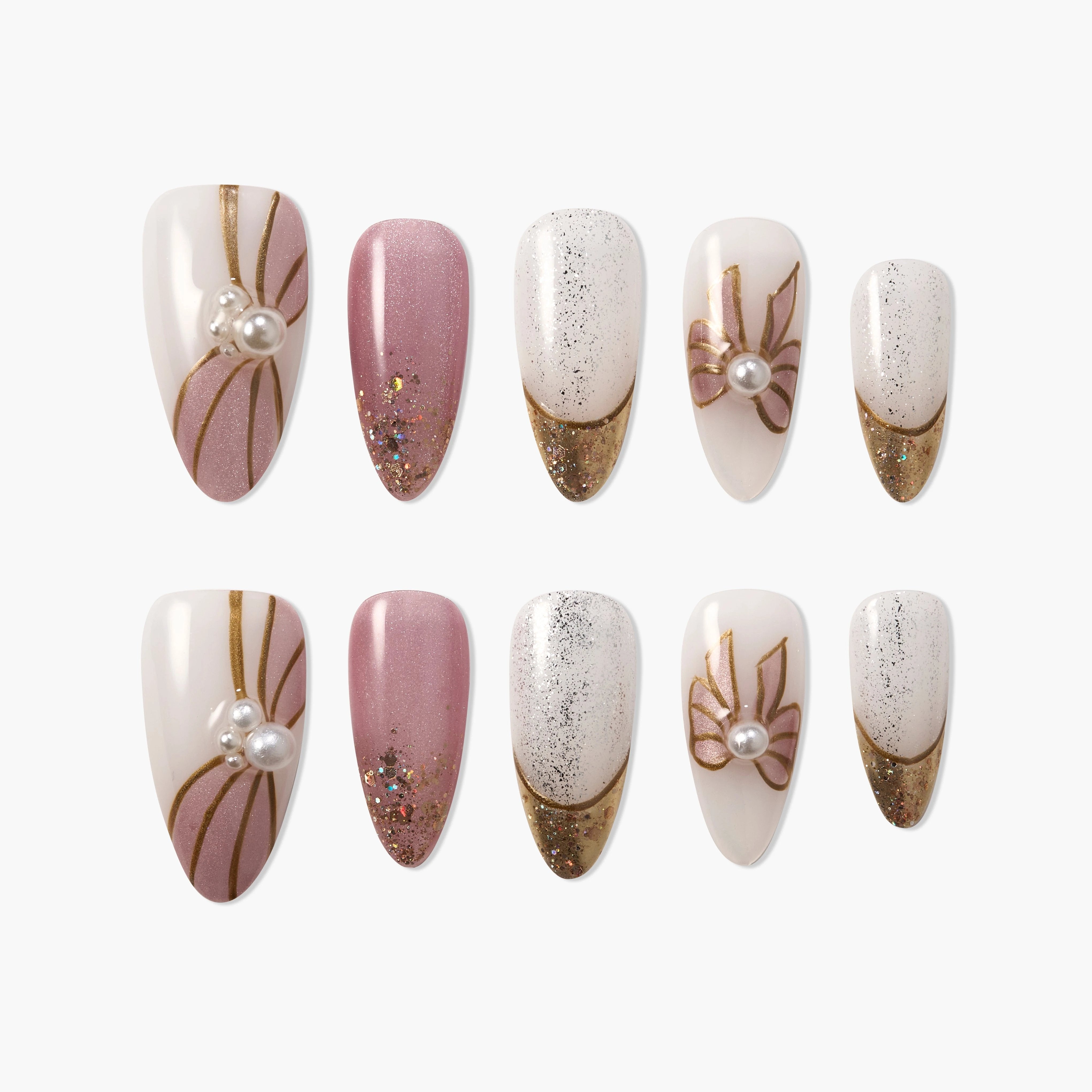 Golden Ribbon combina luxo vintage e charme feminino — apresentando tons suaves de nude e rosa, pontas delineadas a ouro e adornos de pérolas. Um design intemporal que transmite uma sensação festiva e refinada.