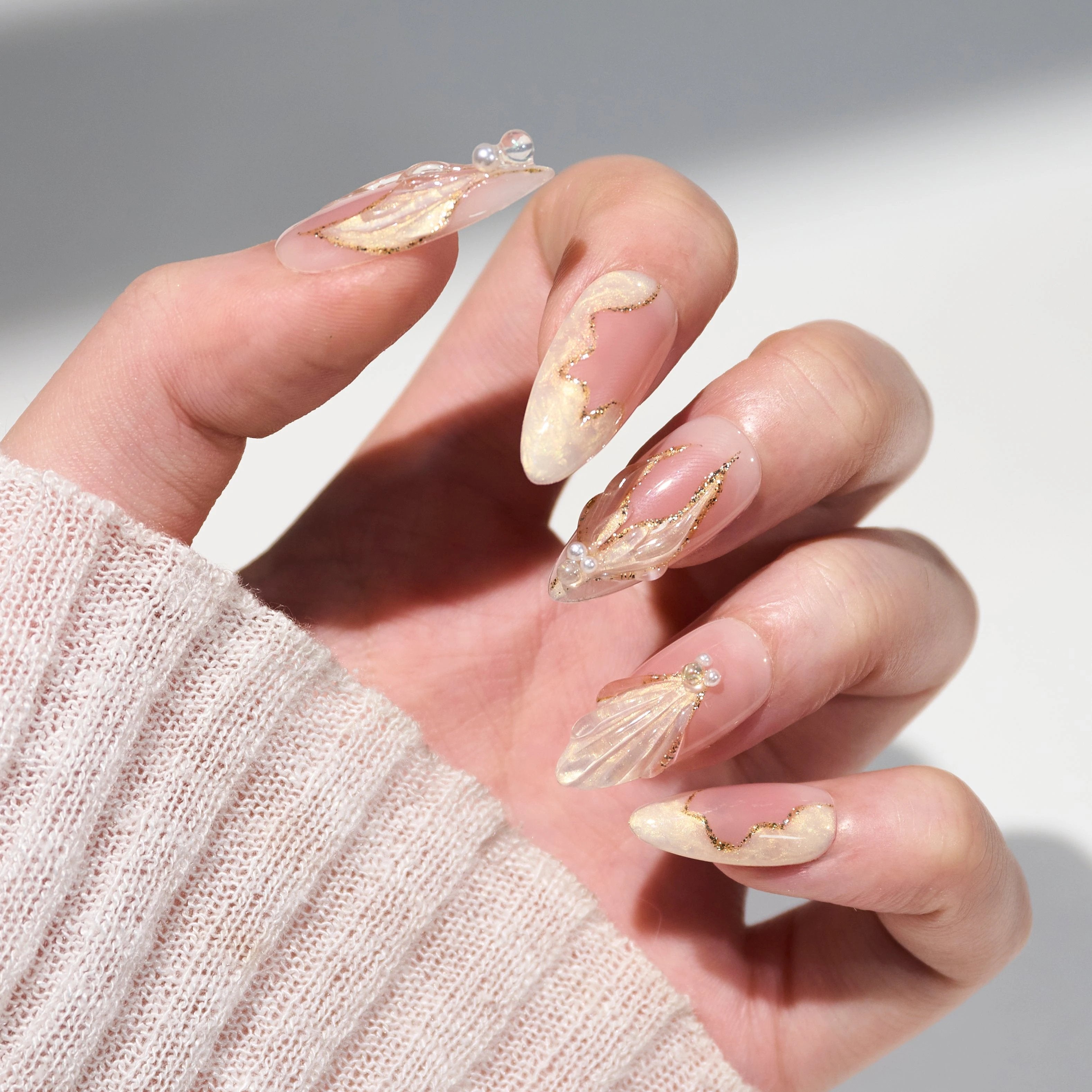 Inspirado pela beleza serena dos tesouros do oceano, Golden Shell Muse combina tons suaves de nude-rosa com conchas esculpidas com bordas douradas e pérolas luminosas. Cada curva brilha com luz, ecoando a elegância da espuma do mar e do sol na areia. Uma obra-prima etérea para quem ama o luxo discreto.