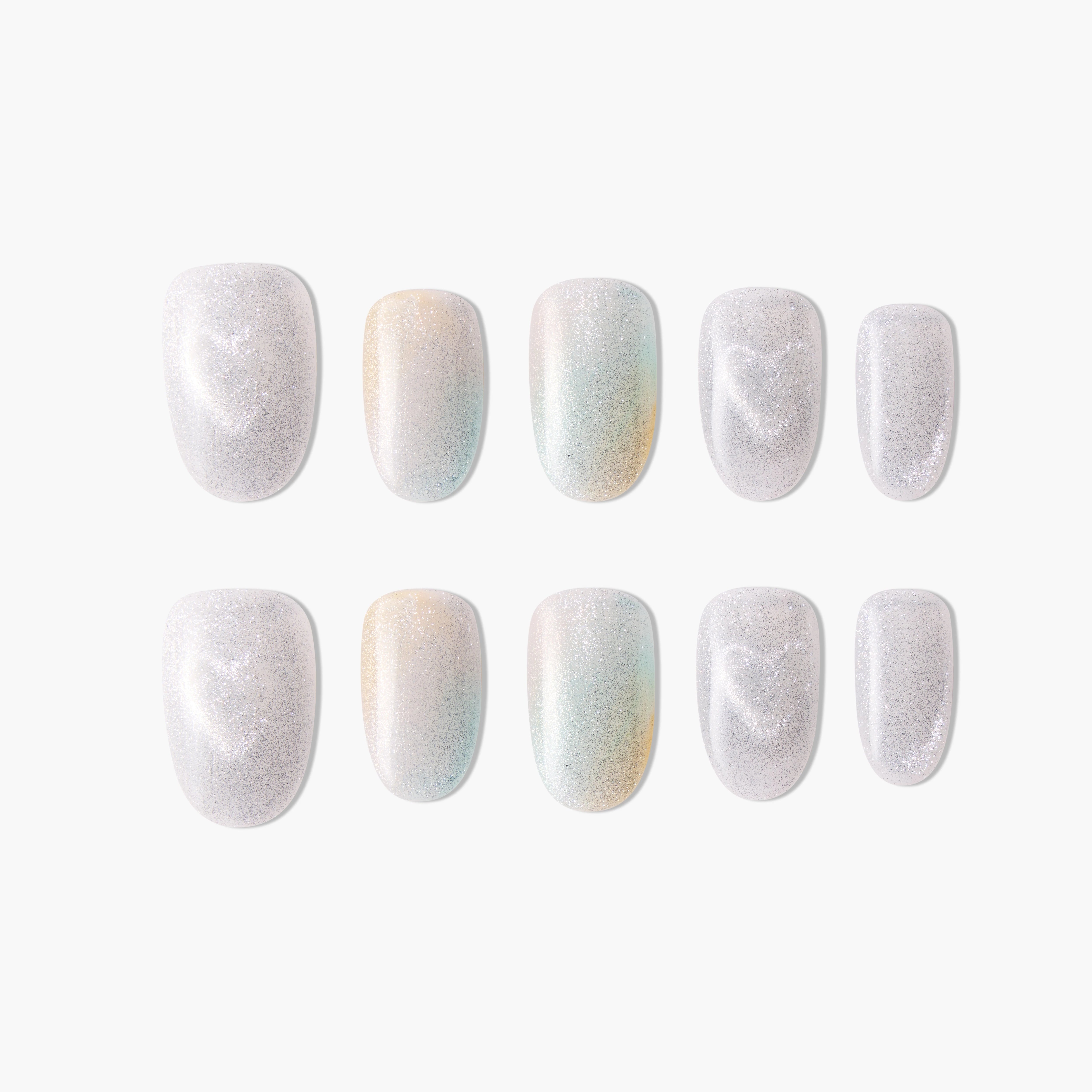 "Heartfelt Moments" é um conjunto de unhas postiças de aplicar, com tons suaves em degradé, glitter prateado e delicados desenhos de corações para criar uma atmosfera romântica e elegante. O degradé vai do prateado a suaves tons de azul e verde, trazendo uma sensação fresca às pontas dos seus dedos. Perfeito para qualquer ocasião, este conjunto realça as suas mãos com um charme radiante, cheio de romance e calor.