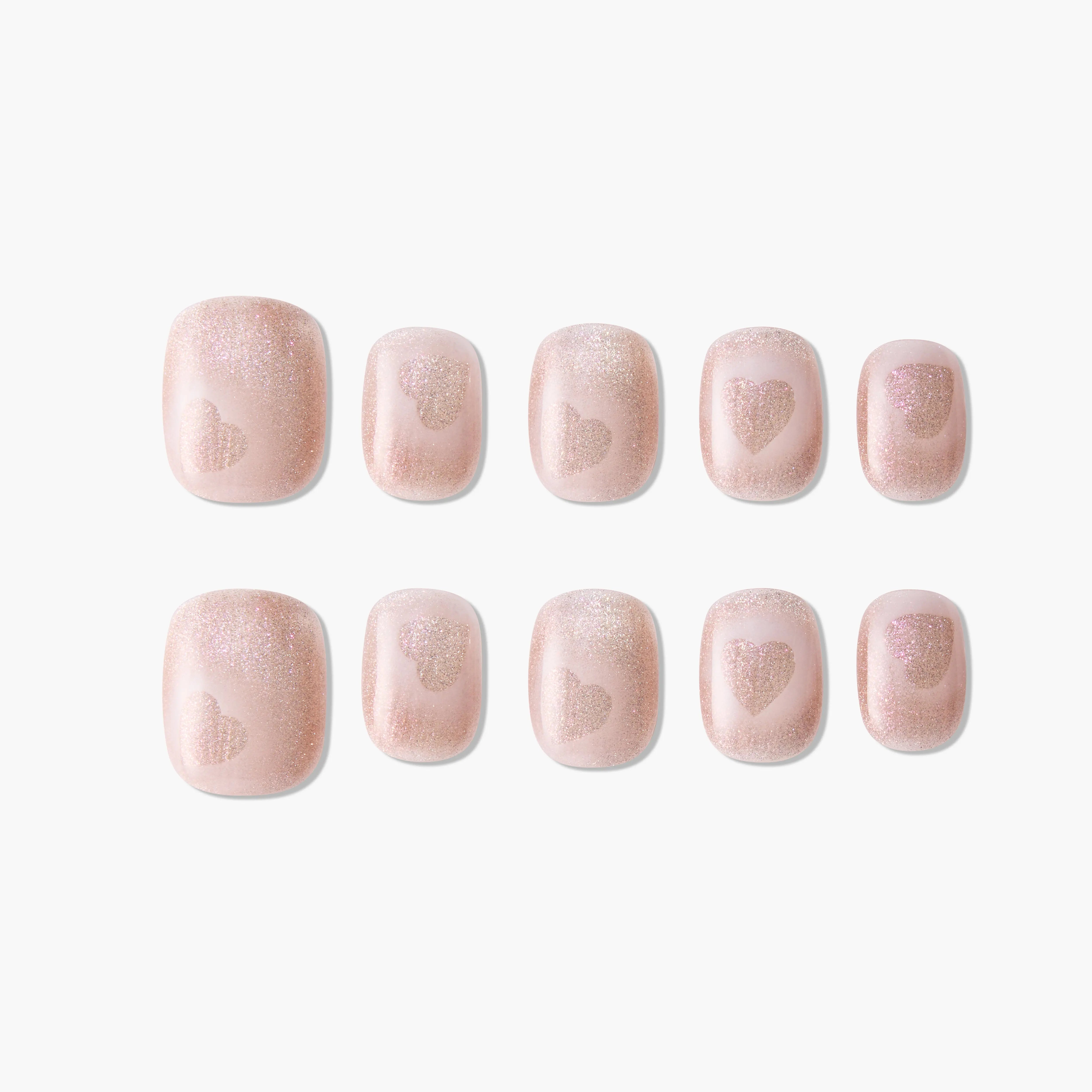 Experimente o romance com o nosso design de unhas "Brilho Rosa Sentimental". Delicados brilhos dourados e suaves padrões em forma de coração criam uma aura sonhadora e suave. Perfeito para o uso diário, é simples mas doce.