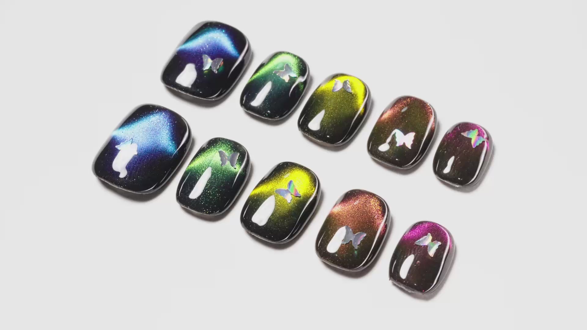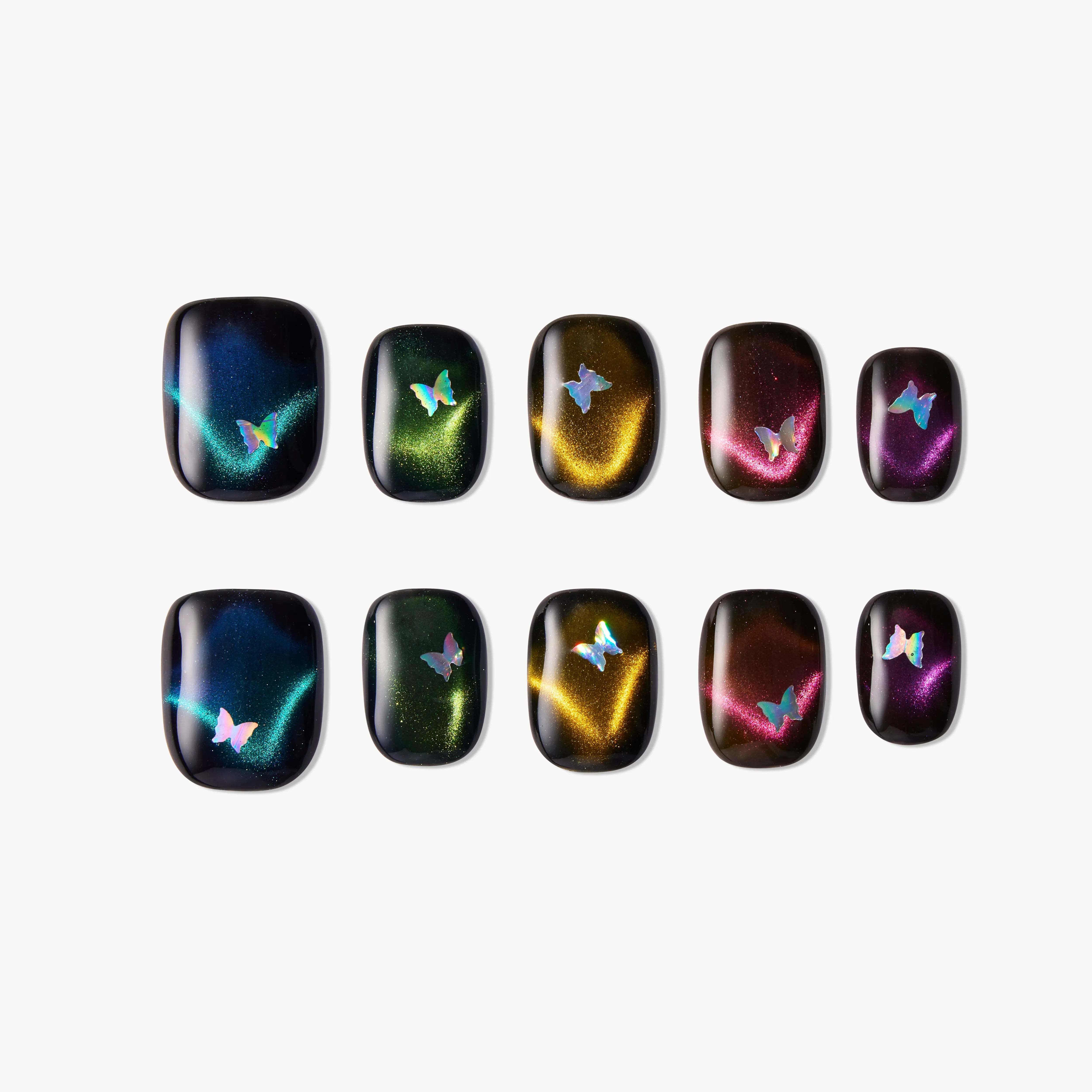 O Conjunto de Unhas Borboleta Iridescente apresenta uma base preta profunda com padrões de borboletas em gradiente colorido e um brilho estrelado, criando uma beleza onírica. As borboletas em cada ponta dos dedos parecem dançar na noite, exibindo um brilho e charme únicos, perfeito para qualquer ocasião misteriosa e audaciosa.