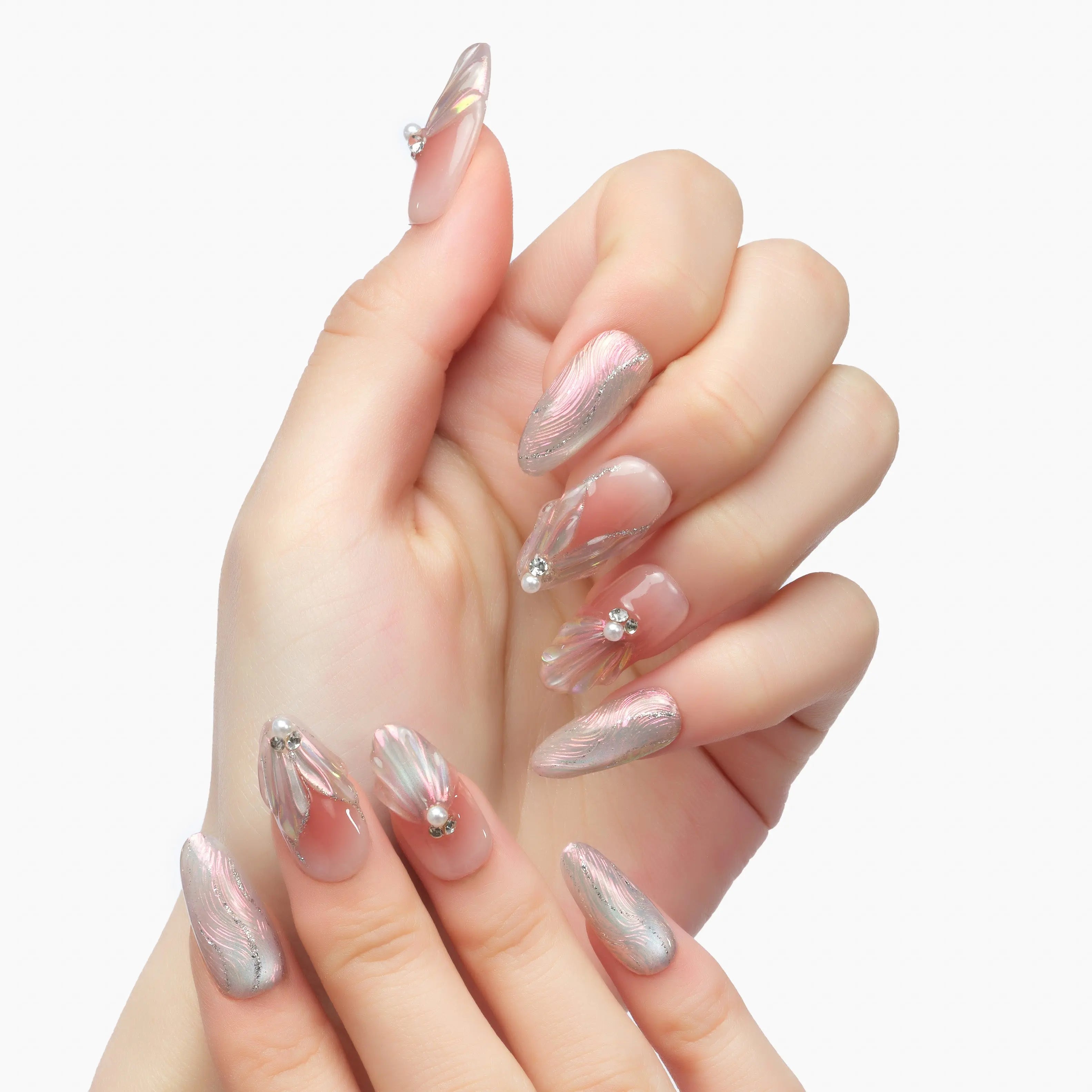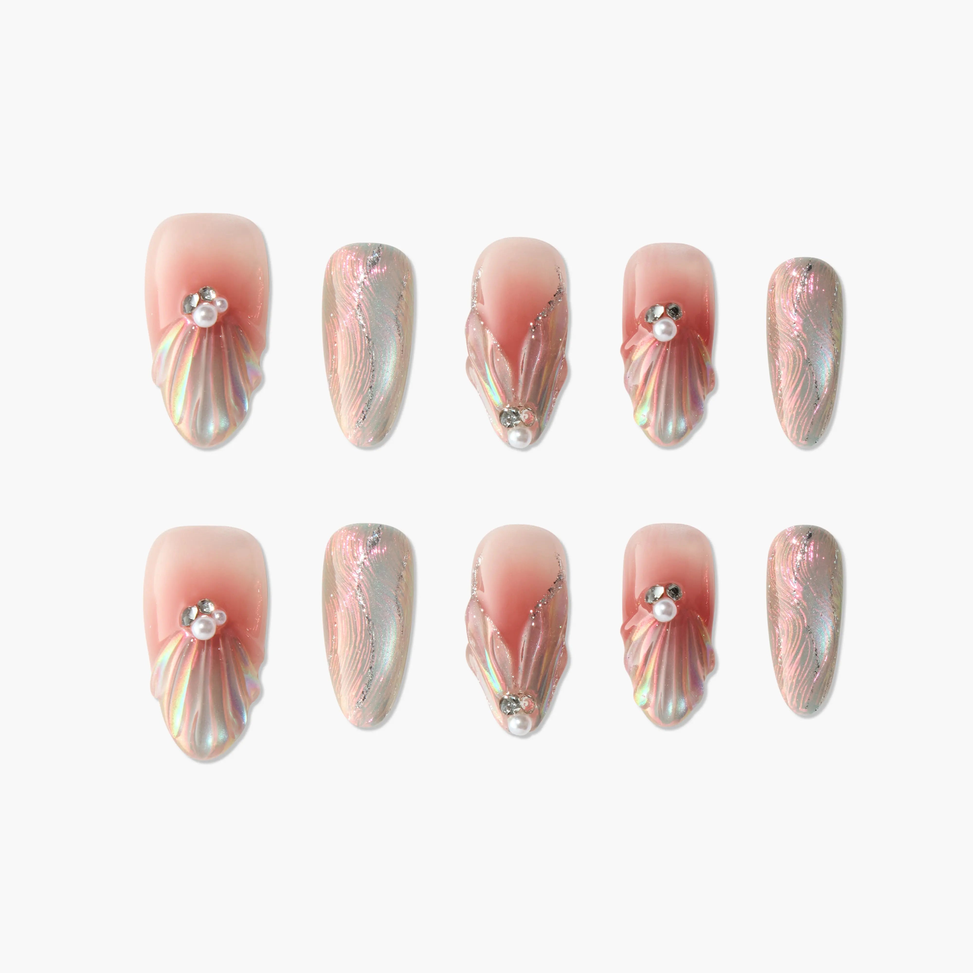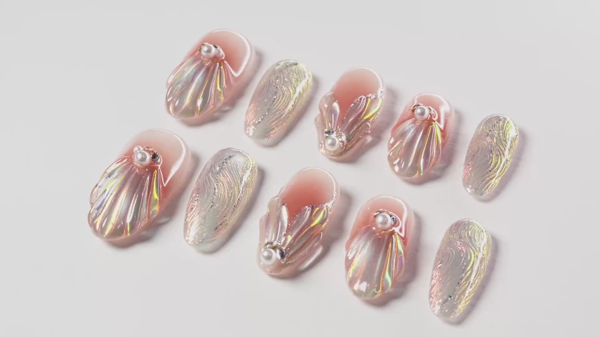 Adicione um toque de luxo inspirado no oceano às suas unhas! As unhas Iridescent Shell Glow apresentam desenhos cintilantes de conchas e detalhes em cristal que evocam a beleza do mar. Perfeitas para casamentos, festas ou qualquer evento, estas unhas farão os seus dedos destacarem-se.